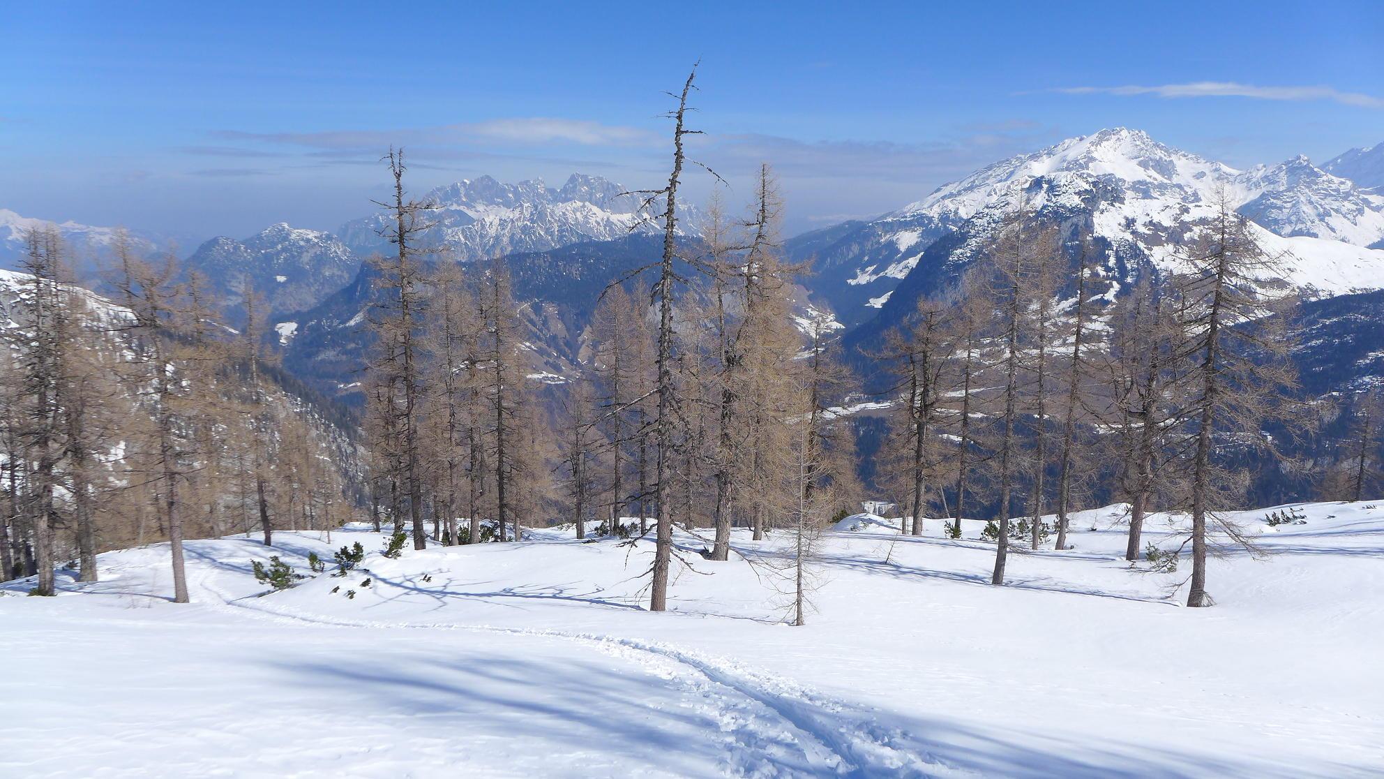 Nach den erstem steilen schattigen Nordhang wählten wir den Aufstieg rechts in der Sonne. Da war zwar Spurarbeit angesagt, aber dafür war es nicht so saukalt wie in den Schattenhängen des Kuchelhorns.