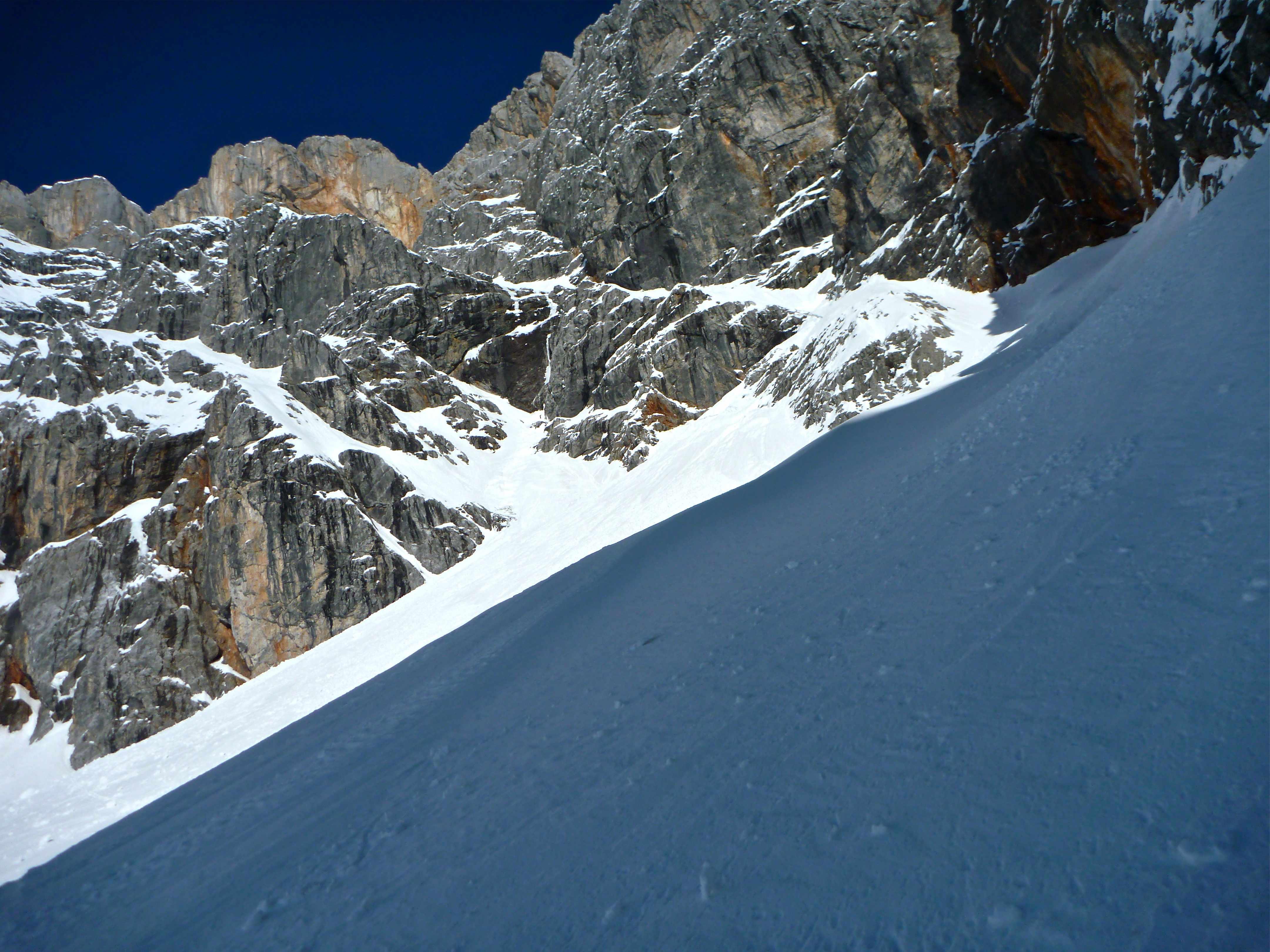 Bedingungen: in der Nachmittagssonne weich aber nicht tief, im Schatten der Wände noch feinster Pulver, ebenso am besagten Nordhang