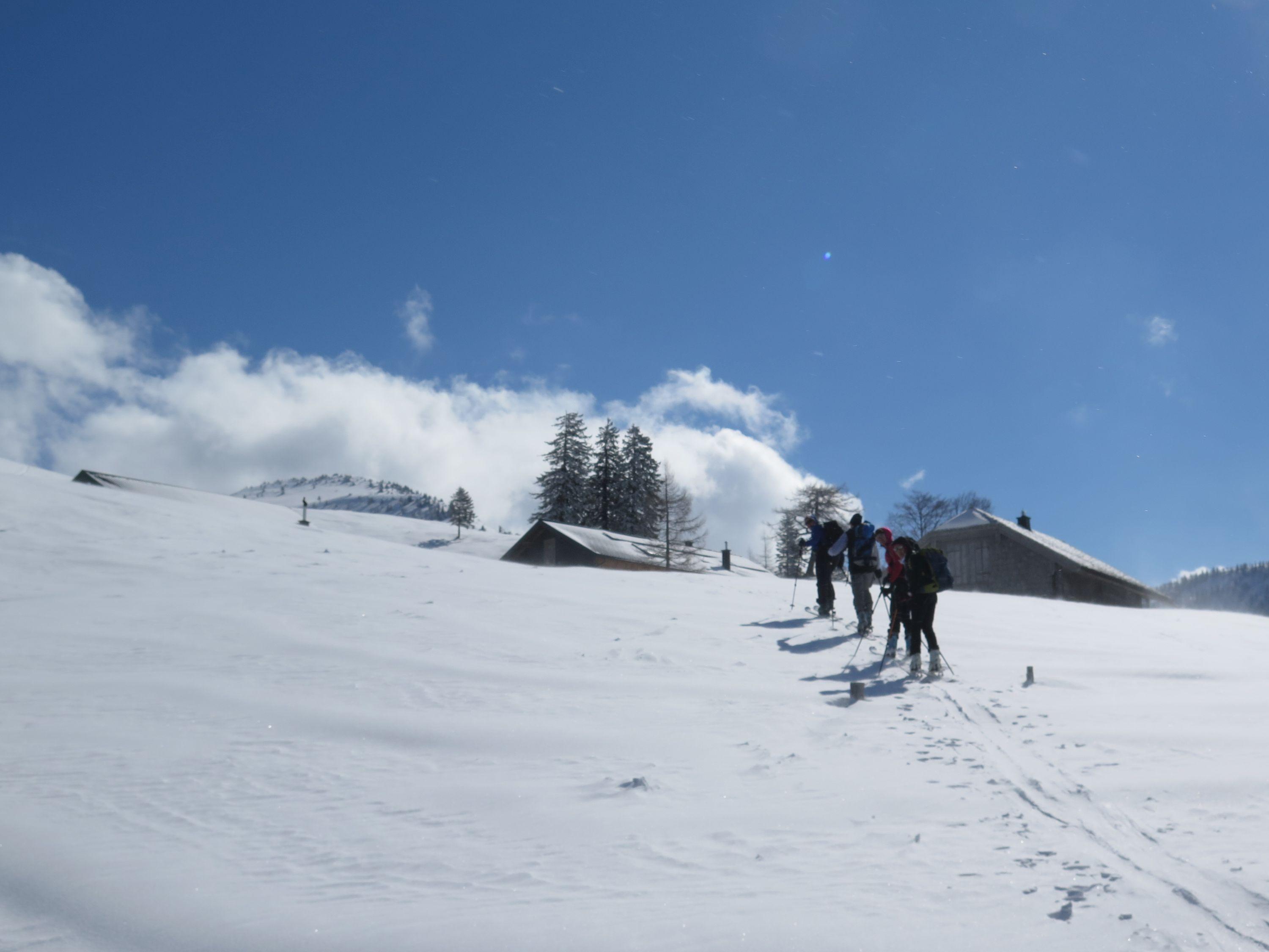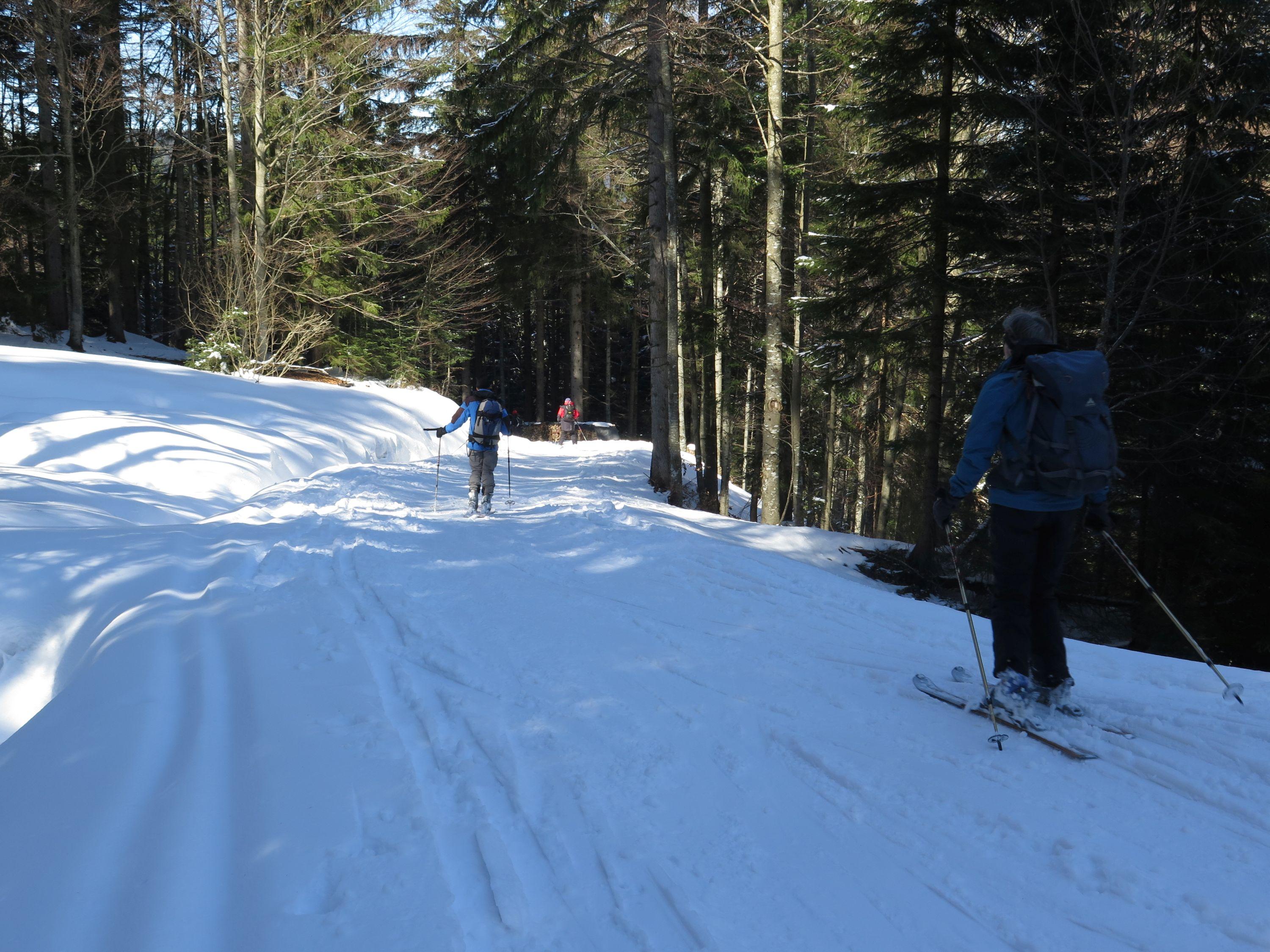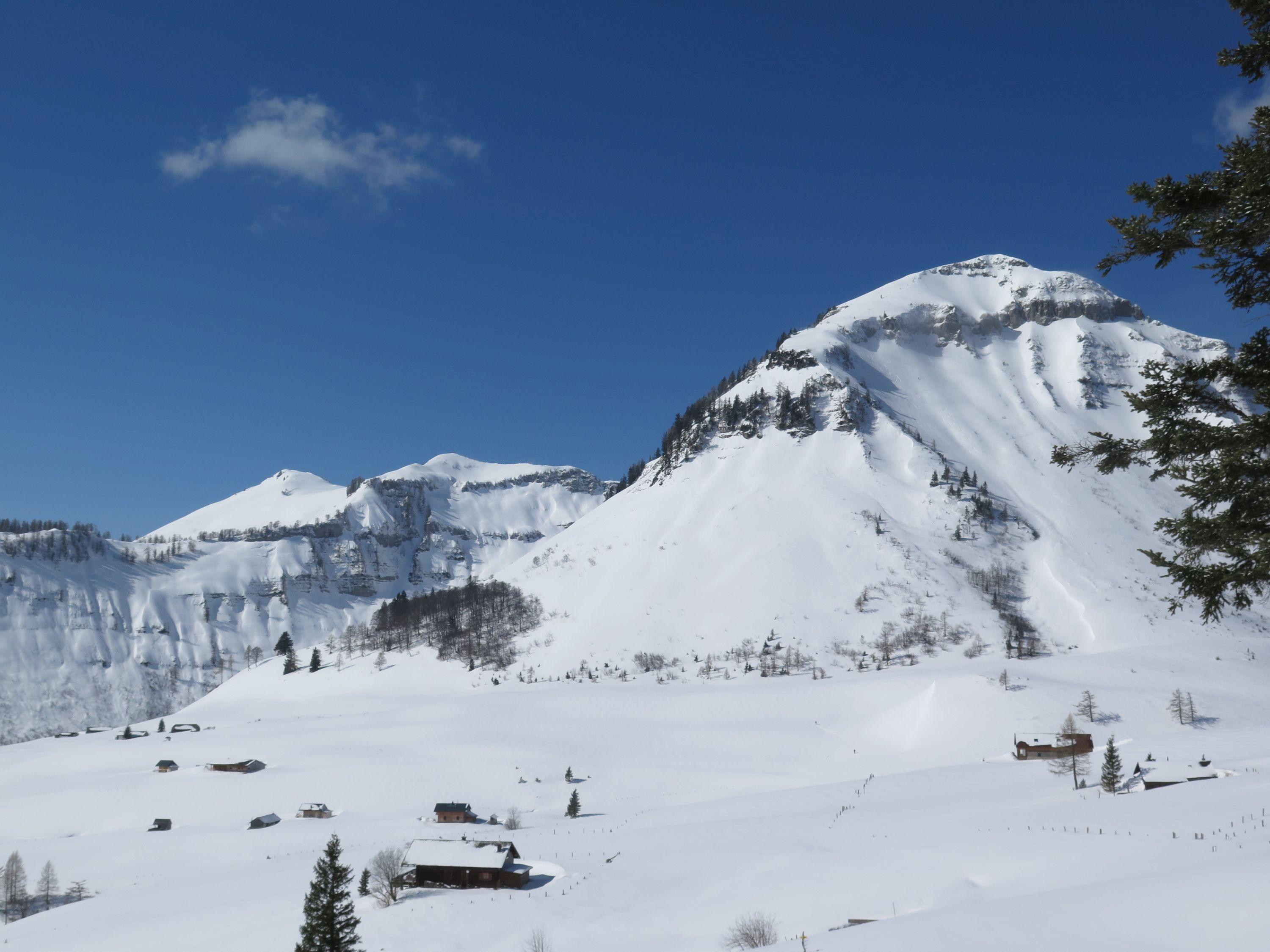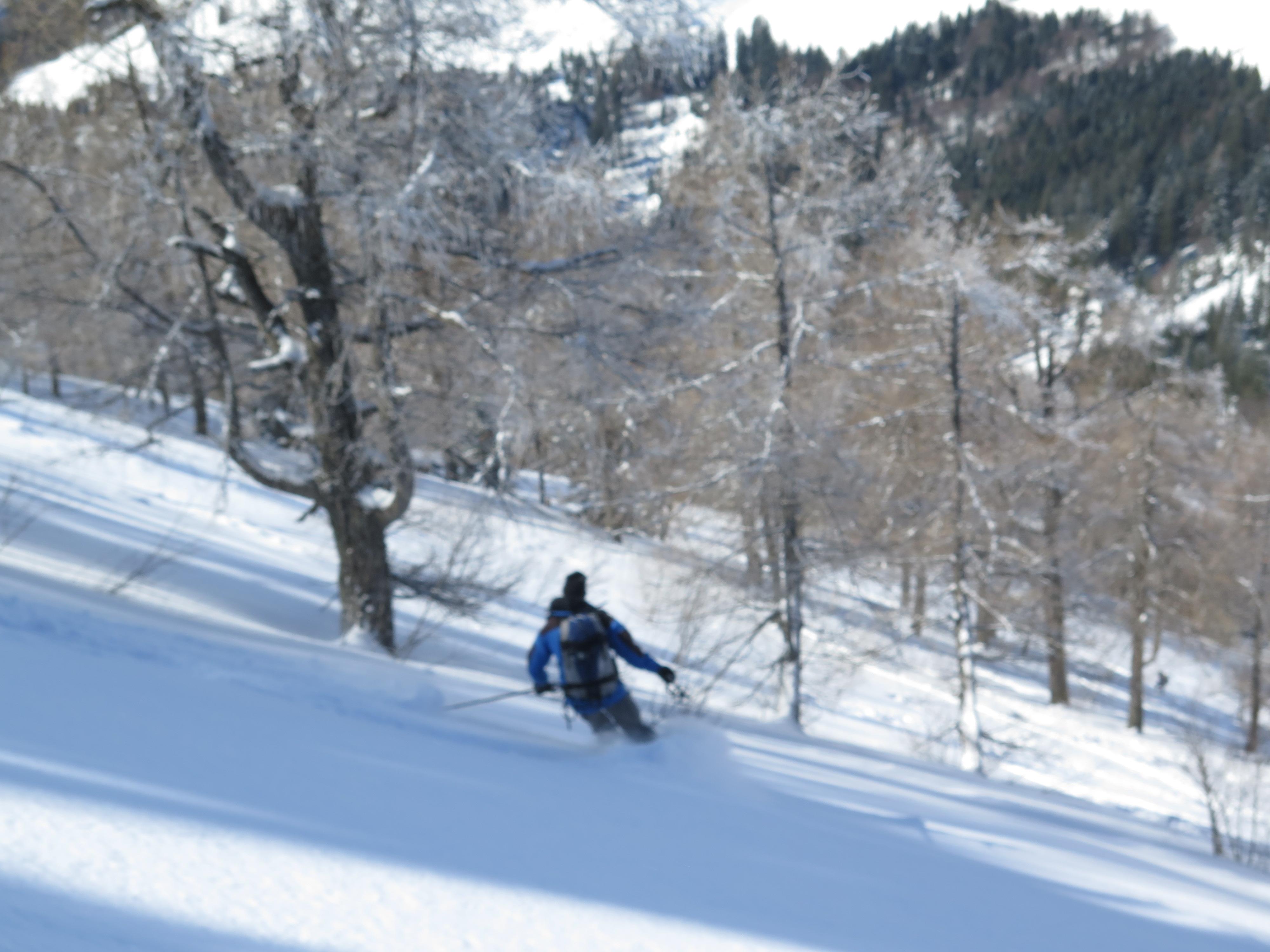 Auf der Strasse zu den Genneralmen ca. 5 cm Neuschnee, im Gipfel bereich bis 20cm. Im Gipfelbereich starke Böen, trotzdem waren die freien Flächen nicht allzusehr windgepreßt. Im Waldgürtel gefestigte Unterlage und 50 cm Traumpulver. Die Strasse bis Lämmerbach seidenweich zu fahren- eine kurze apere Stelle..