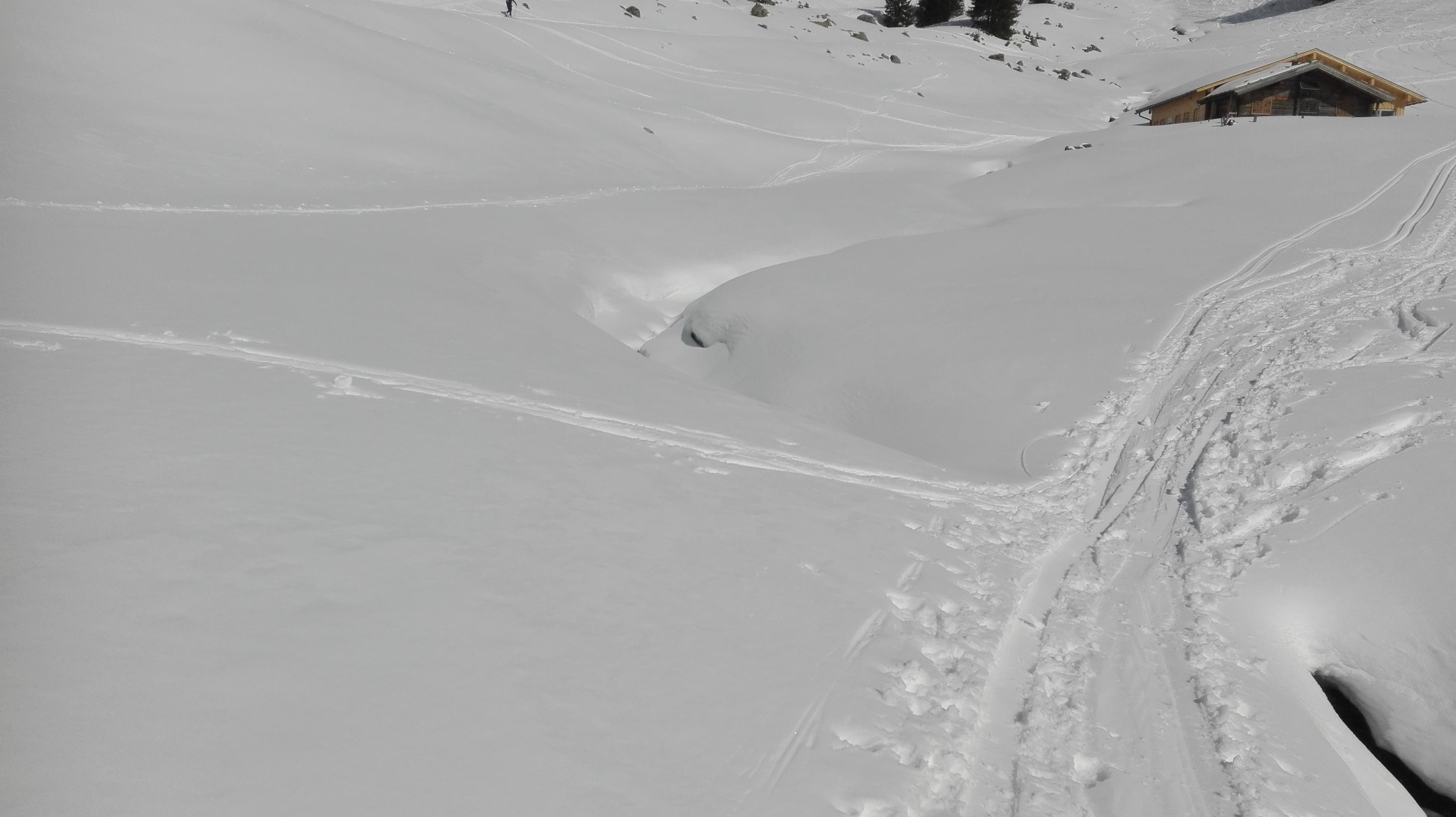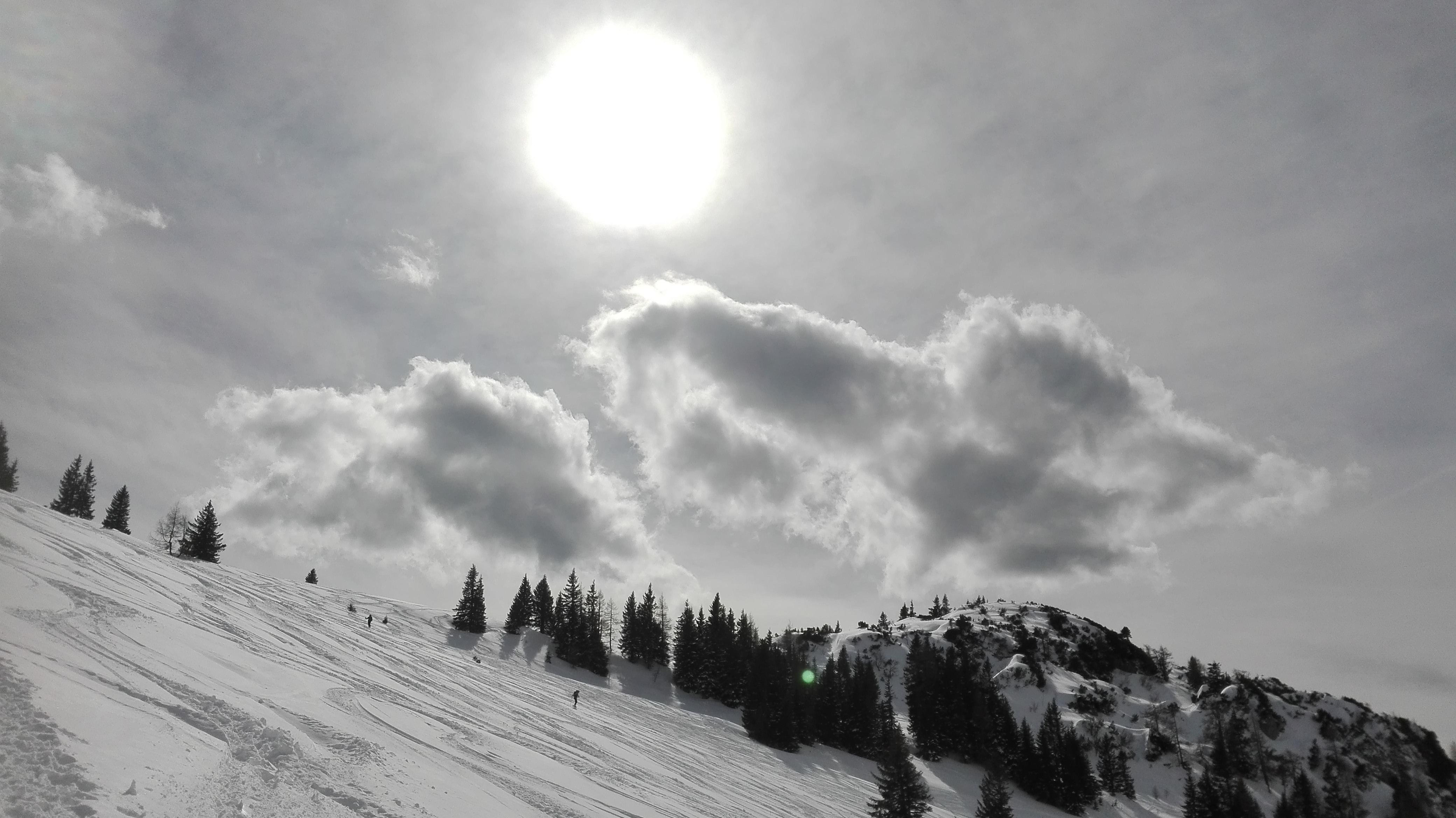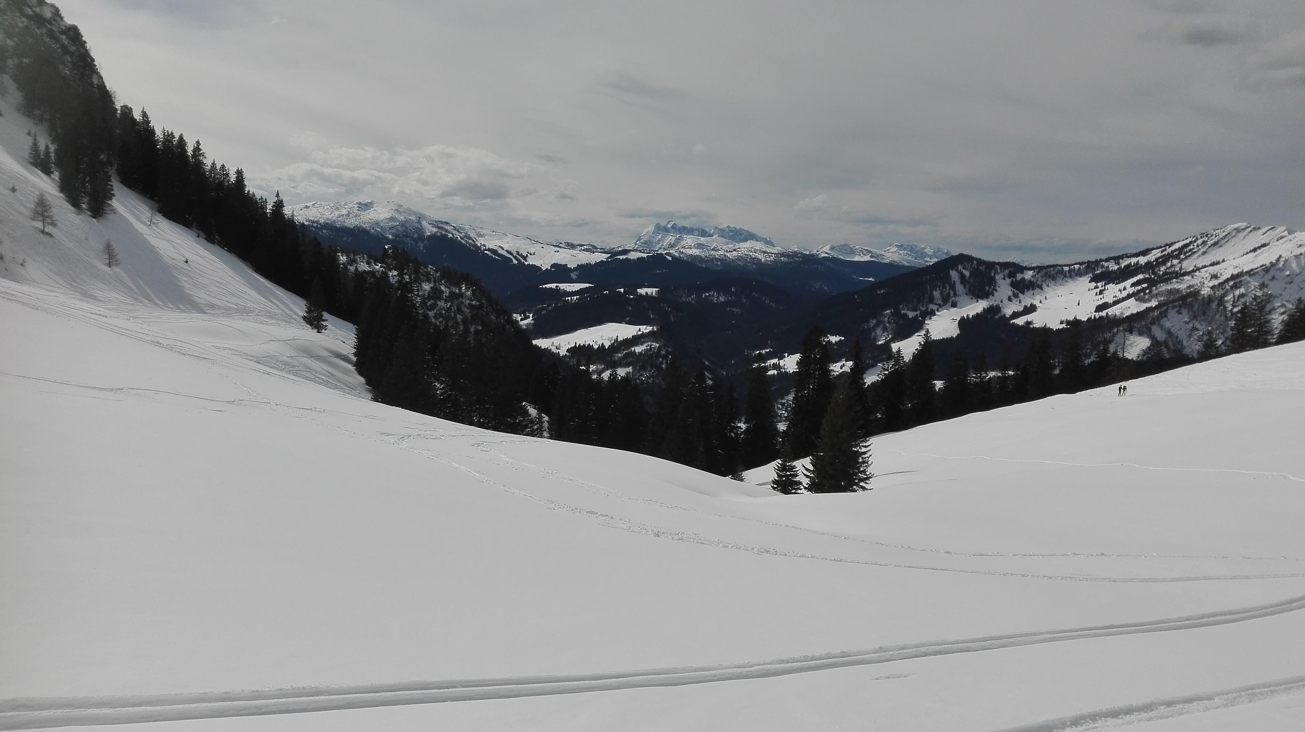 War ziemlich viel los an dem Samstag auch mehrere Gruppen pfeifen durchs Gelände. Trotzdem noch ausreichend Platz für eigene Spuren und sogar noch ein wenig Pulver gefunden. Schneedecke am Gipfel über den Latschen nicht sehr stabil zu Fuß, bin zweimal eingebrochen. Am Gipfel eher Bruchharsch der abwärts zu Pulver wird. Teilstrecke zur Hochalm runter, sehr zerfahren und etwas schwererer Schnee, geht aber noch gut.