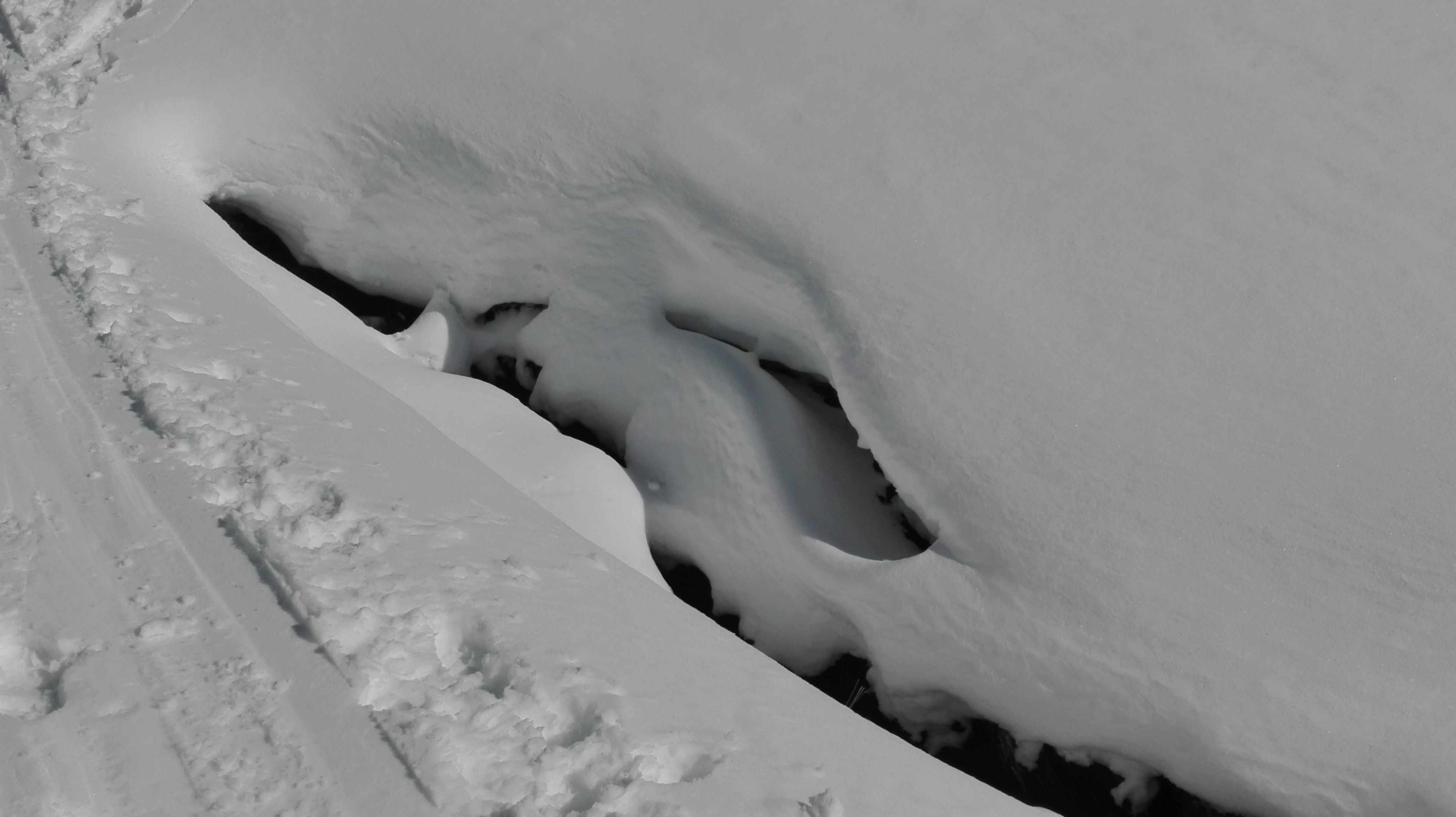 Dem Bach aufwärts folgend, kommt ein kurzes Stück wo sich der Schnee verabschiedet hat....ca. 50 m zum Tragen, danach wieder ausreichend Schnee vorhanden.