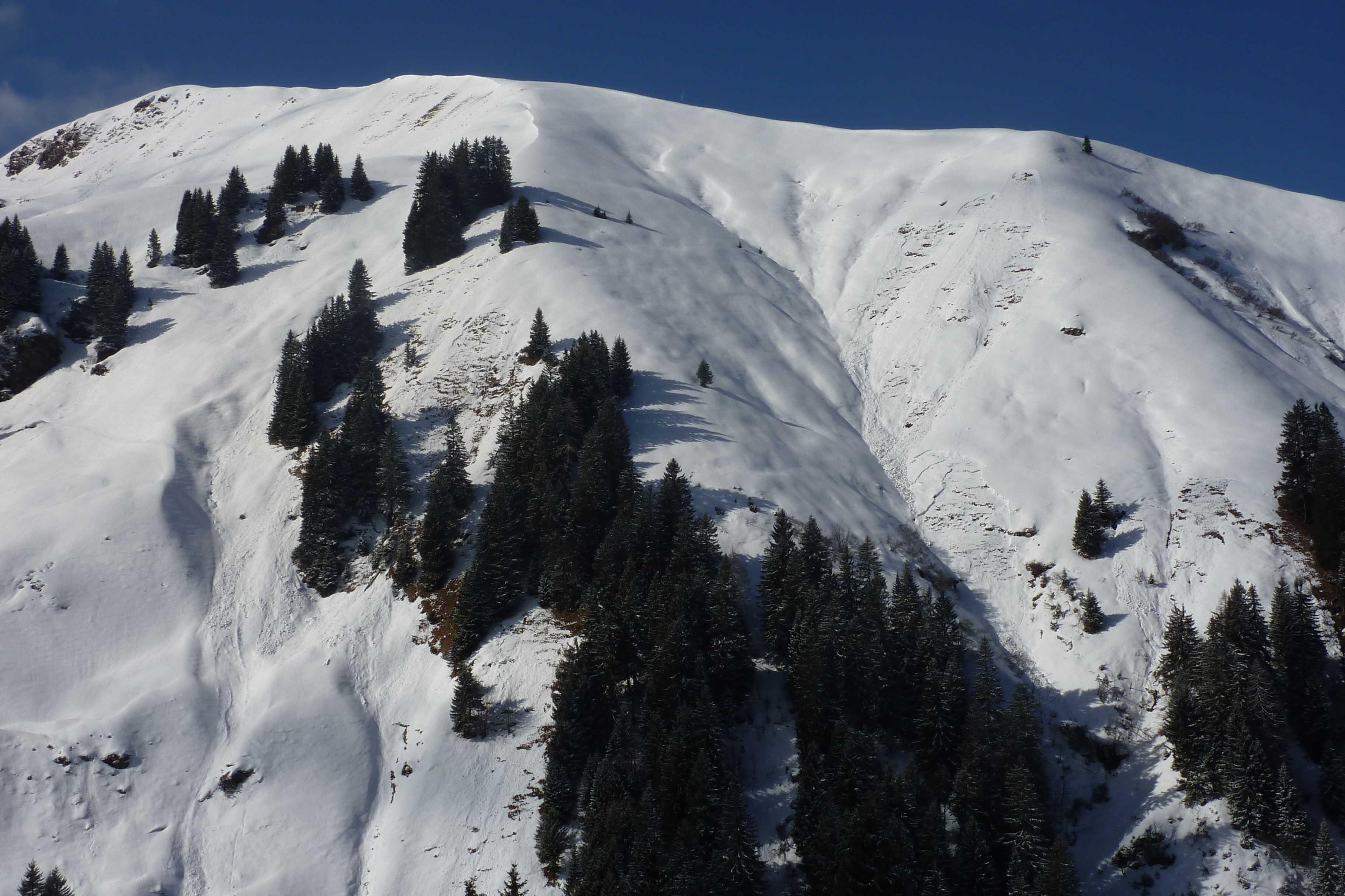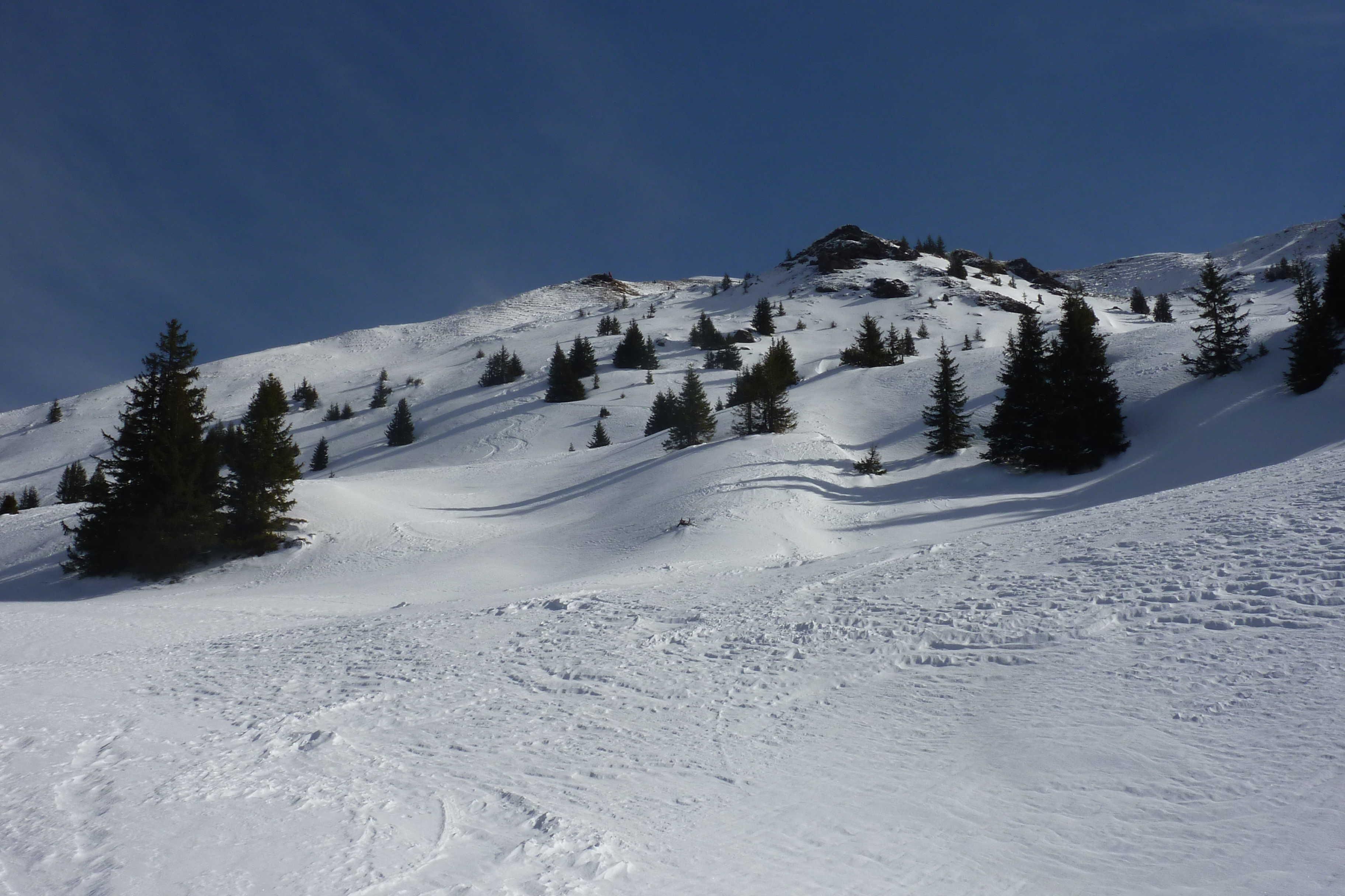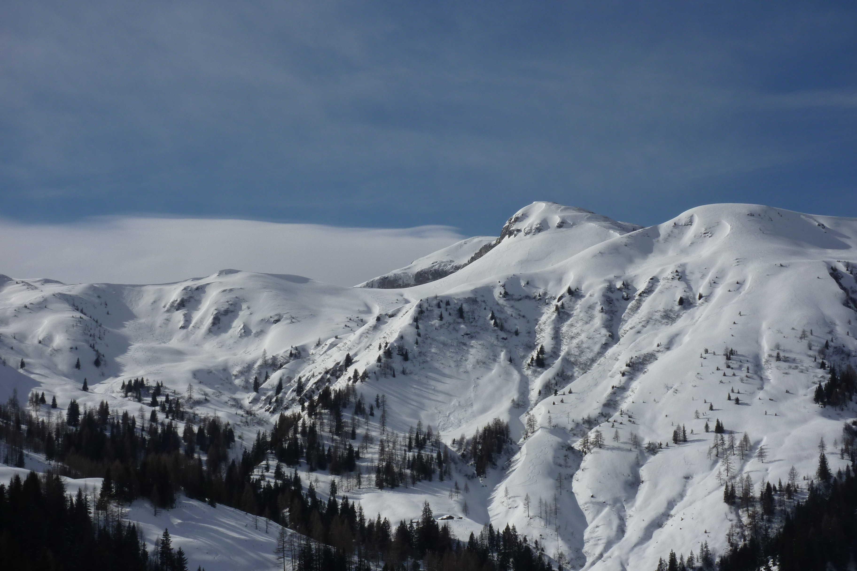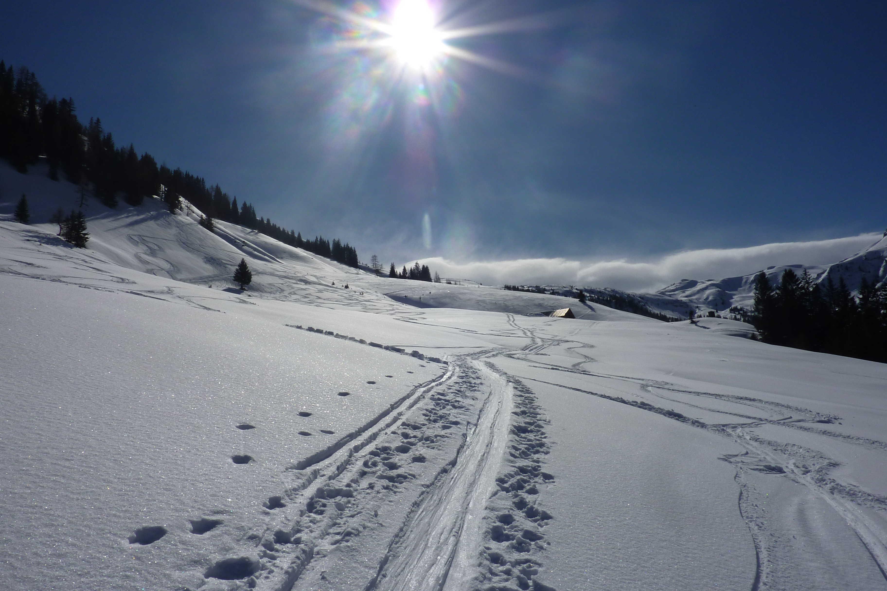 Die Straße war nur ganz kurz im Waldbereich eisig bzw. fast aper. Dann etwas lockerer Pulver auf tragfähiger Harschkruste. Der Wind schlägt durch, bläst auch Schnee auf die Spur (das gab ein paar Flüche) und hat dann weiter oben den Neuschnee gepresst. Ich war schon so oft da oben, ich verzichte auf den Gipfel und entscheide mich für Abfahrtsvergnügen pur bis zur Almstraße.