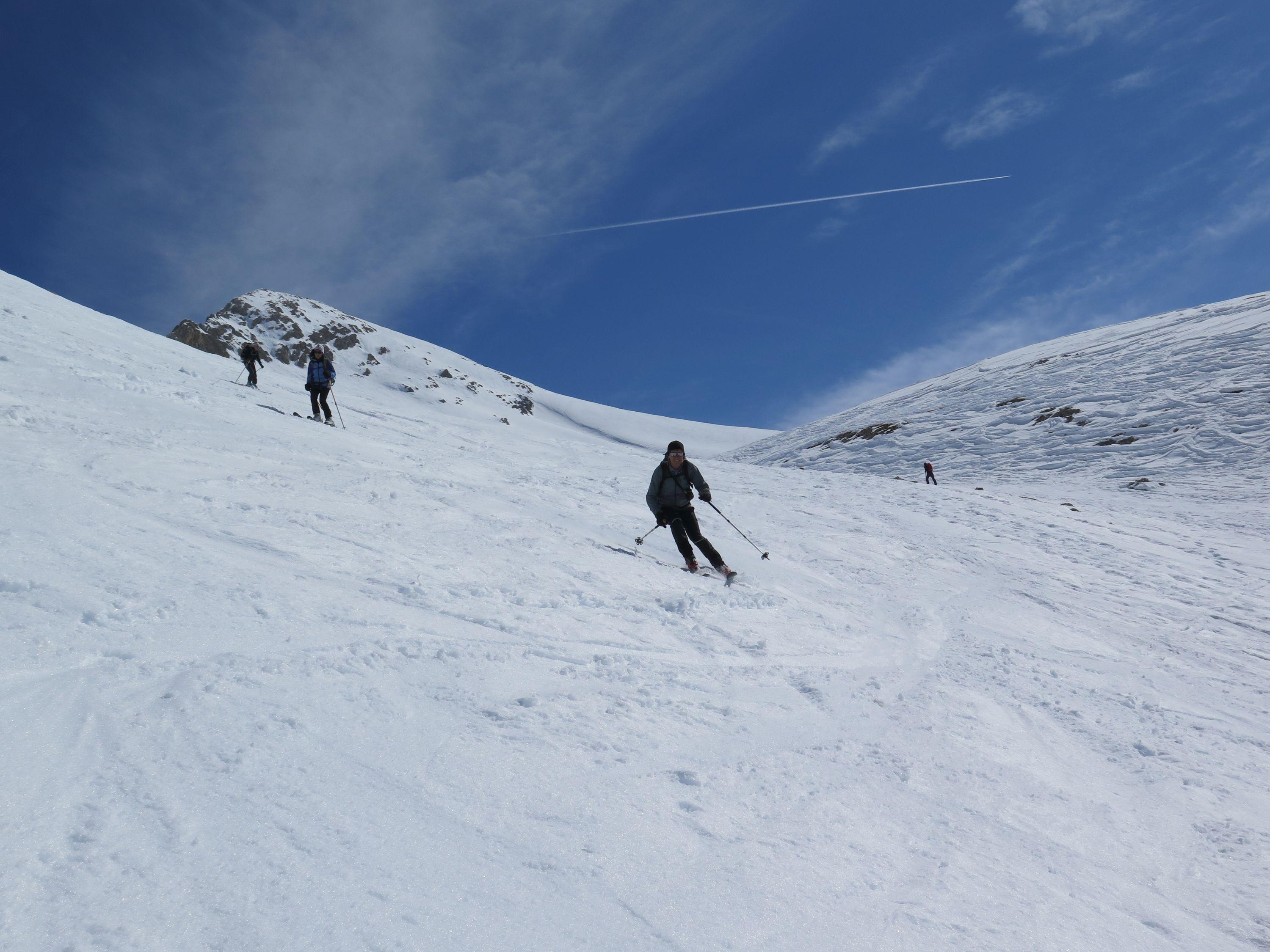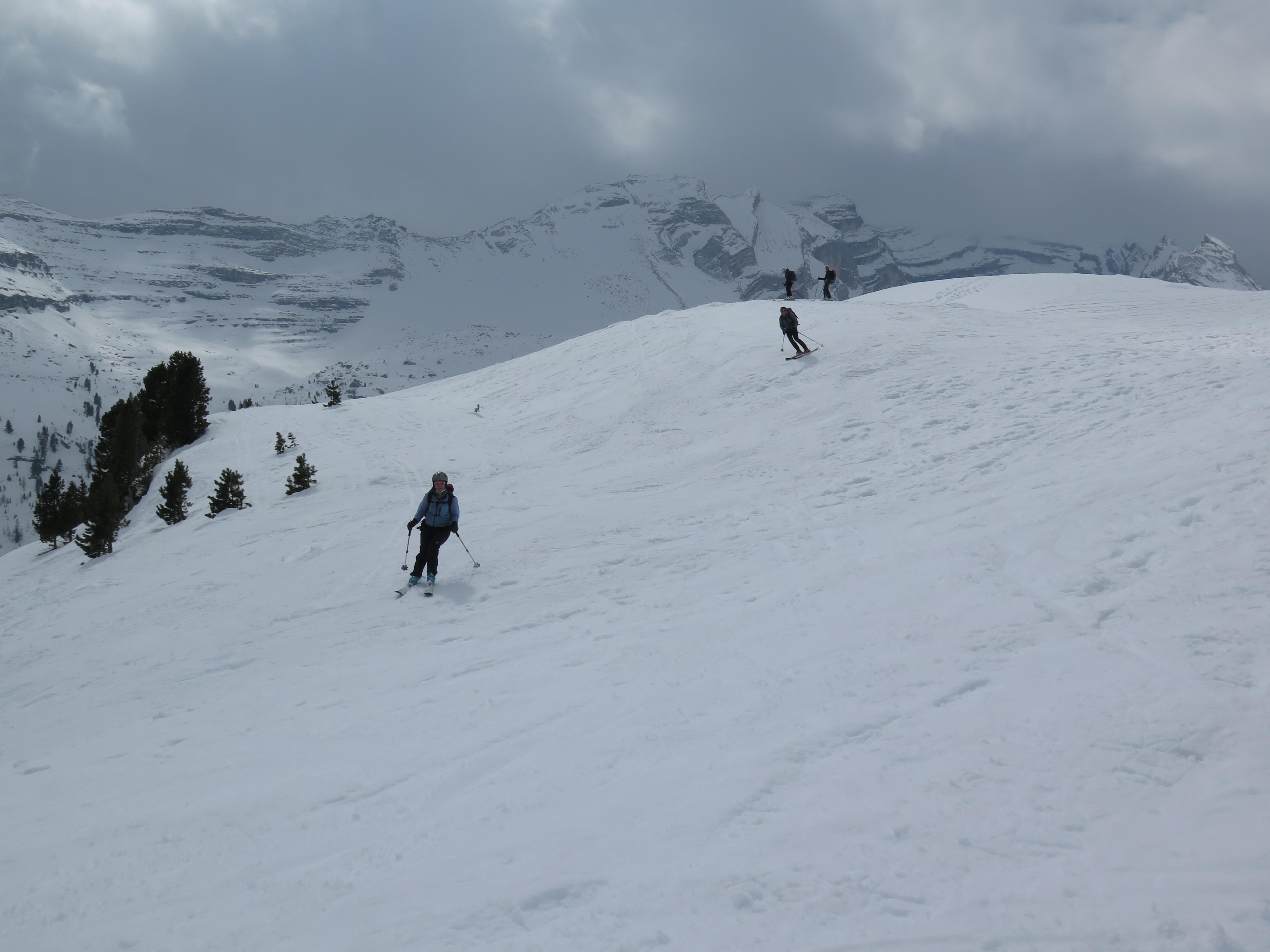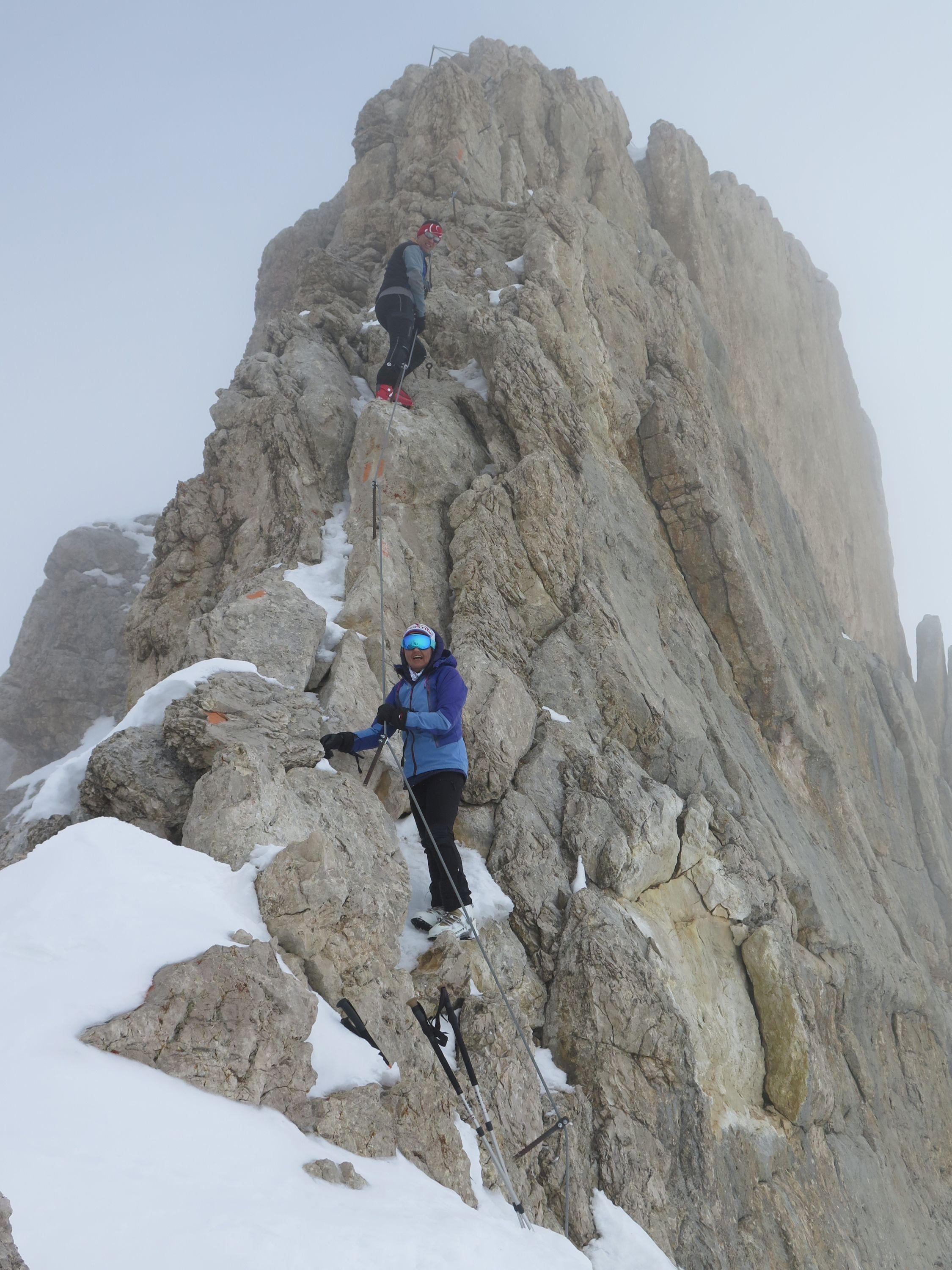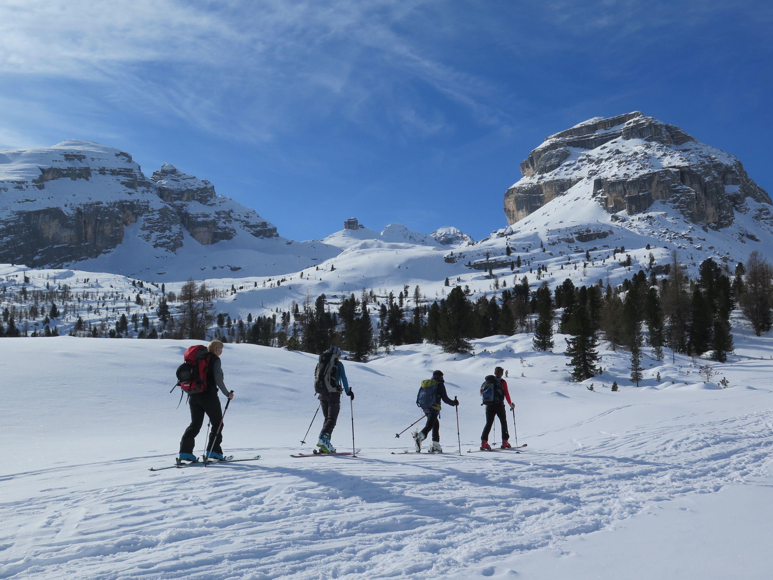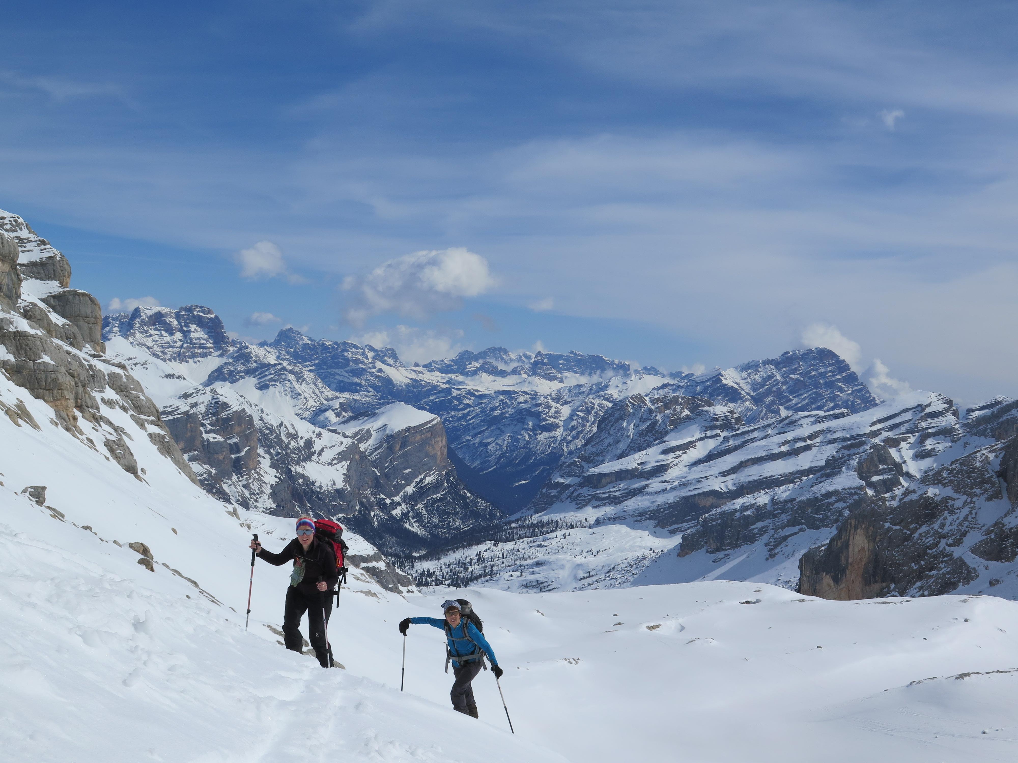 Lavarellahütte war unser Stützpunkt, es herrschten sichere, stabile Schneeverhältnisse! Der Lavarellagipfel über das Großfanestal, Tadegajoch ins Hochtal " Büsc da Stlü" bietet grossartige Hänge, atemberaubendes Panorama der umliegenden Dolomitengipfeln. Die Zehnerspitze hat zum Gipfel einen leichten Klettersteig zu bewältigen.