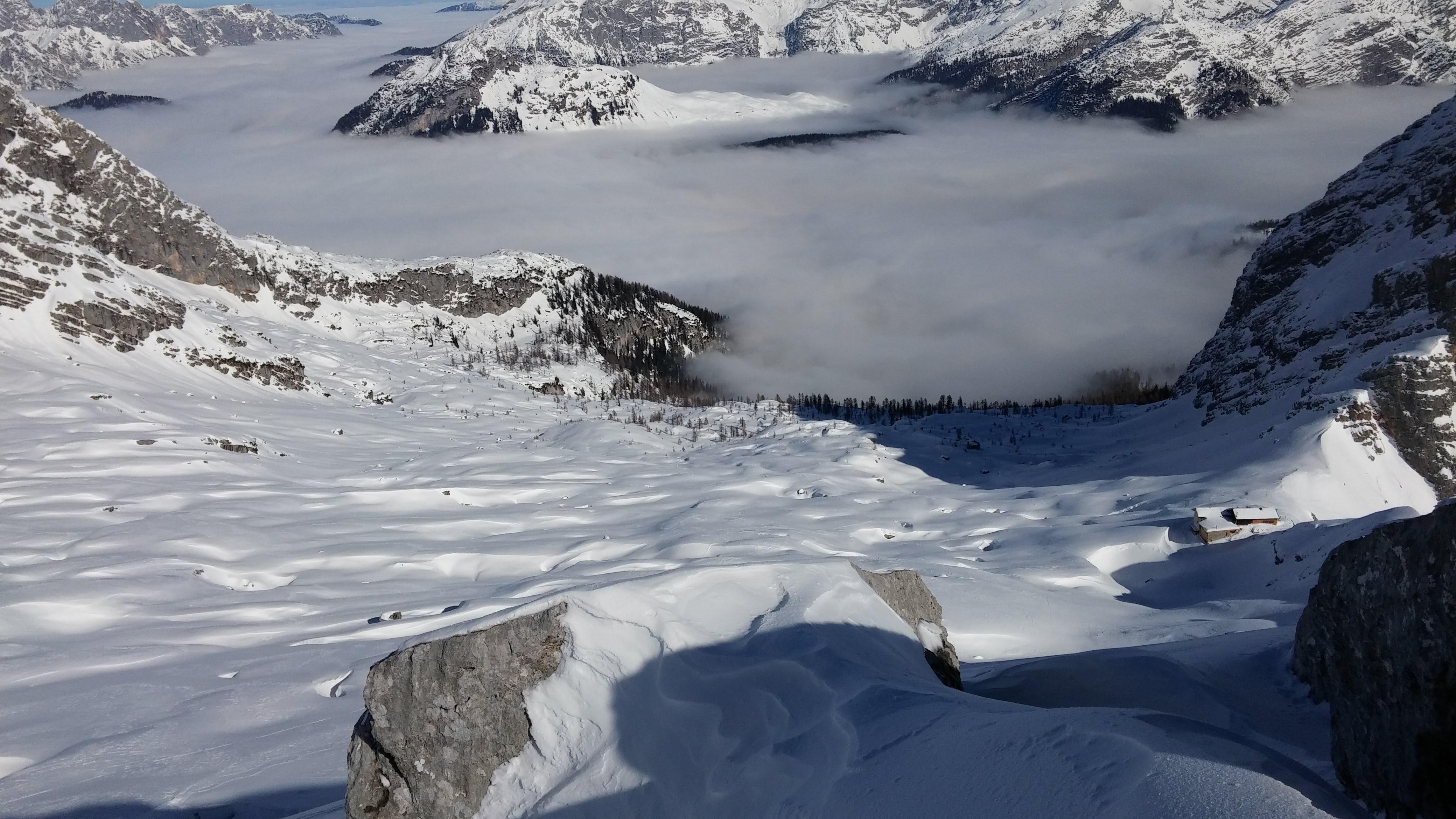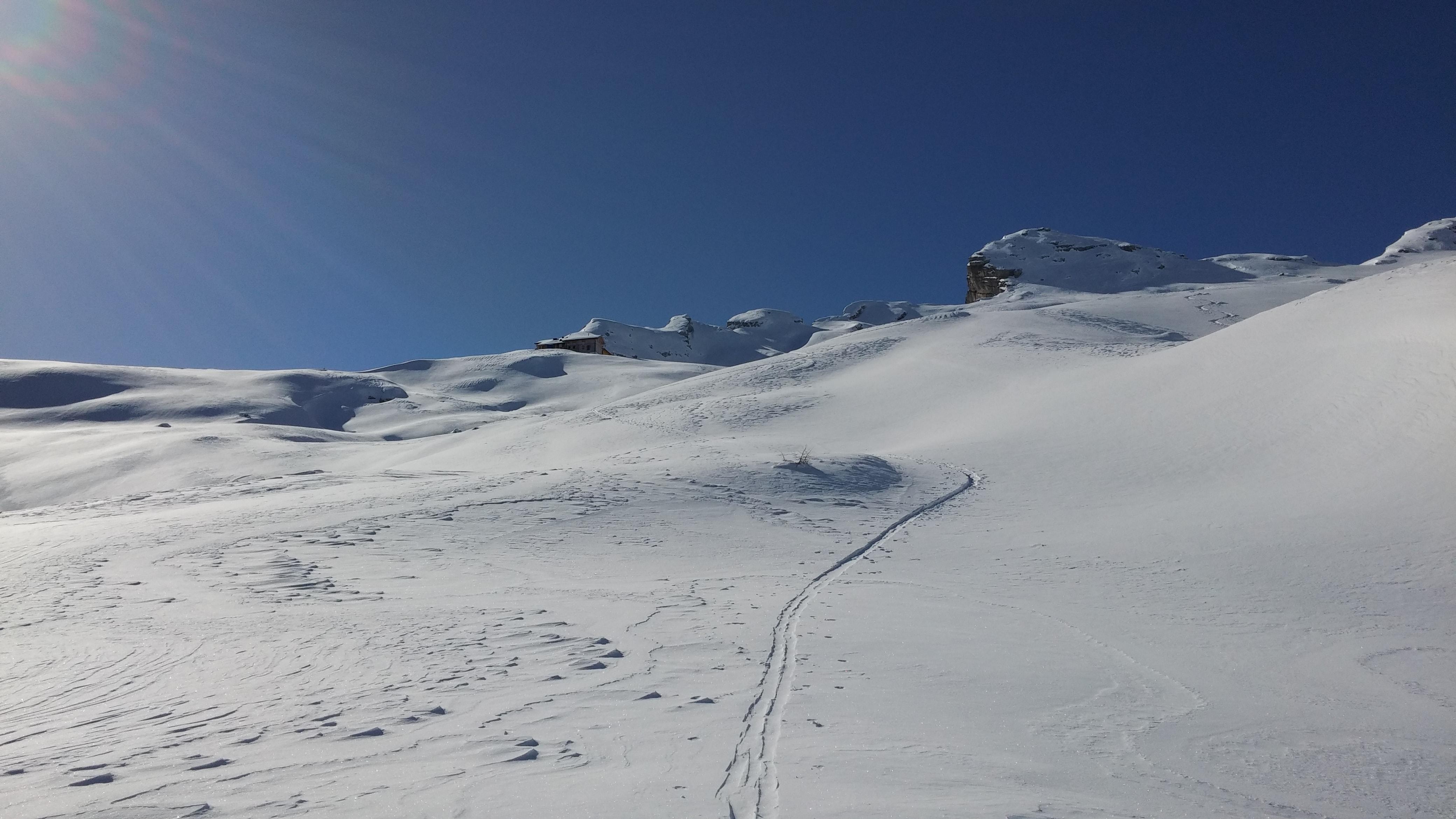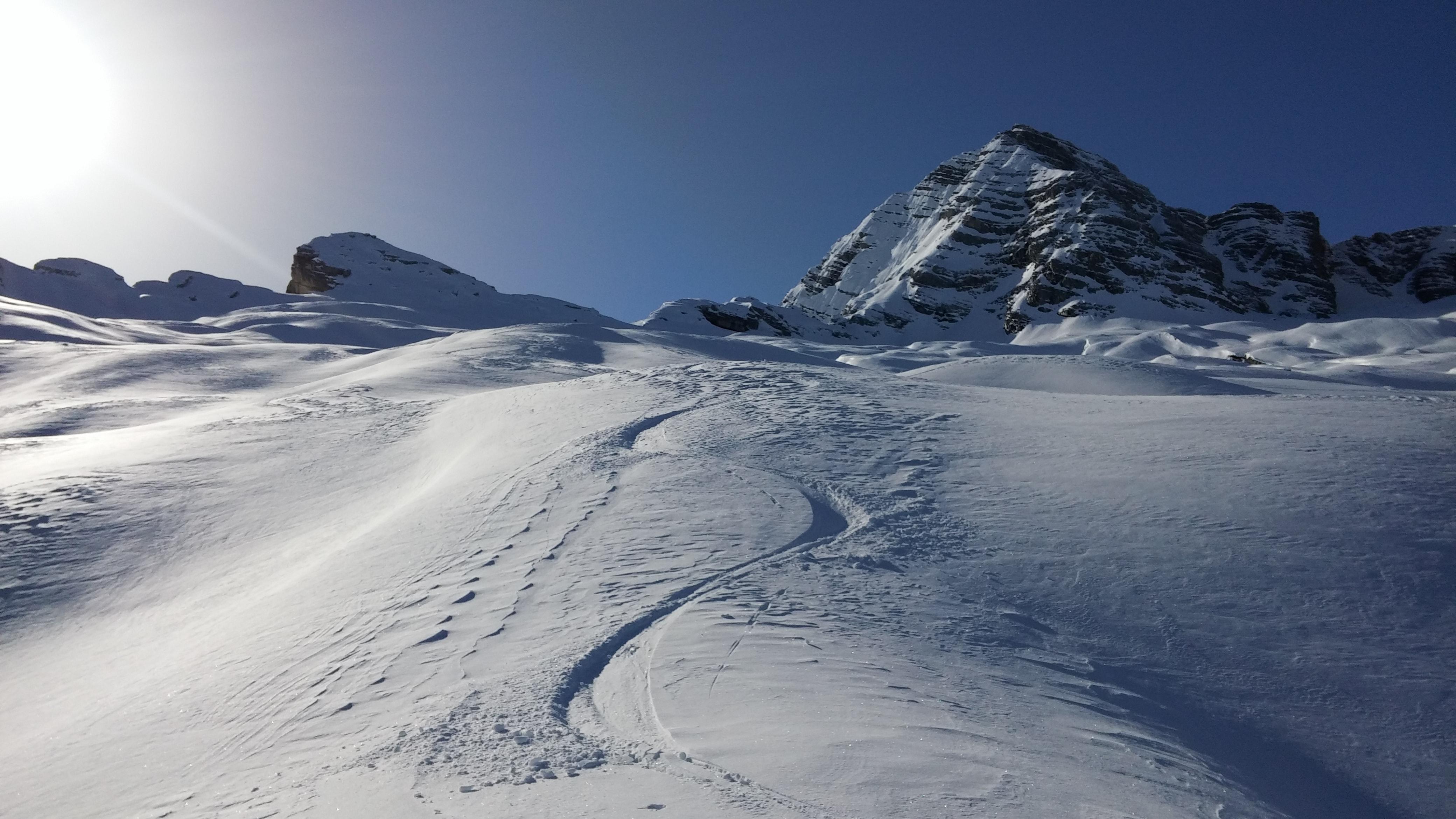Der Südföhn vom Mittwoch hat ganze Arbeit geleistet und das gesamte Kar vom lockeren Pulver befreit. Die Schneedecke präsentiert sich in allen windbehandelten Formen und ist dementsprechend unterschiedlich genussvoll zu fahren gewesen.