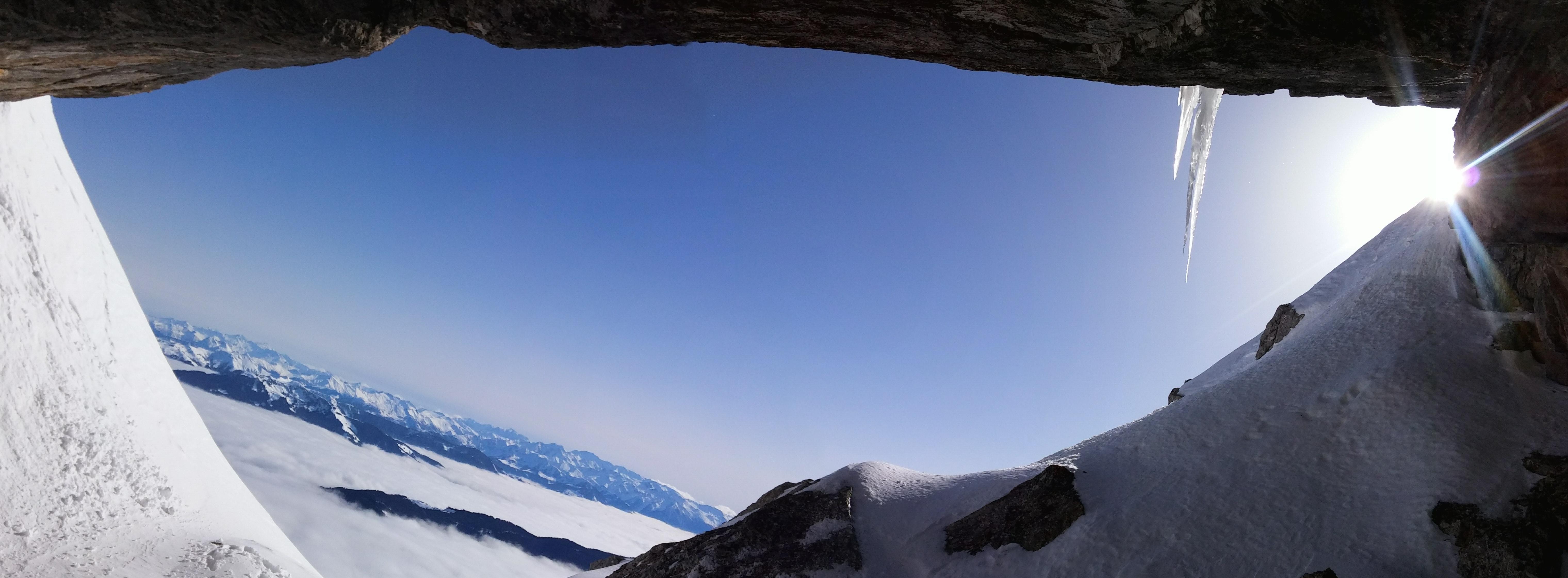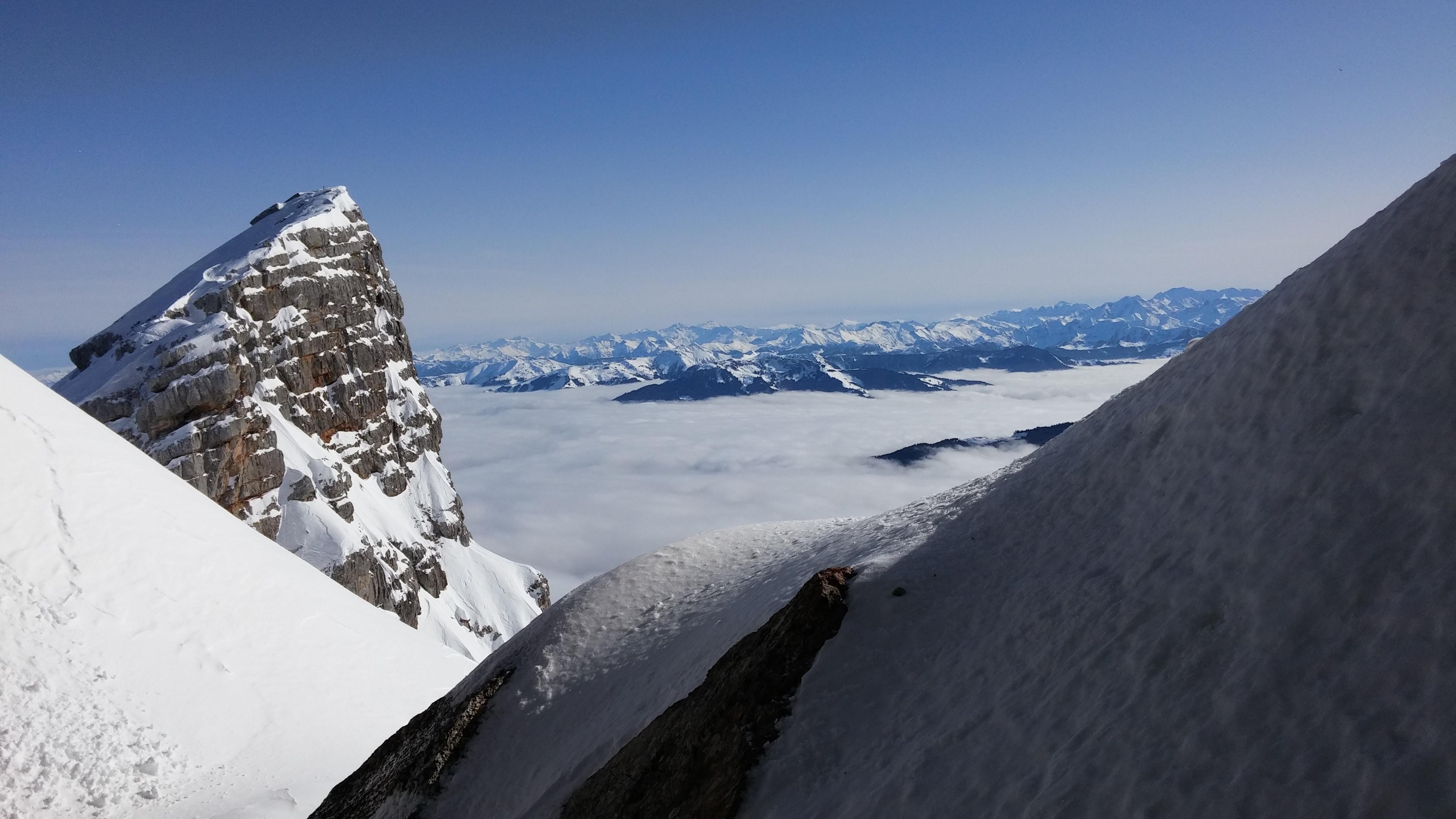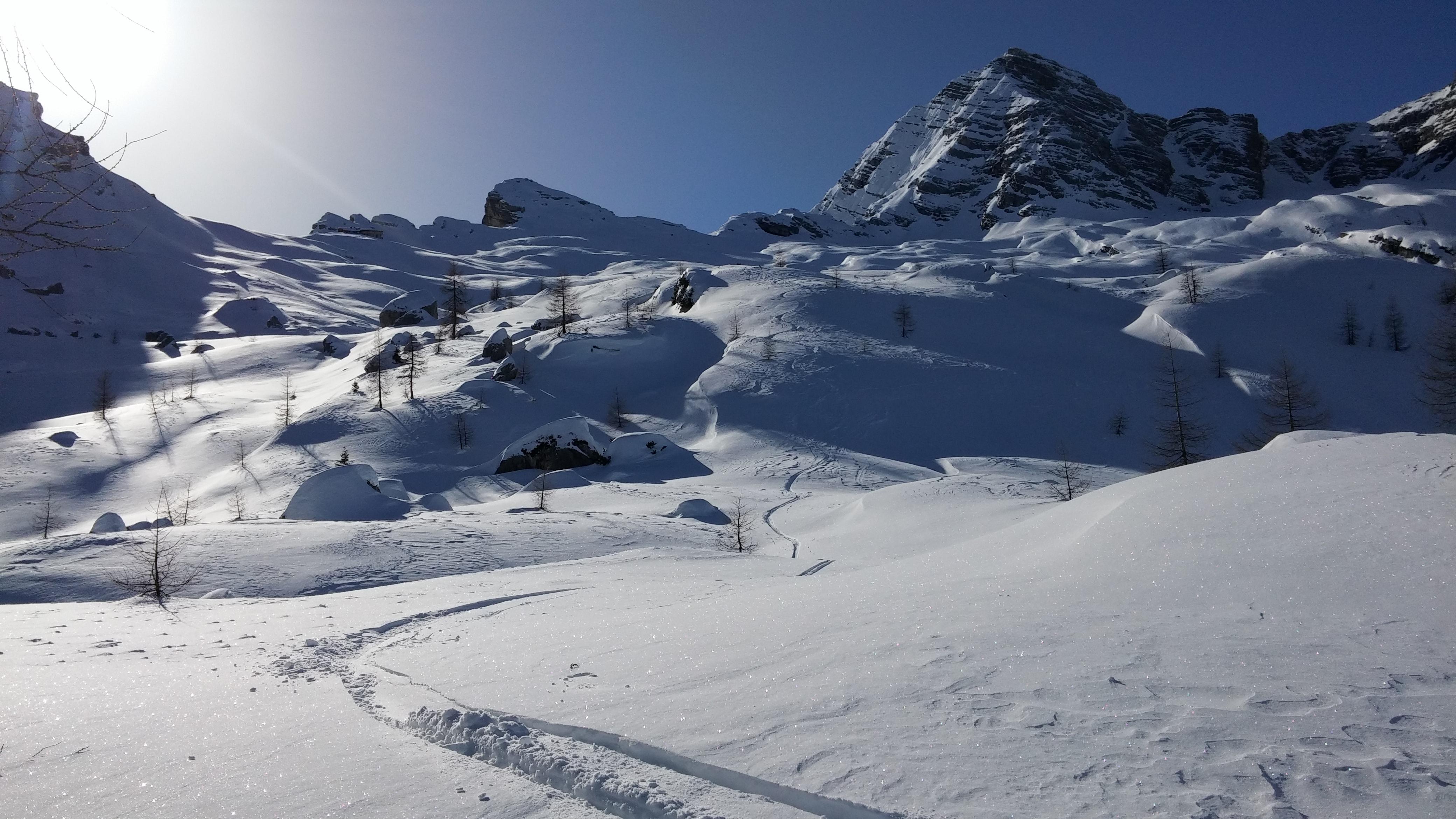 Der Südföhn vom Mittwoch hat ganze Arbeit geleistet und das gesamte Kar vom lockeren Pulver befreit. Die Schneedecke präsentiert sich in allen windbehandelten Formen und ist dementsprechend unterschiedlich genussvoll zu fahren gewesen.