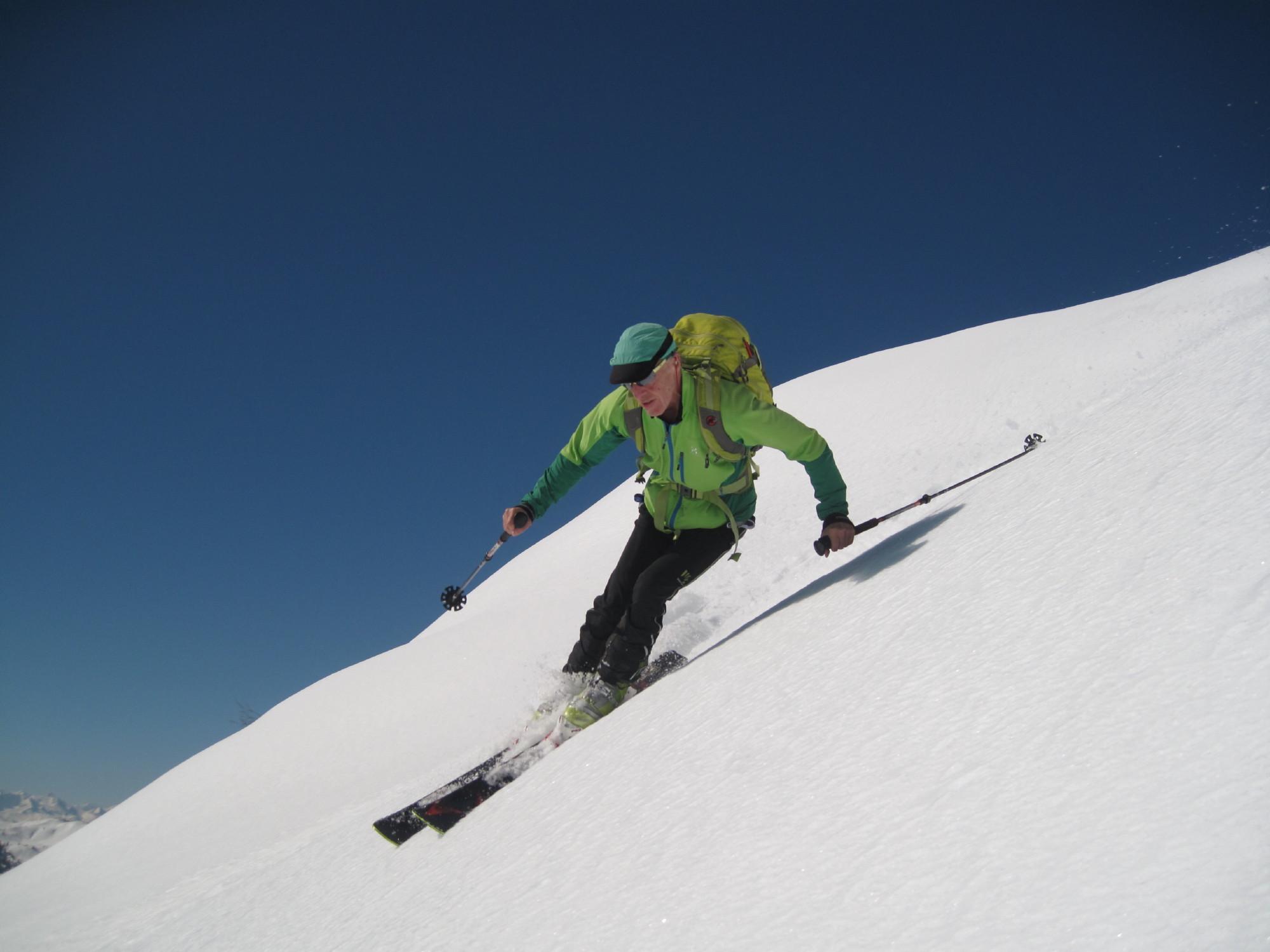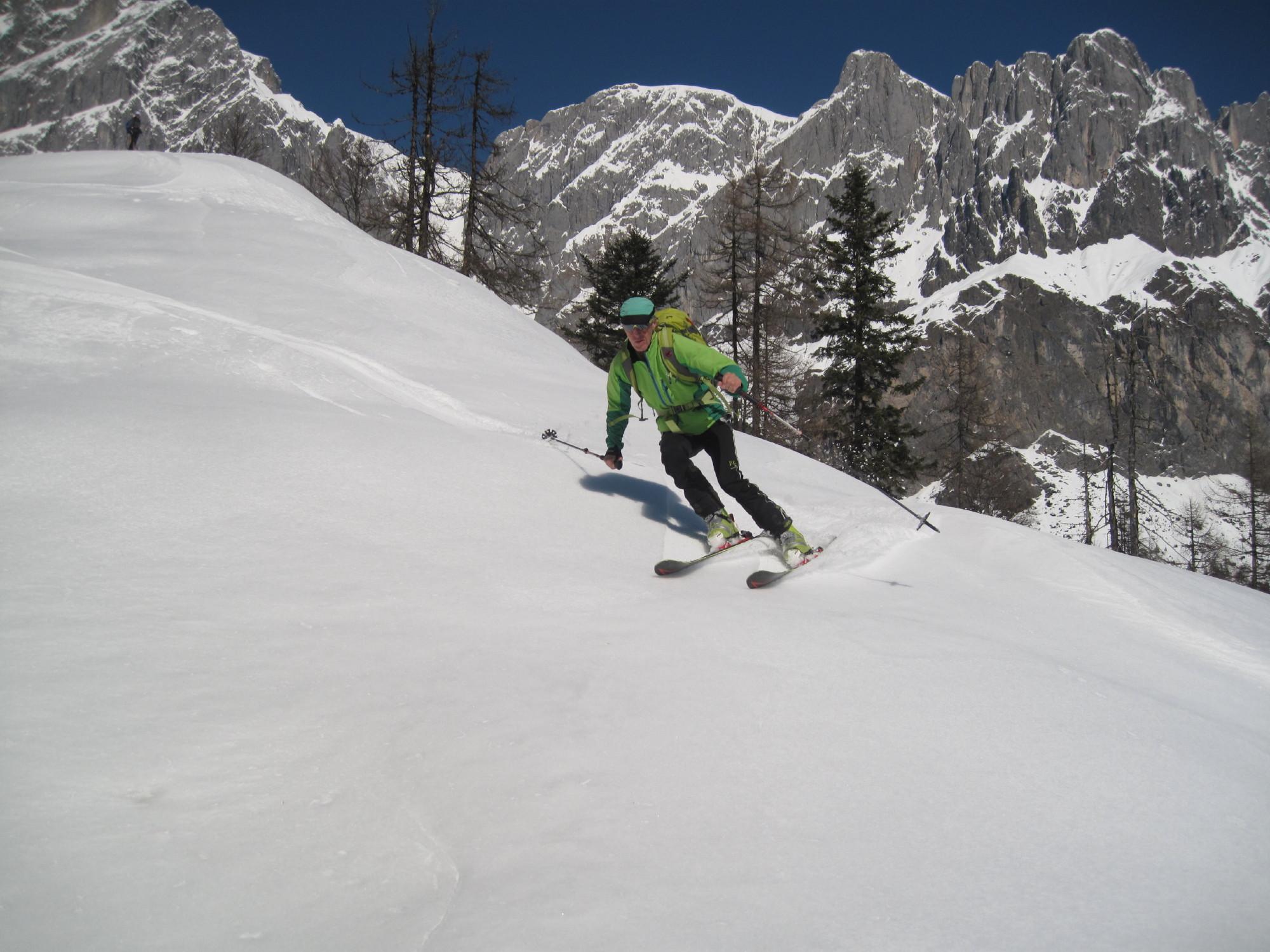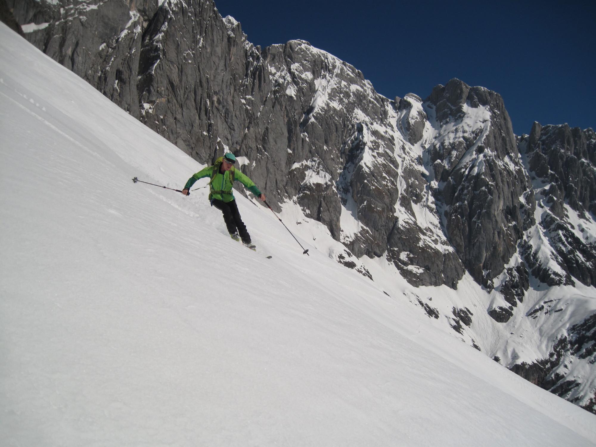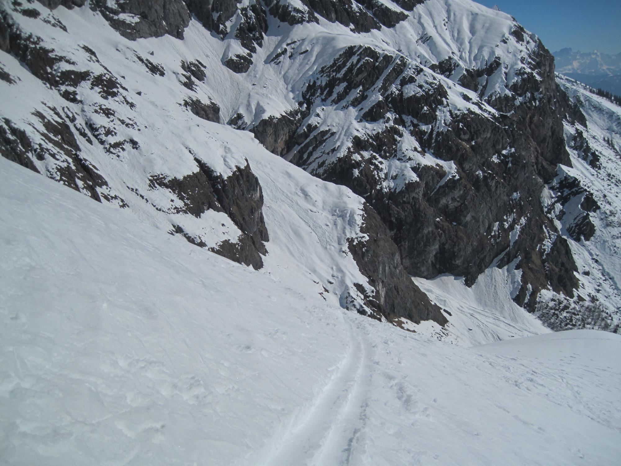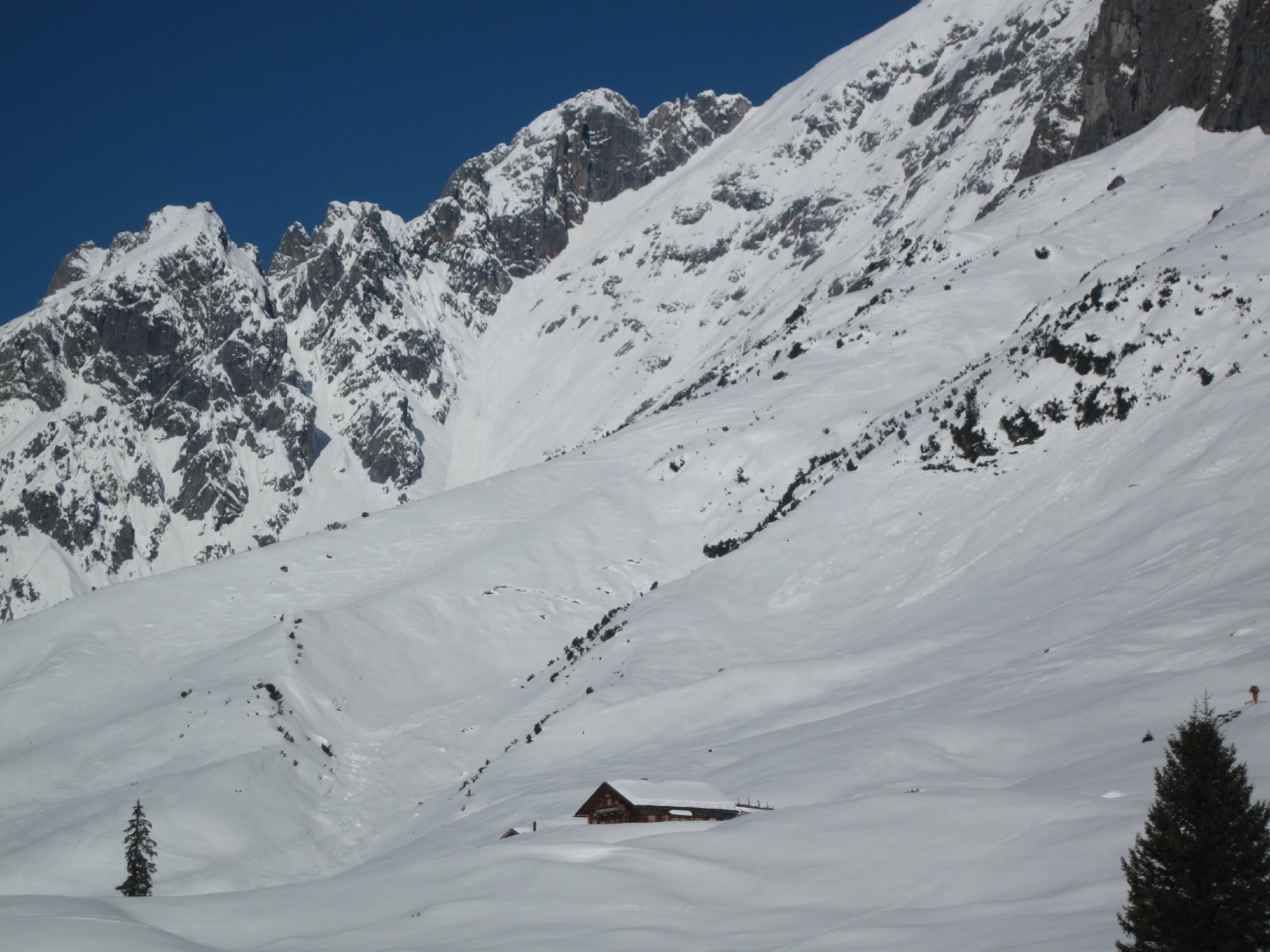 Von der Kopphütte gings über wunderschöne Schihänge, vorbei an den 4-Hütten und dann steiler werdend zum Beginn der Felsen der Wetterriffel. Gegenüber gestern haben sich die Schneeverhältnisse nochmals verbessert und es gab herrlichen Firn von ganz oben weg.
