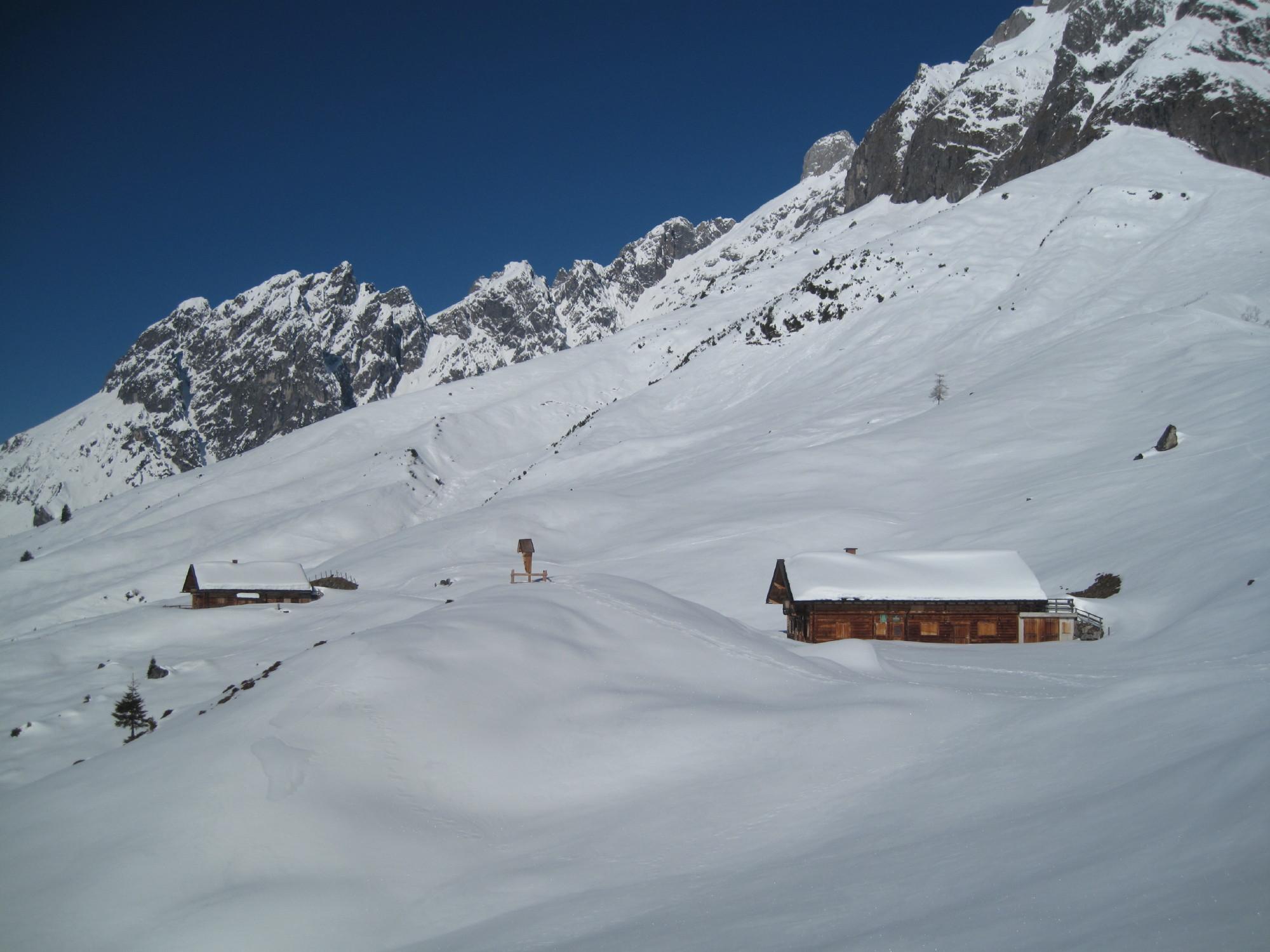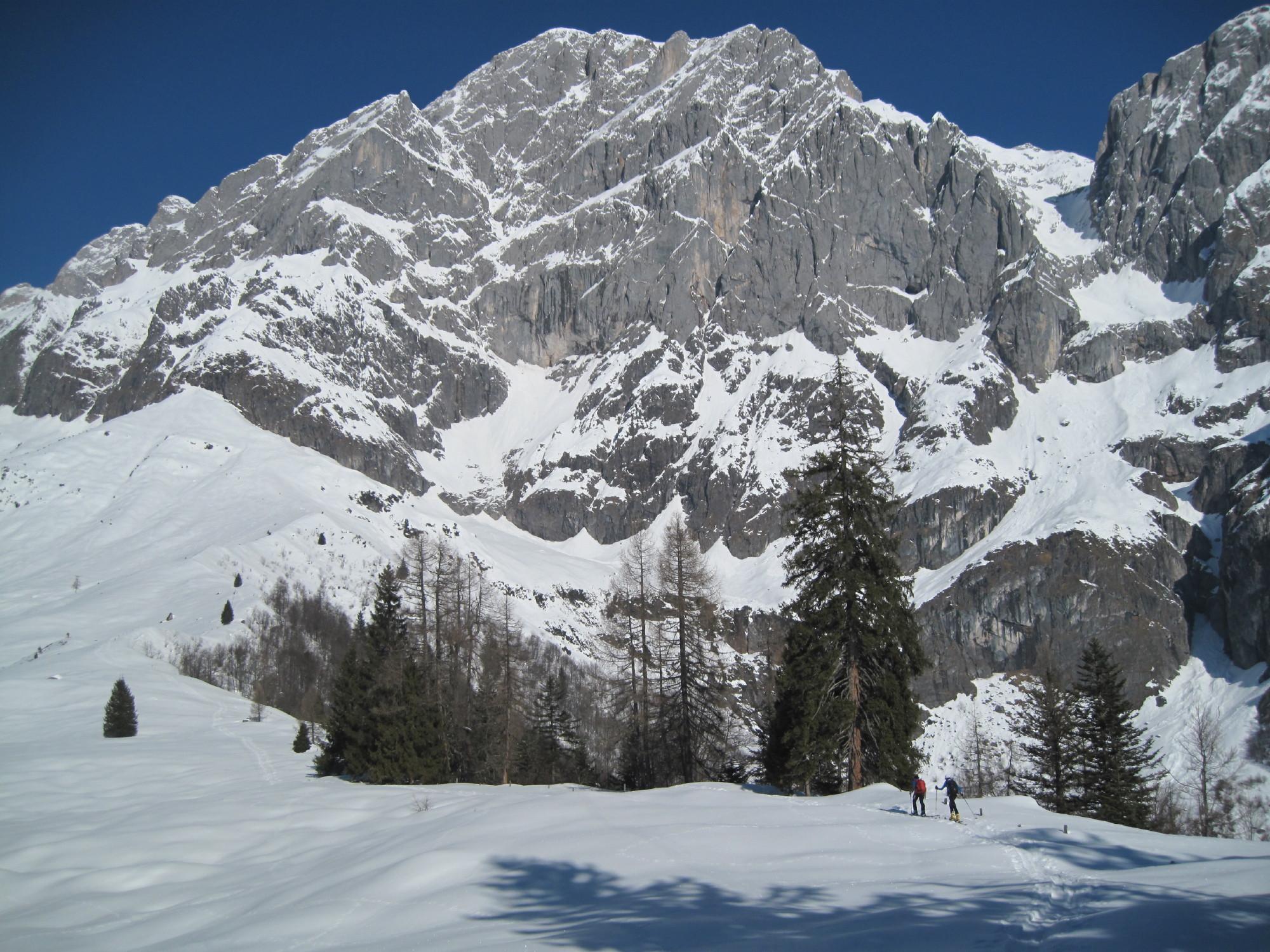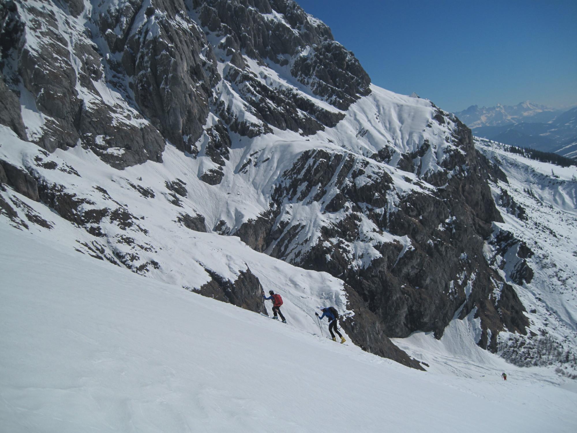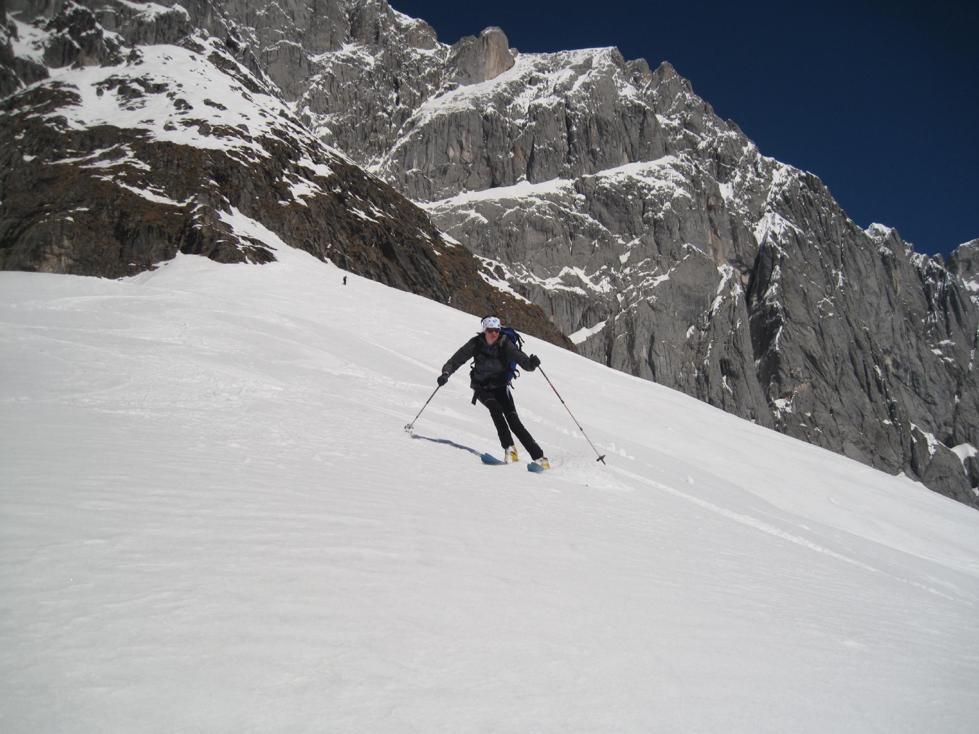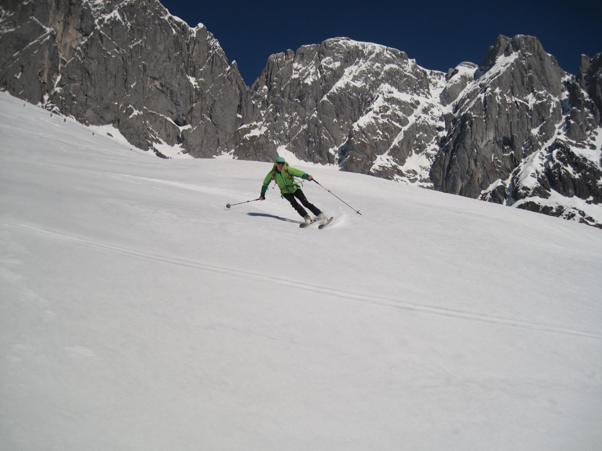 Von der Kopphütte gings über wunderschöne Schihänge, vorbei an den 4-Hütten und dann steiler werdend zum Beginn der Felsen der Wetterriffel. Gegenüber gestern haben sich die Schneeverhältnisse nochmals verbessert und es gab herrlichen Firn von ganz oben weg.