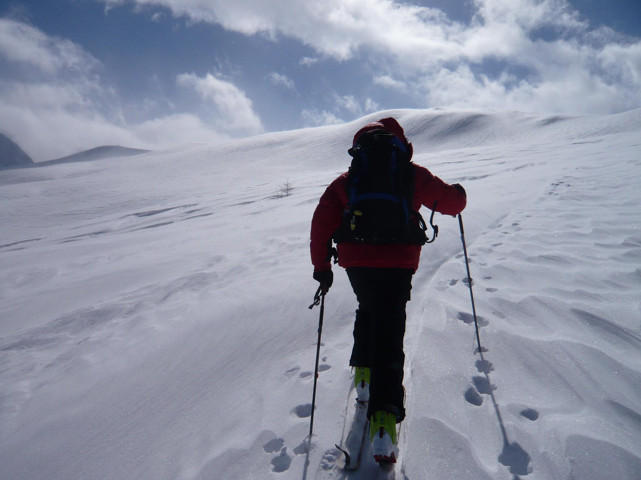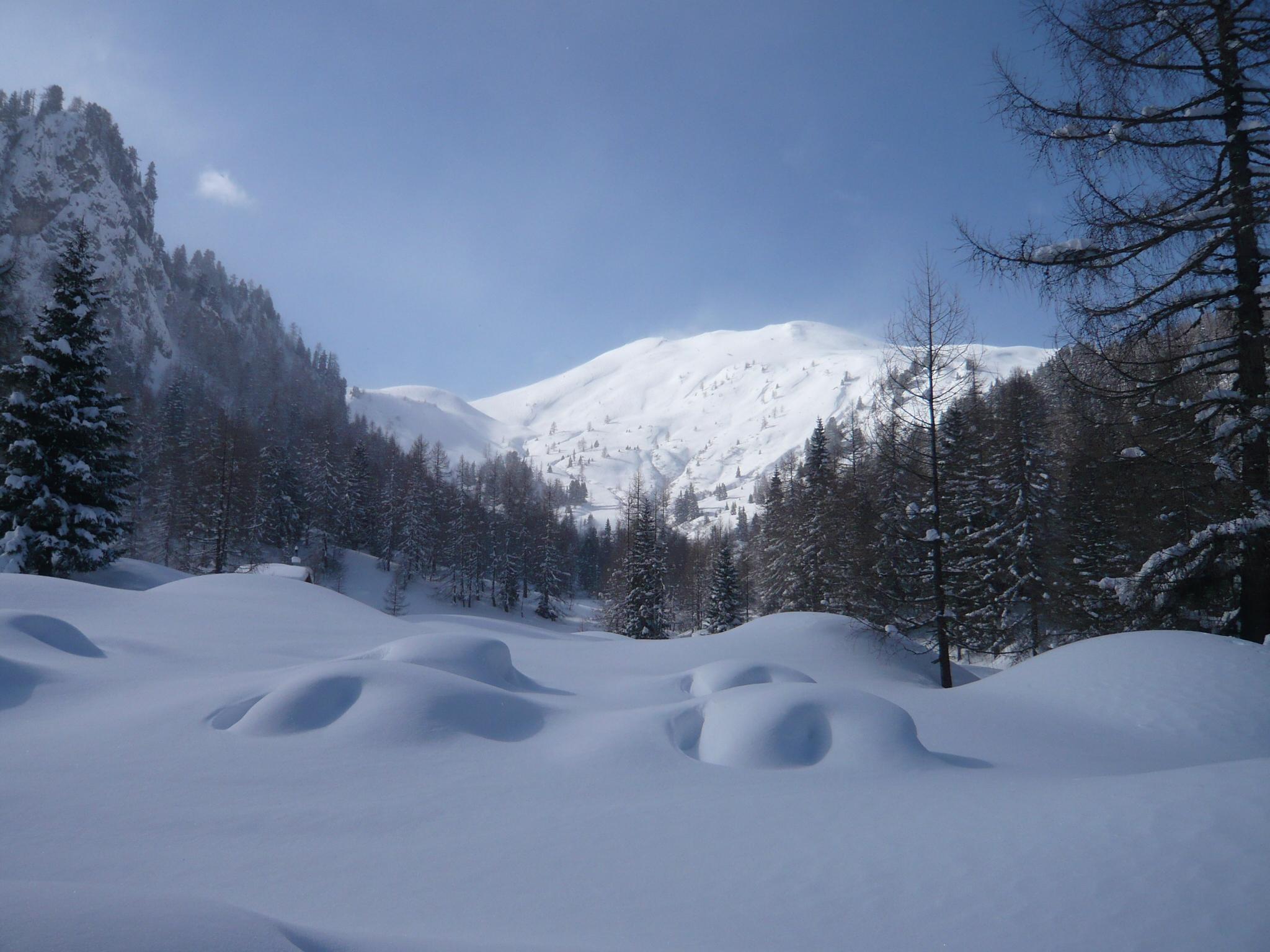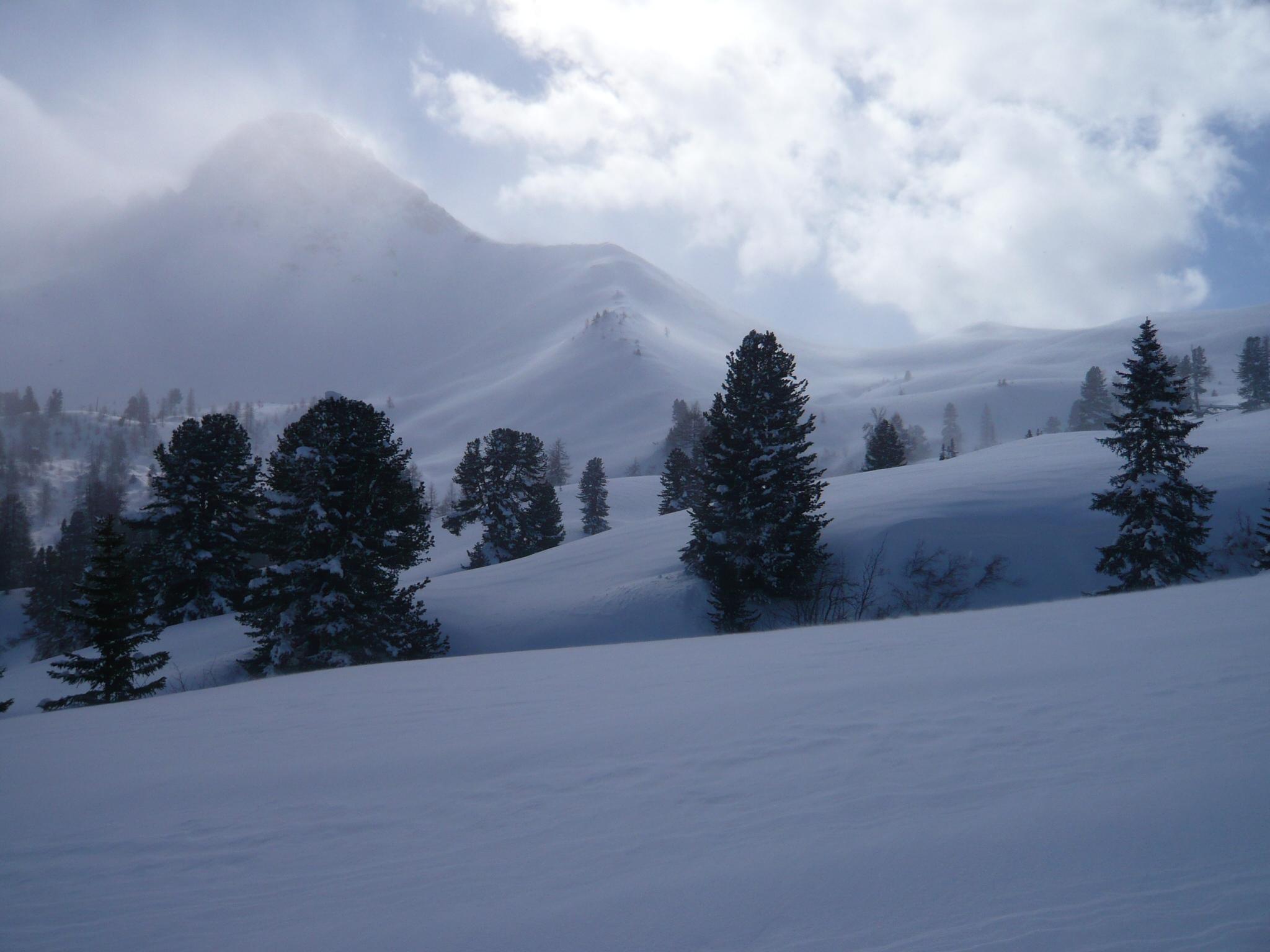 Fazit: Die Wetterprognose hat leider gestimmt, der Südföhn kannte kein Erbarmen mit uns und auch nicht mit der Schneedecke. Bei unerwarteter Neuschneemenge (etwa 40 cm) hat er sich reichlich ausgetobt und eine Dünenlandschaft erzeugt, die zwar schön zum Anschauen, aber suboptimal zum Skifahren war. Die sichere, flache Routenwahl war dann bei der ersten Abfahrt vom Filzmooshörndl zur Filzmoosalm entweder eine stockende Geradeausfahrt in Rückenlage oder eine Aufstiegsspurfahrt. Die Abfahrt vom Loosbichl gestaltete sich in Folge wie erwartet etwas besser, weil weniger windbearbeitet und etwas steiler. Für die sichere Hangneigung war es an diesem Tag fast zu viel Neuschnee%u2026.. uups..wer hätte gedacht, dass in diesem Winter noch mal die Worte %u201Ezu viel Neuschnee%u201C in Kombination geschrieben werden%u2026.. Summa summarum war es aber ein feiner Tag in den Bergen.