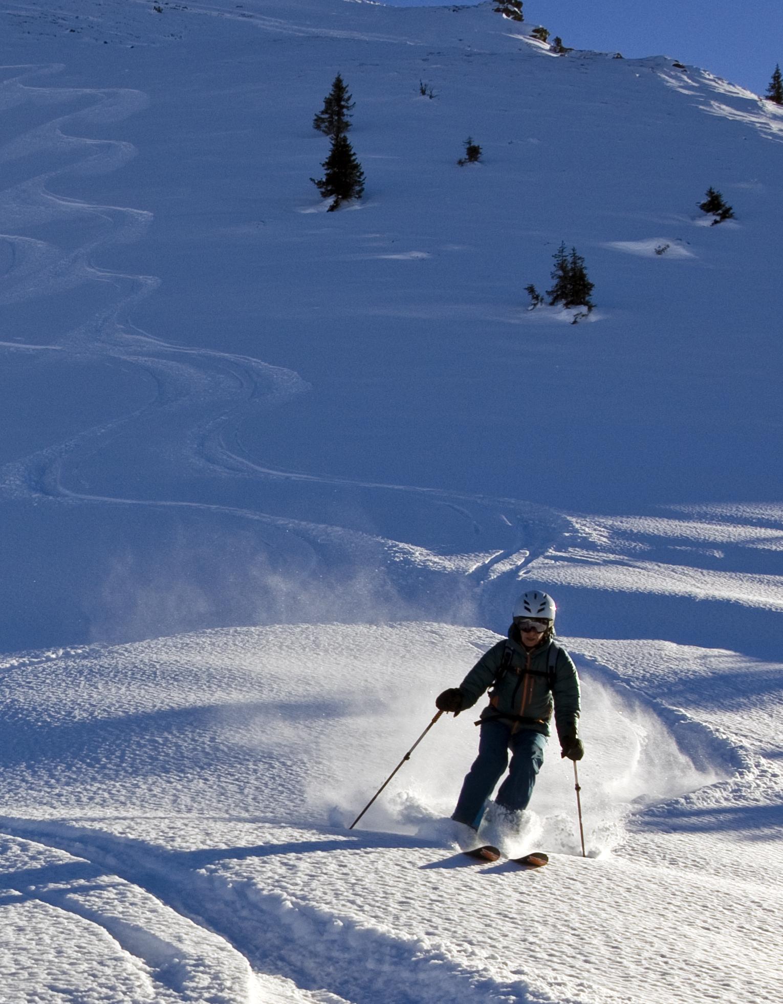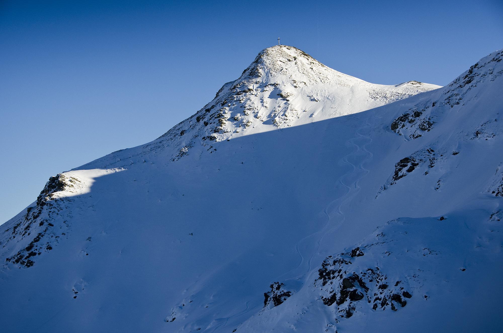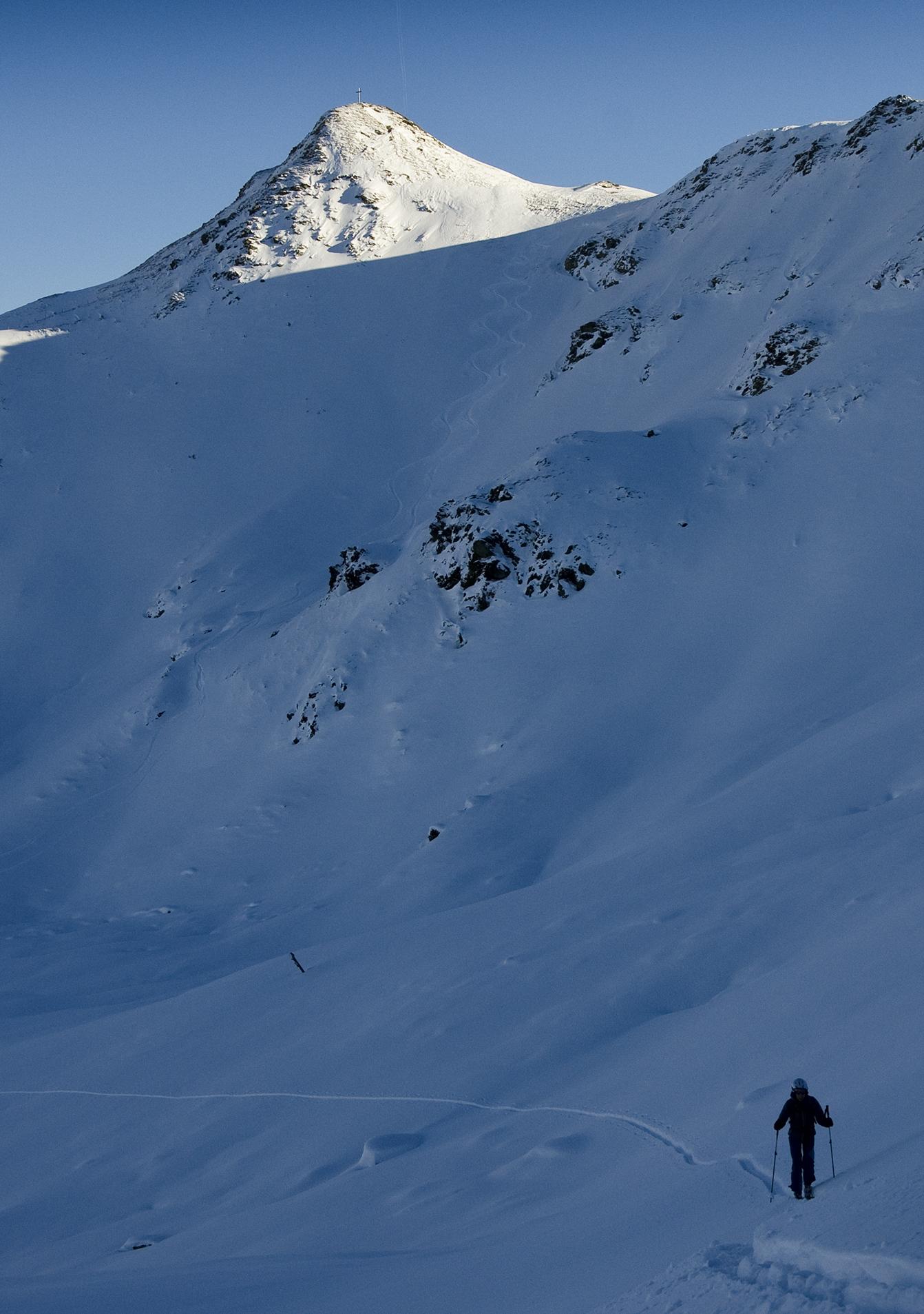 Die nordwestseitigen Hänge zum Kuhkaser versprachen noch wunderbaren Pulverschnee. Auch die direkte Abfahrt nach Norden vom Gipfel war heute möglich. Ein kleiner Gegenanstieg muss sein, um zurück zu den Hängen unter dem Vorgipfel zu kommen. Auch dort kalter leichter Staub. Aber morgen ist das Schnee von gestern.
