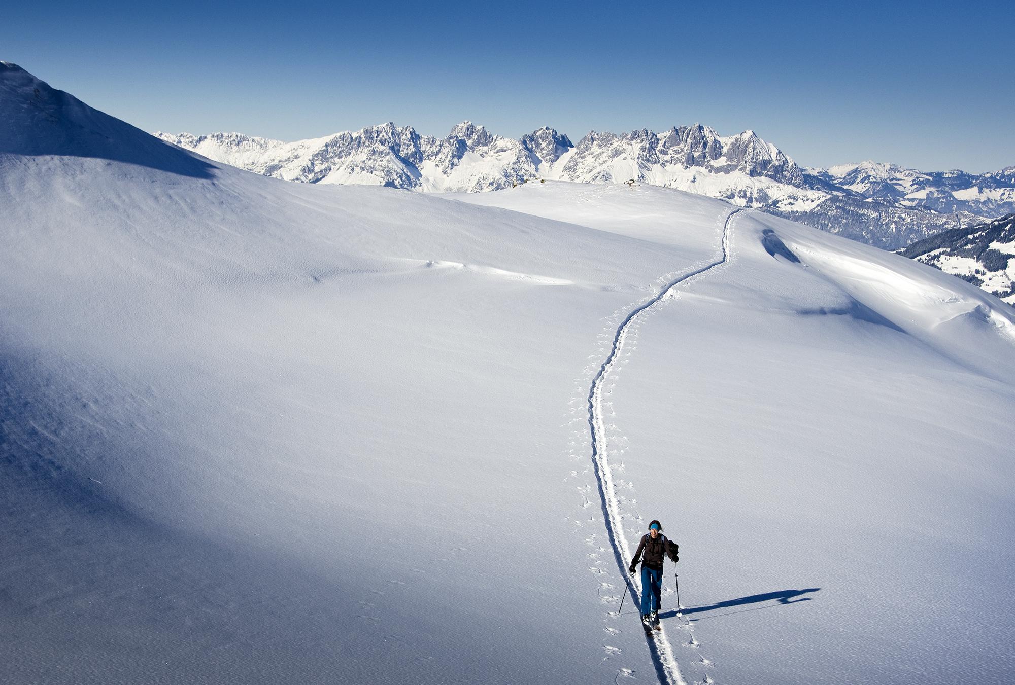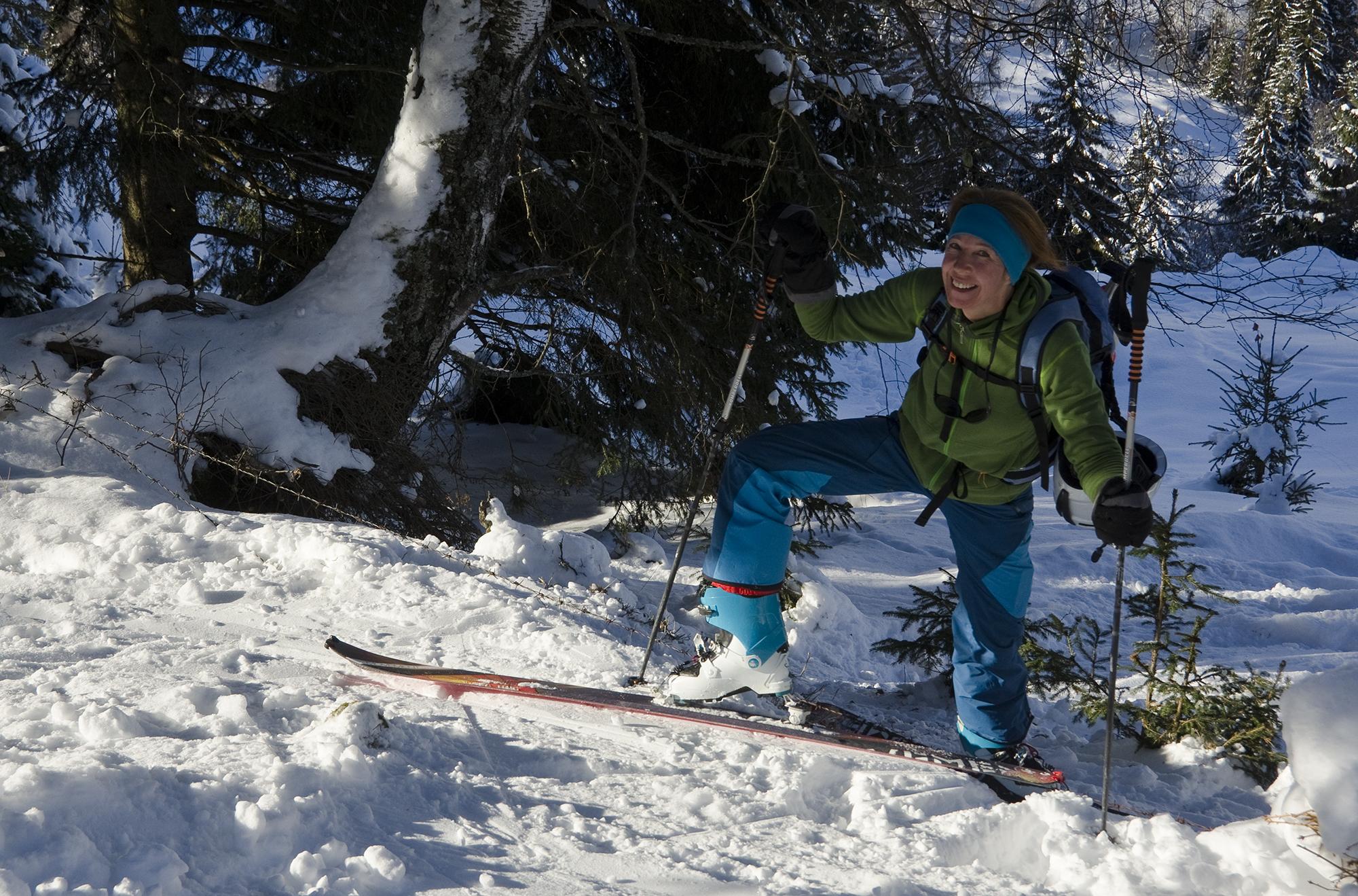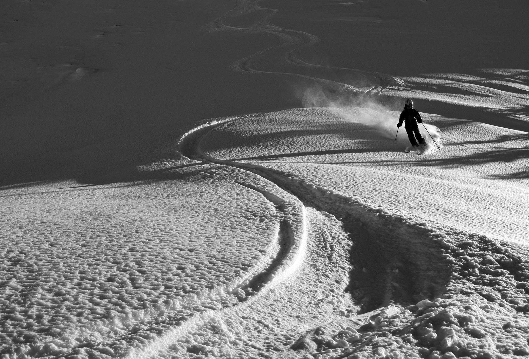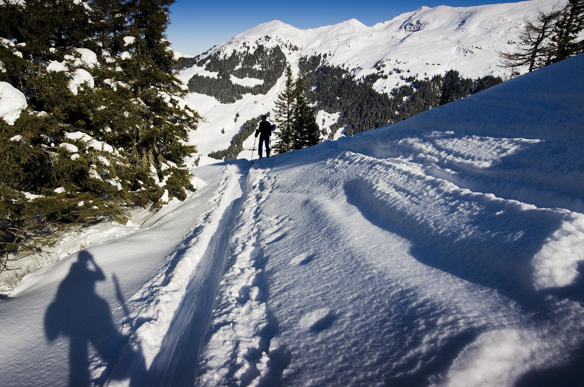 Die nordwestseitigen Hänge zum Kuhkaser versprachen noch wunderbaren Pulverschnee. Auch die direkte Abfahrt nach Norden vom Gipfel war heute möglich. Ein kleiner Gegenanstieg muss sein, um zurück zu den Hängen unter dem Vorgipfel zu kommen. Auch dort kalter leichter Staub. Aber morgen ist das Schnee von gestern.