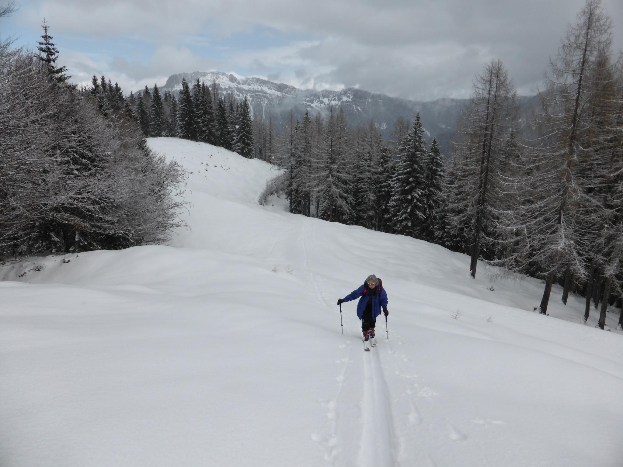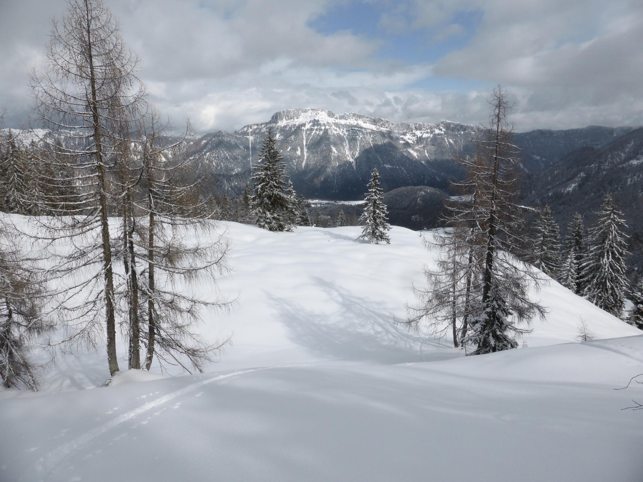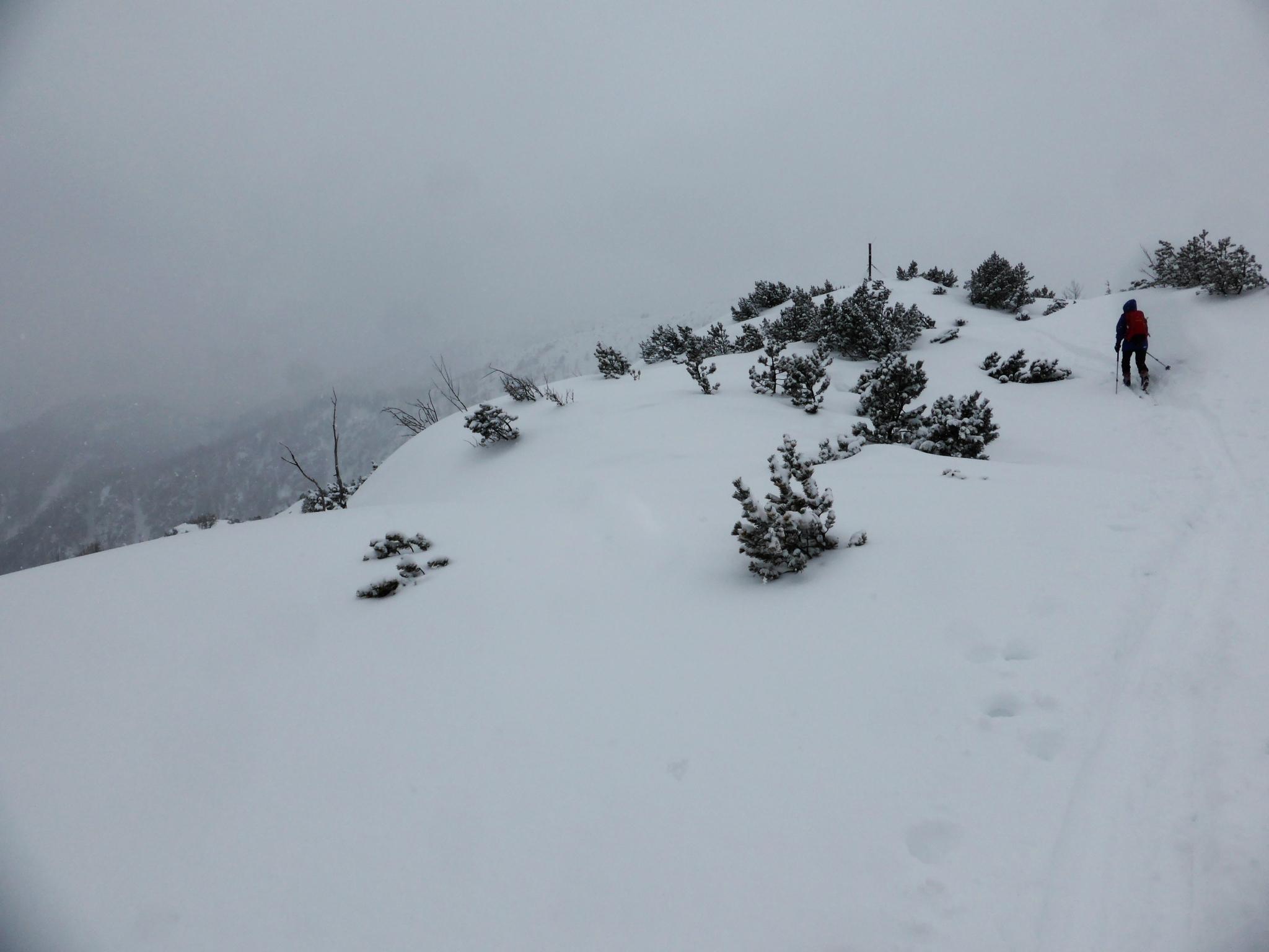 Allgemeine Verhältnisse, Schnee: 10 Minuten Skitragen bis Rechensau (Auffahrt bis zur Kapelle würde das ersparen), dann geringe Schneedecke bis zur Rechensaualm. Von dort bis zum Gipfel akzeptabel mit konstant 3 bis 5 cm Neuschnee. Der Altschnee ist immer noch feucht und nicht durchgefroren.