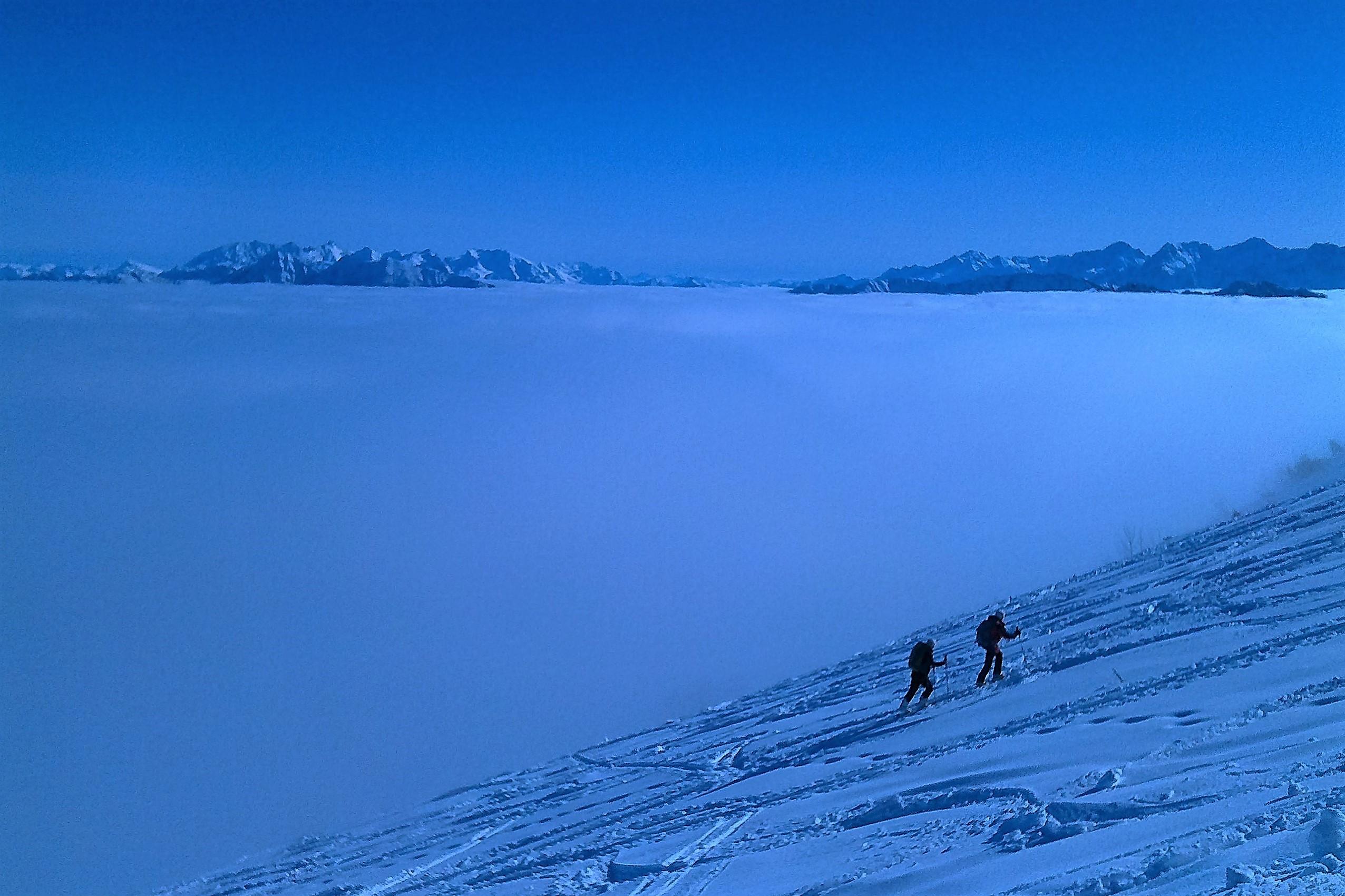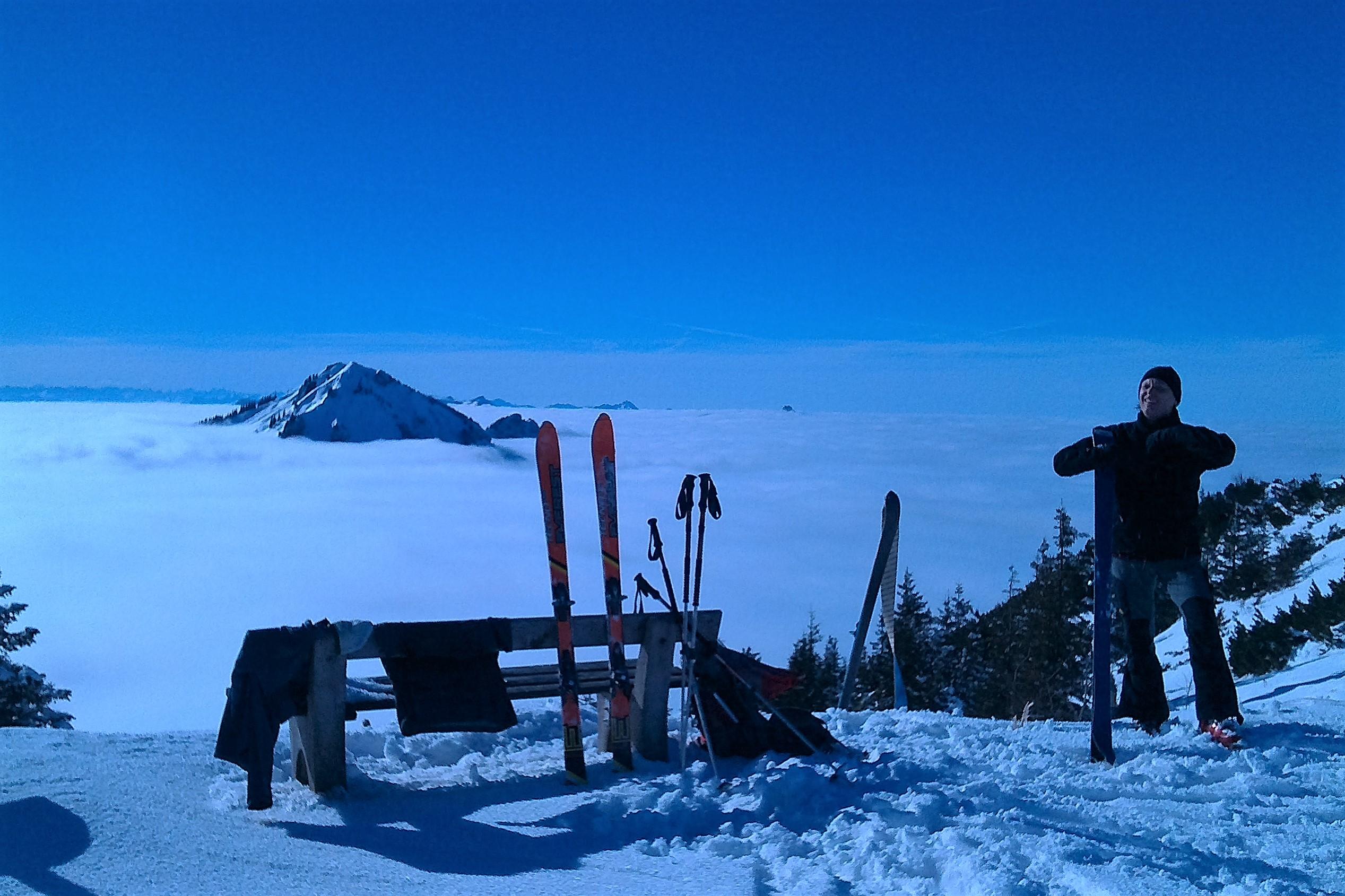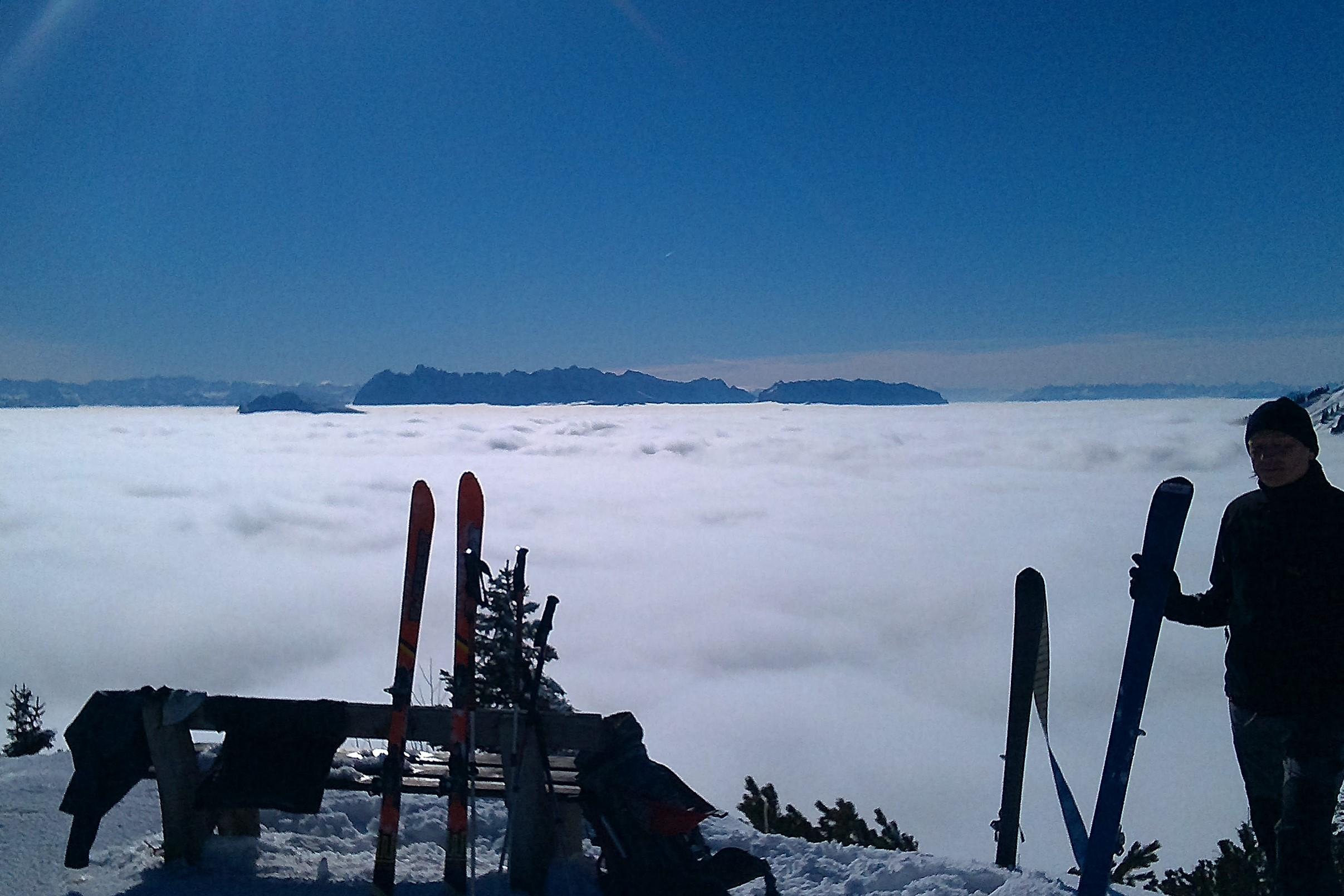 Schneedecke: Da gestern ähnliches Wetter, leichter Harschdeckel über den Wolken. In Schattenbereichen pulvrig.