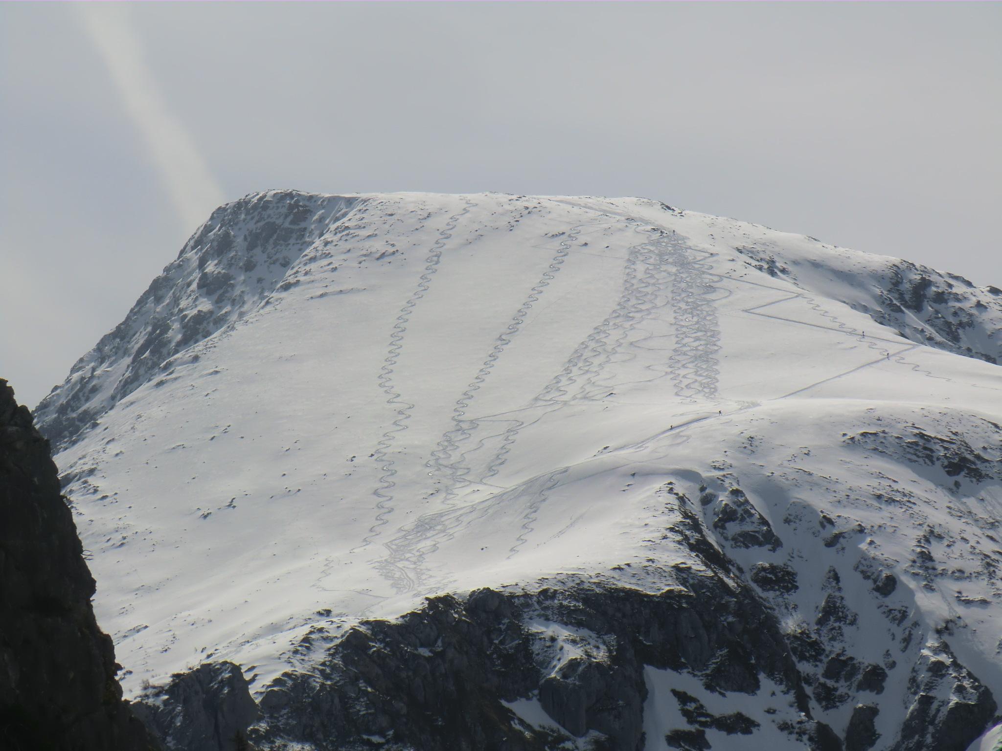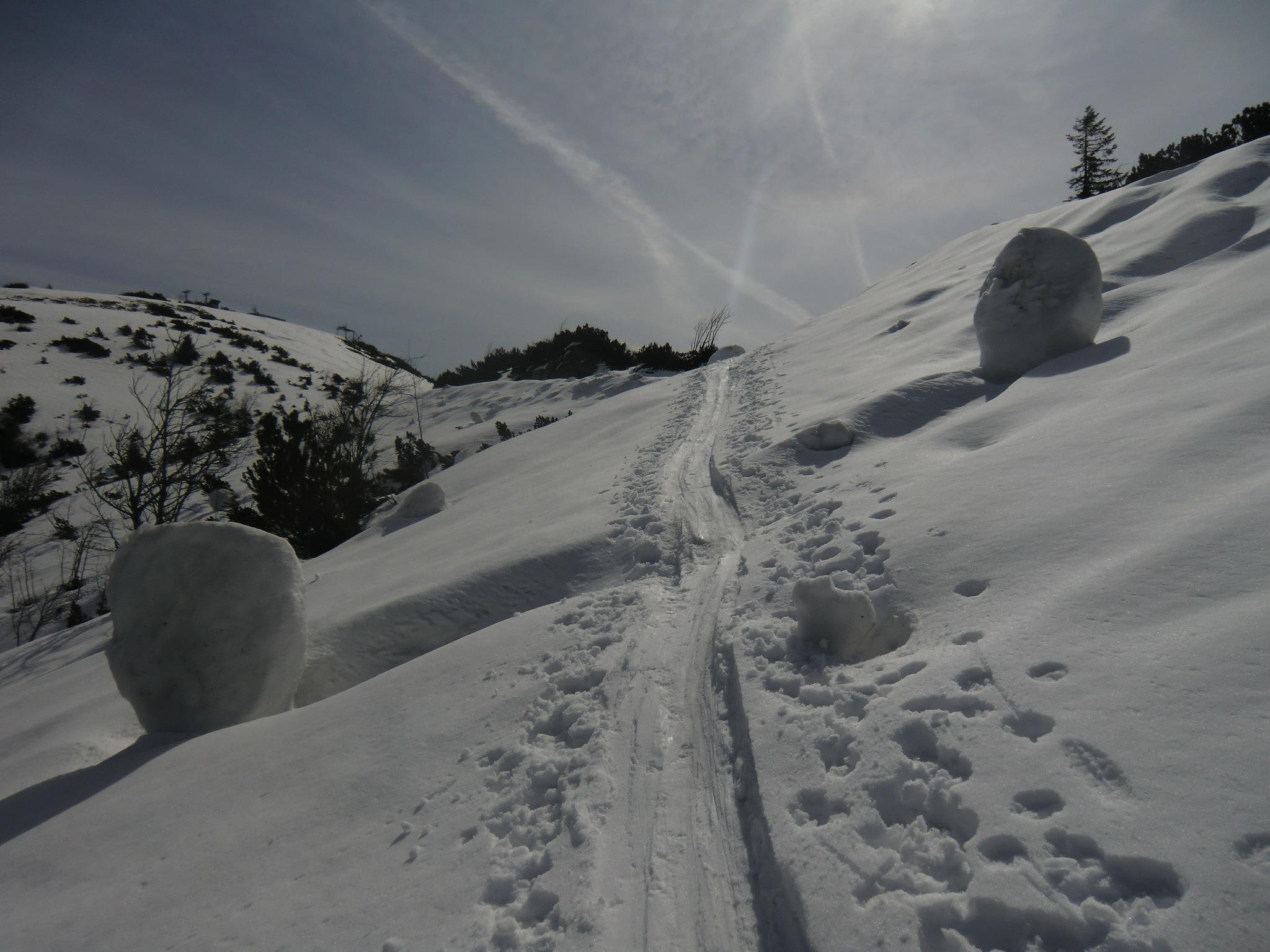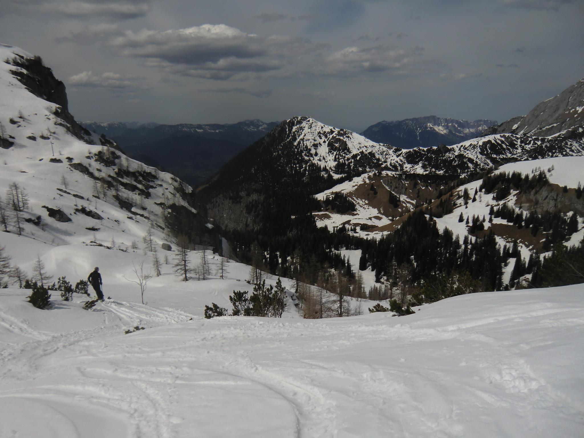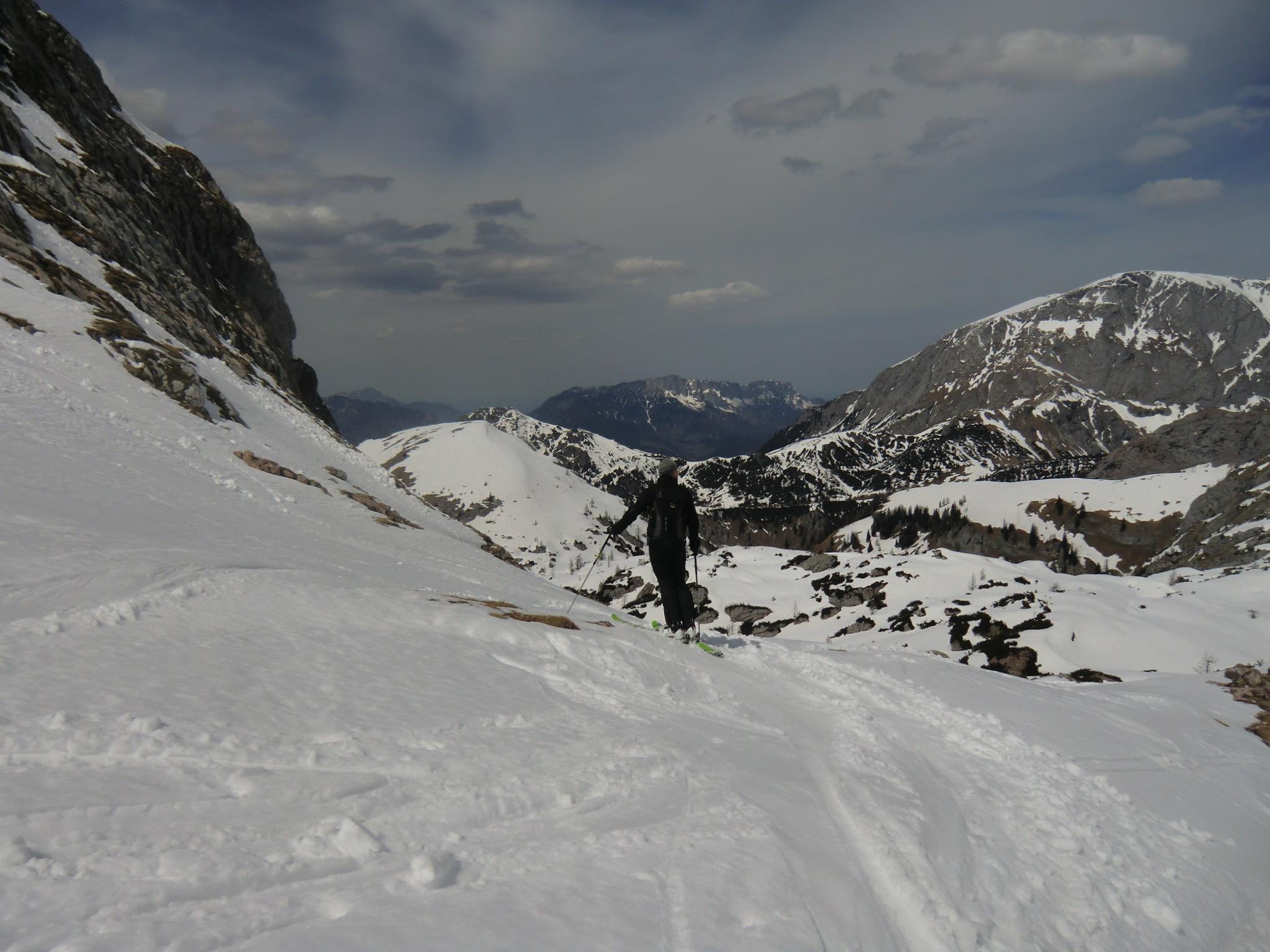 Am Nordalpenrand geht noch was und gar nicht mal so schlecht. Zum Schneiber durchgehend Schnee ab Jenner-Mittelstation. Im Reinersbergbrückerl weiche durchfeuchtete Schneeauflage, aber tragend auf hartem Altschnee. Auch von Königstalalm auf Schneibsteinhaus durchgehend Schnee. Bockskehl wurde auch befahren und hat gut ausgschaut. Am Gipfel windstill, ab 13 Uhr verdecken Schleierwolken die Sonne. Wenig Leute unterwegs. Die Jennerbahn ist noch bis 30.4. außer Betrieb.