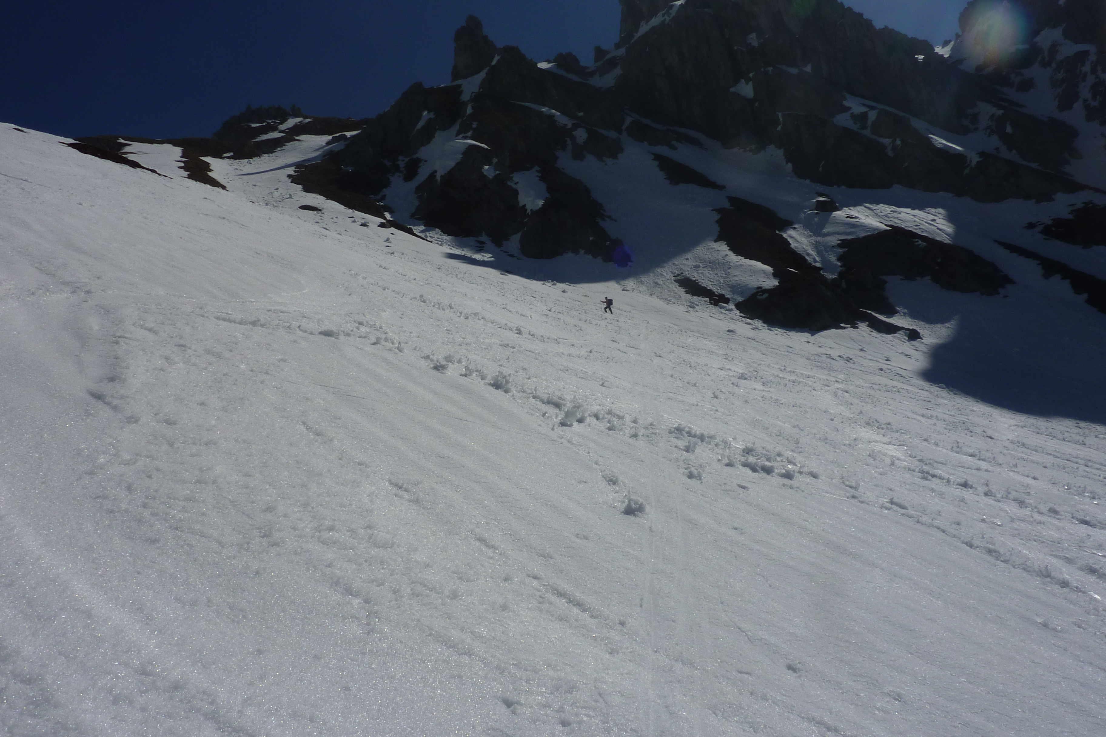 Start um 1/2 9: da hatte es im Aufstieg schon schön aufgefirnt -so ging es ohne Adrenalinschübe und Harscheisen sehr entspannt nach oben. Dafür wars dann - nach windbedingter kurzer "Gipfel"rast- bei der Abfahrt nur kurz firnig, der Rest dann sulzig.