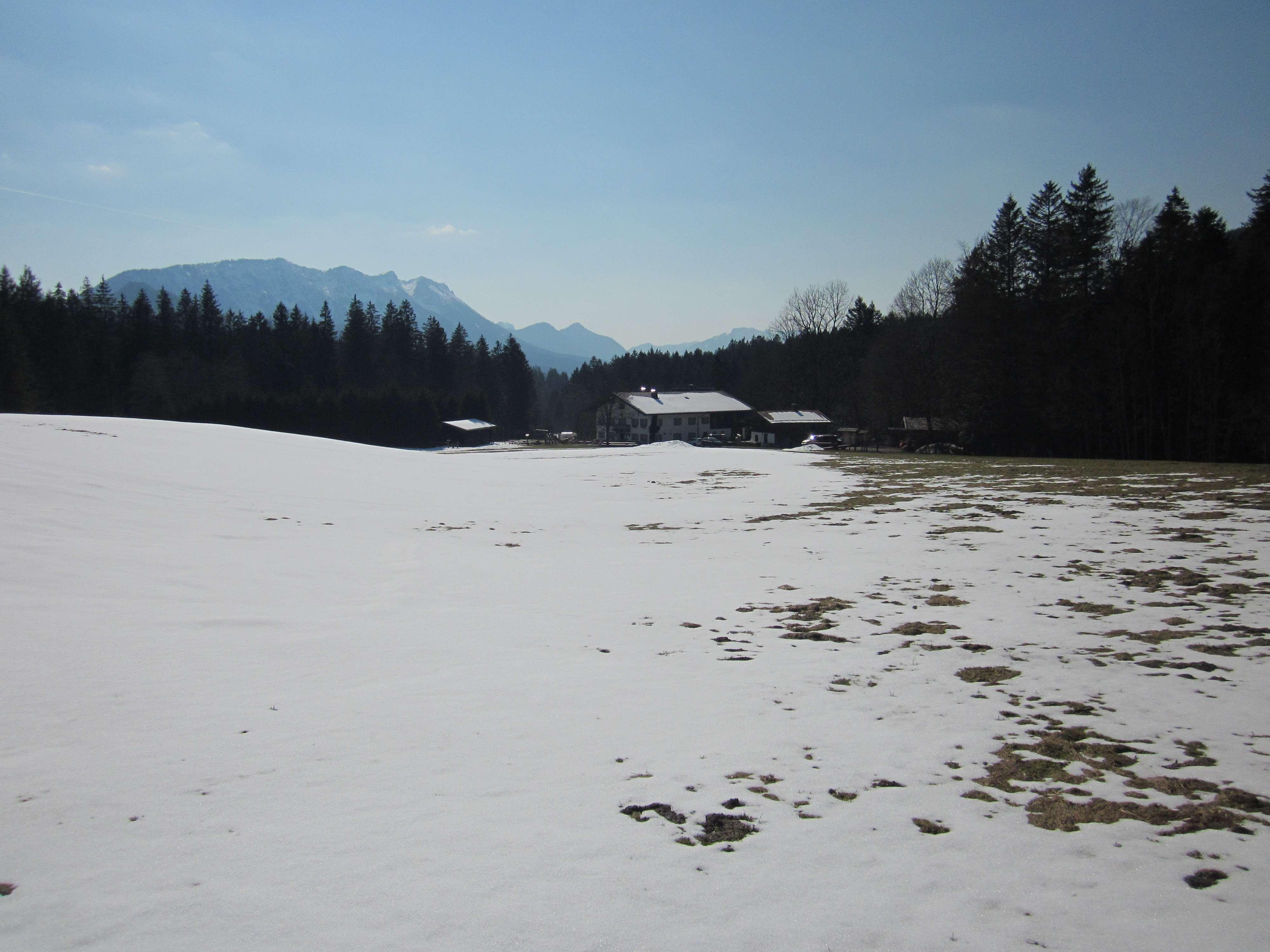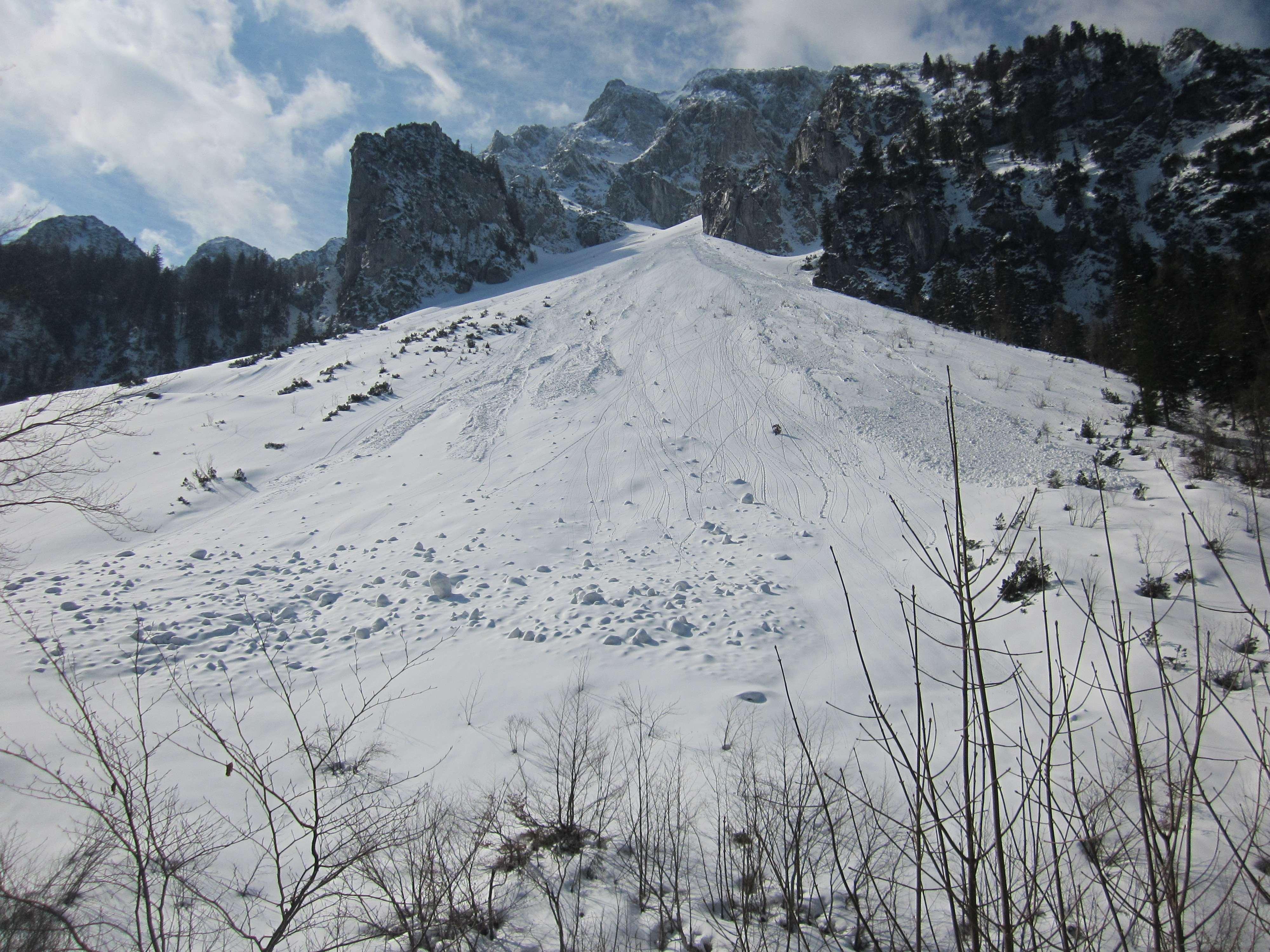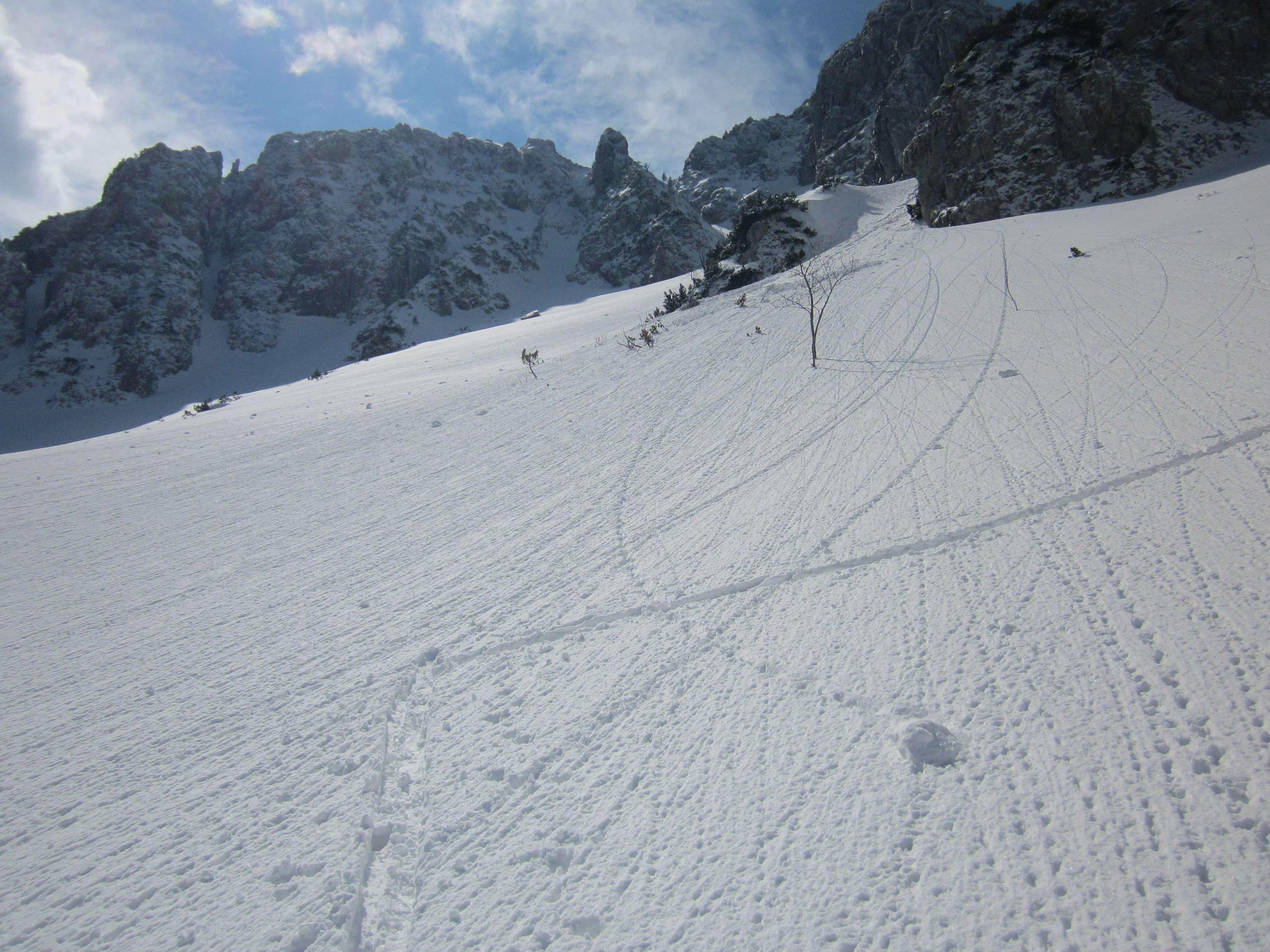 An diesem Tag (mit uns insgesamt 6 Tourengehern) ist keiner ganz rauf. Vielleicht noch der uns entgegenkommende Spätstarter (no später wia i - des hoaßt wos! :-)) Die Schneedecke dürfte sich bis spätnachmittags im Nordsektor über 1300 allerdings kaum gesetzt haben. Zu kalt und zu wenig Sonneneinstrahlung.