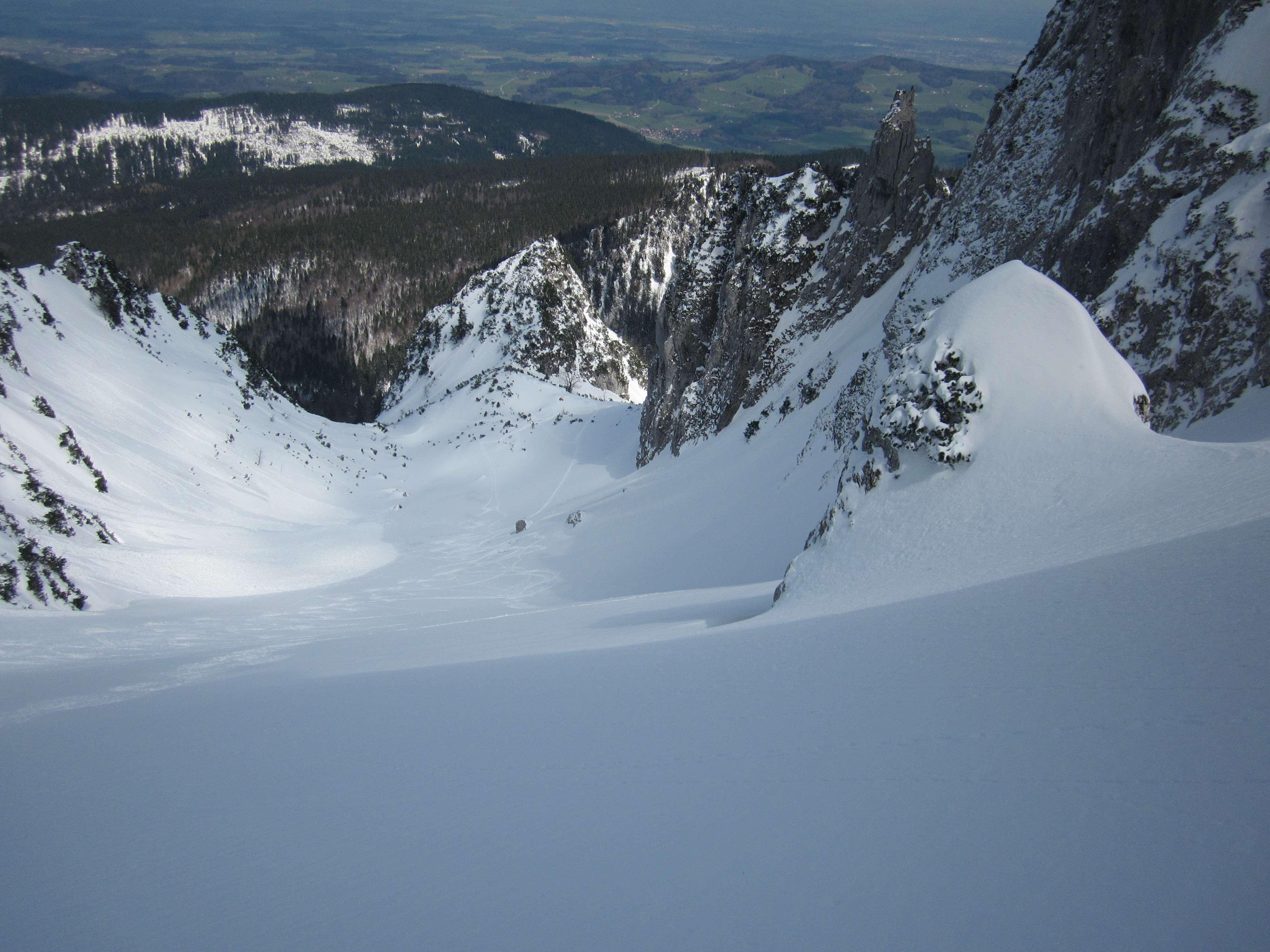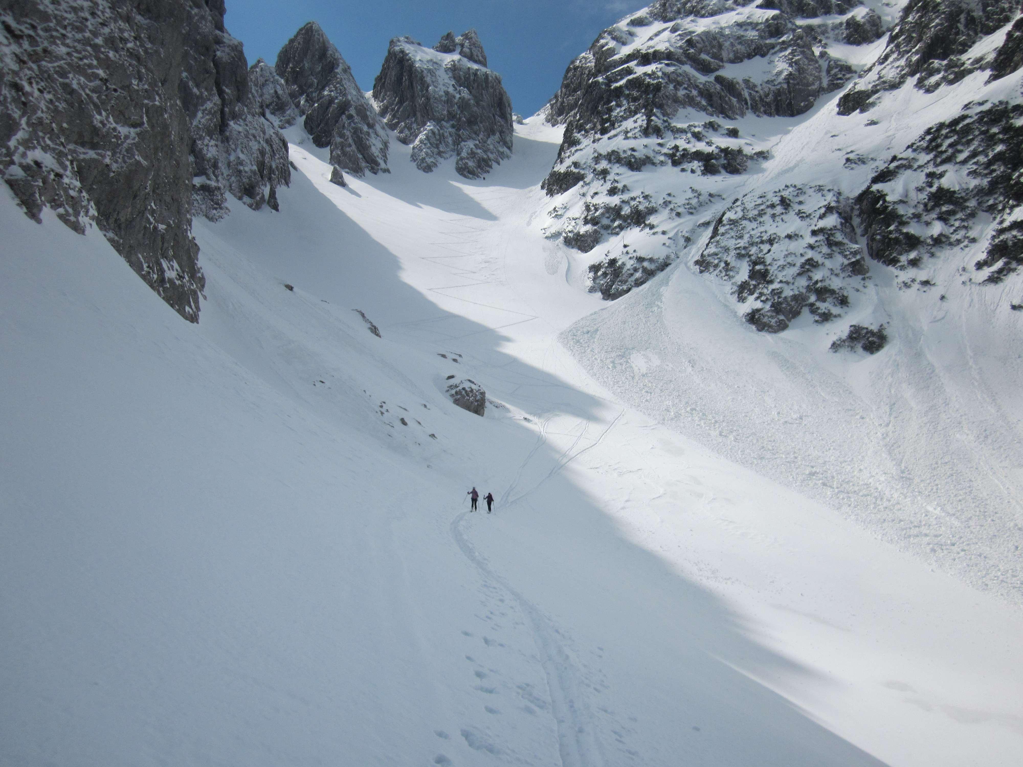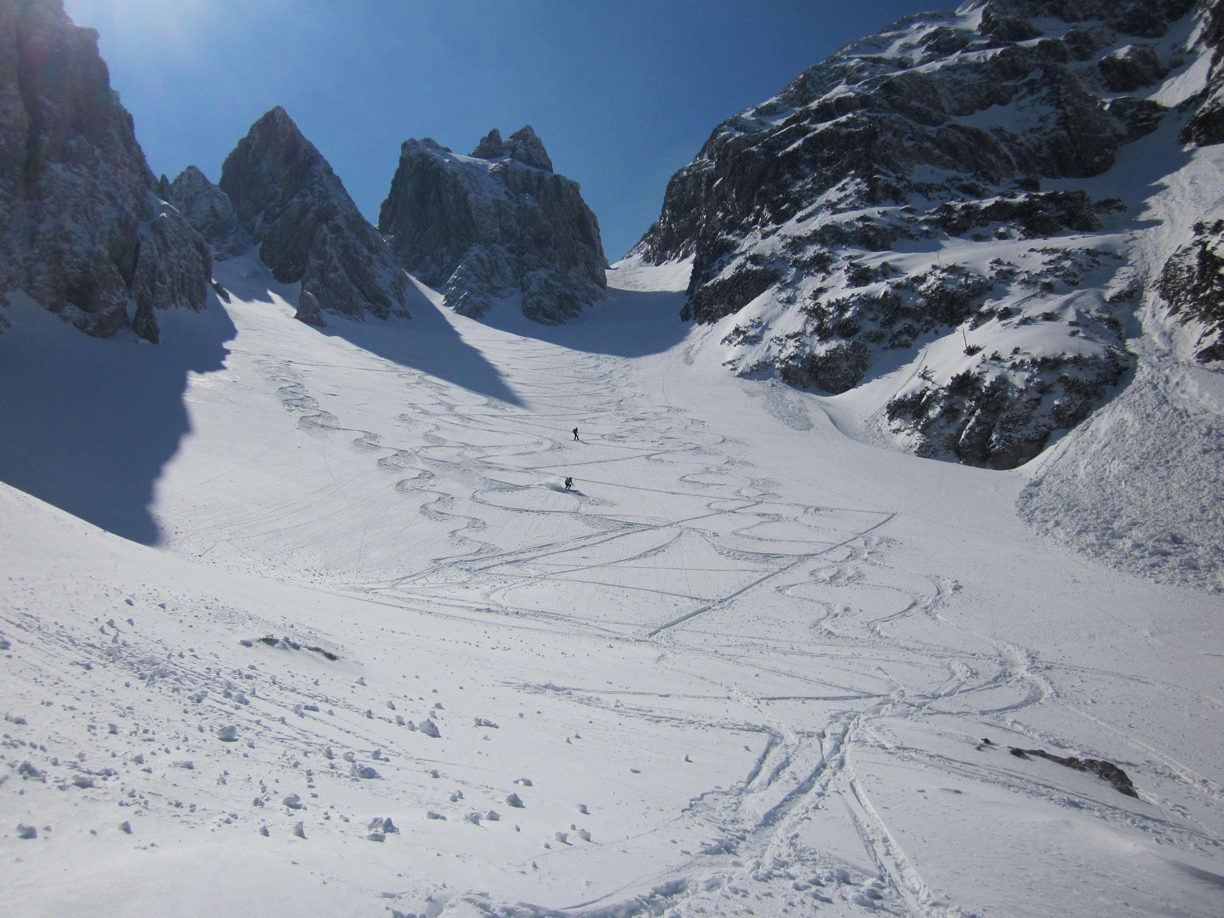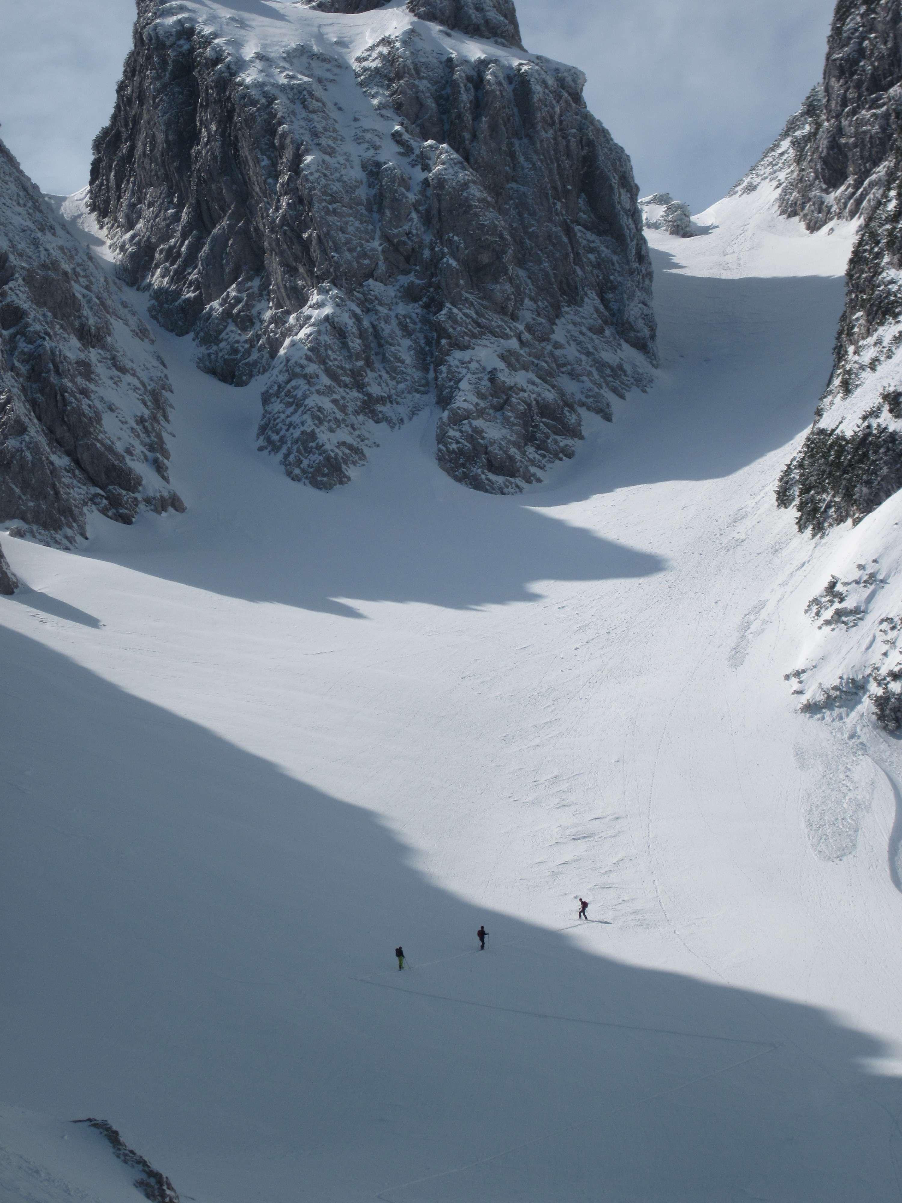 oba ned ganz. In den Ausstiegen der Rinnen viel Schnee mit Windspuren auf eisiger Unterlage.