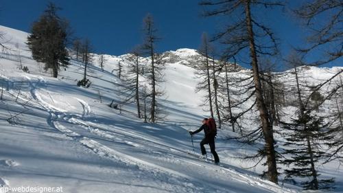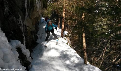 Das Wichtigste am heutigen Tag war neben dem obligatorischen Check des Lawinenlageberichts (Hohe Tauern heute 2) das richtige Timing. Start um 7 Uhr beim Parkplatz Stockham. Wir entschieden uns für die direkte Variante über den Lientalgraben in Richtung Gstößalm aufzusteigen. Auf dem steilen Waldweg lag noch ausreichend Schnee und da auf diesem noch nicht allzuviele abgerutscht sind war dieser auch noch halbwegs griffig.