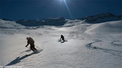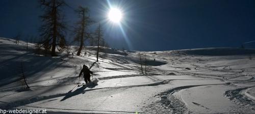 Die 1400 Hm hindernisfreie Pulverabfahrt neigt sich dem Ende zu
