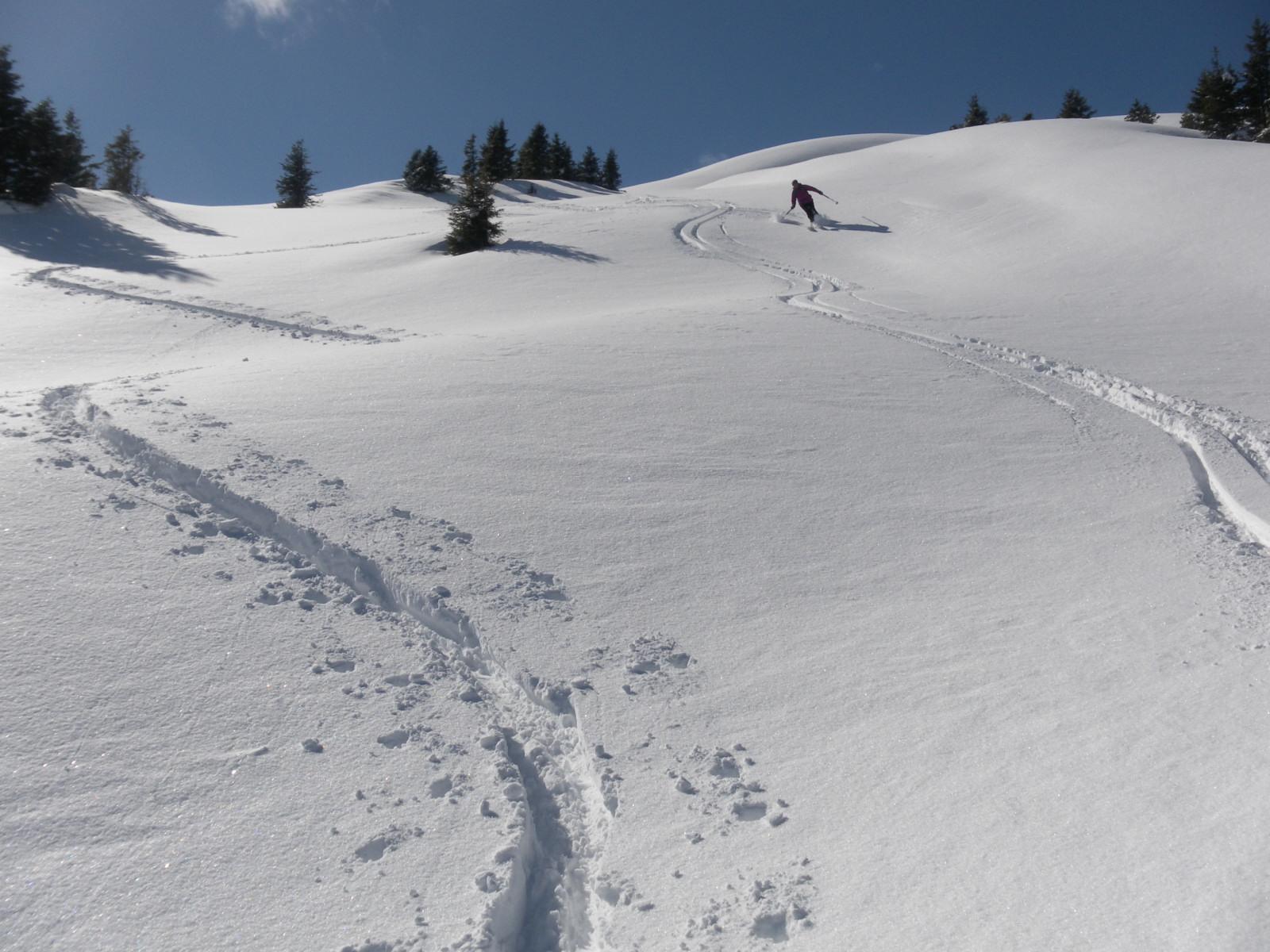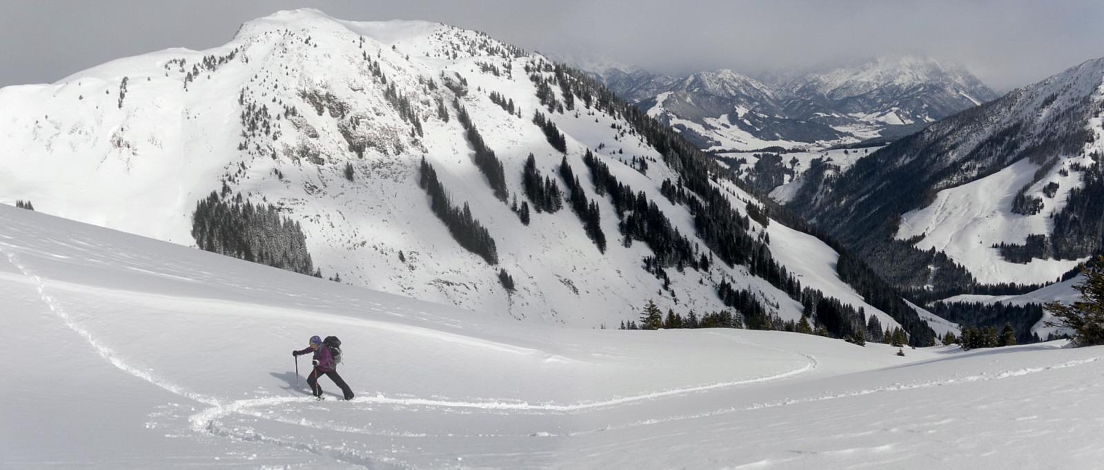 Der Pletzergraben ist noch ohne Unterbrechung mit Ski befahrbar. Die Hänge der Lachtalalm bieten leicht angefeuchteten Pulver, der in Kammnähe immer trockener wird. Um den felsigen Vorgipfel entspannt sich die vermeintlich lockere Schneedecke mit viel Wumm. Wir spuren die gesamte Tour ein und sind am Gipfel allein - seltsam. Eine Traumpulverabfahrt über hindernislose Wiesen und ein ruhiges Talausgleiten vervollständigen eine wunderschöne Skitour.