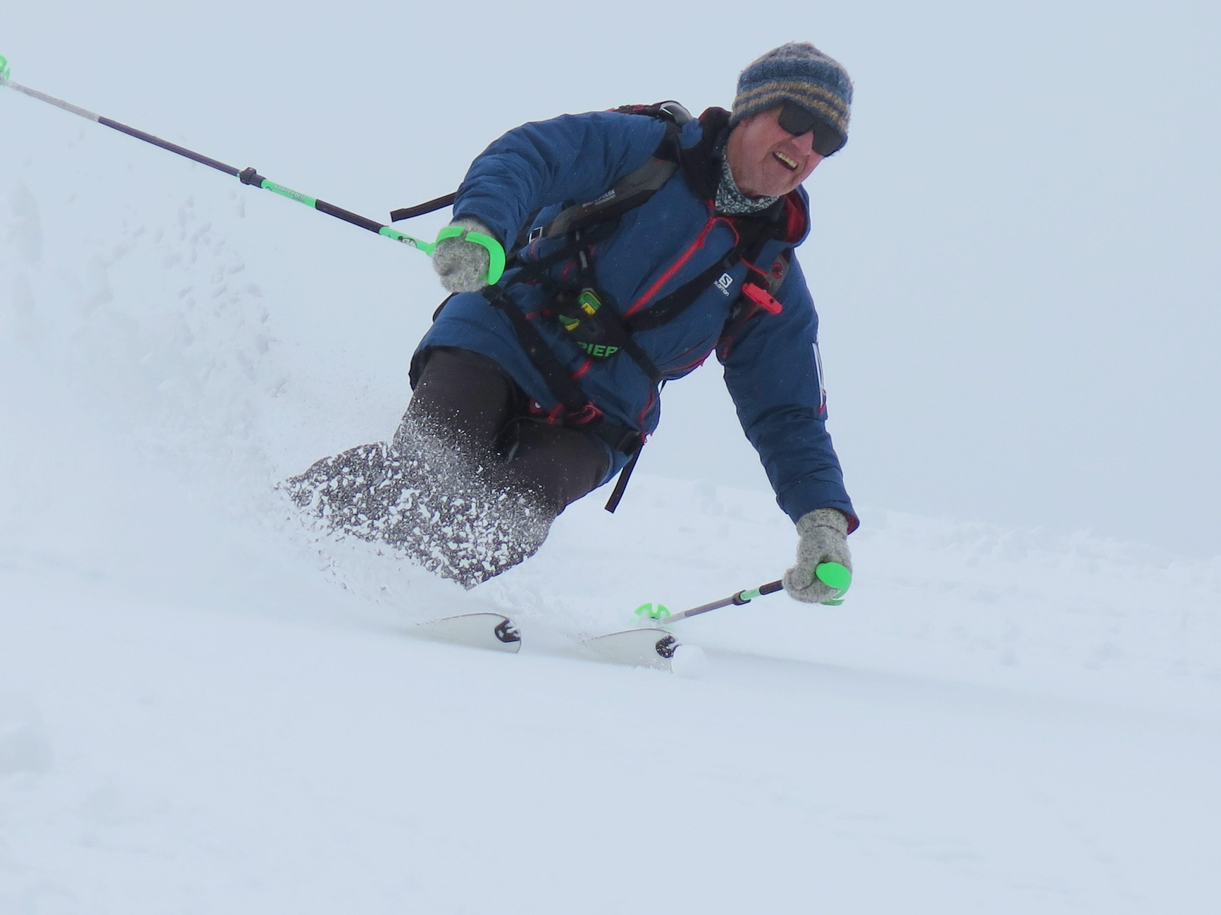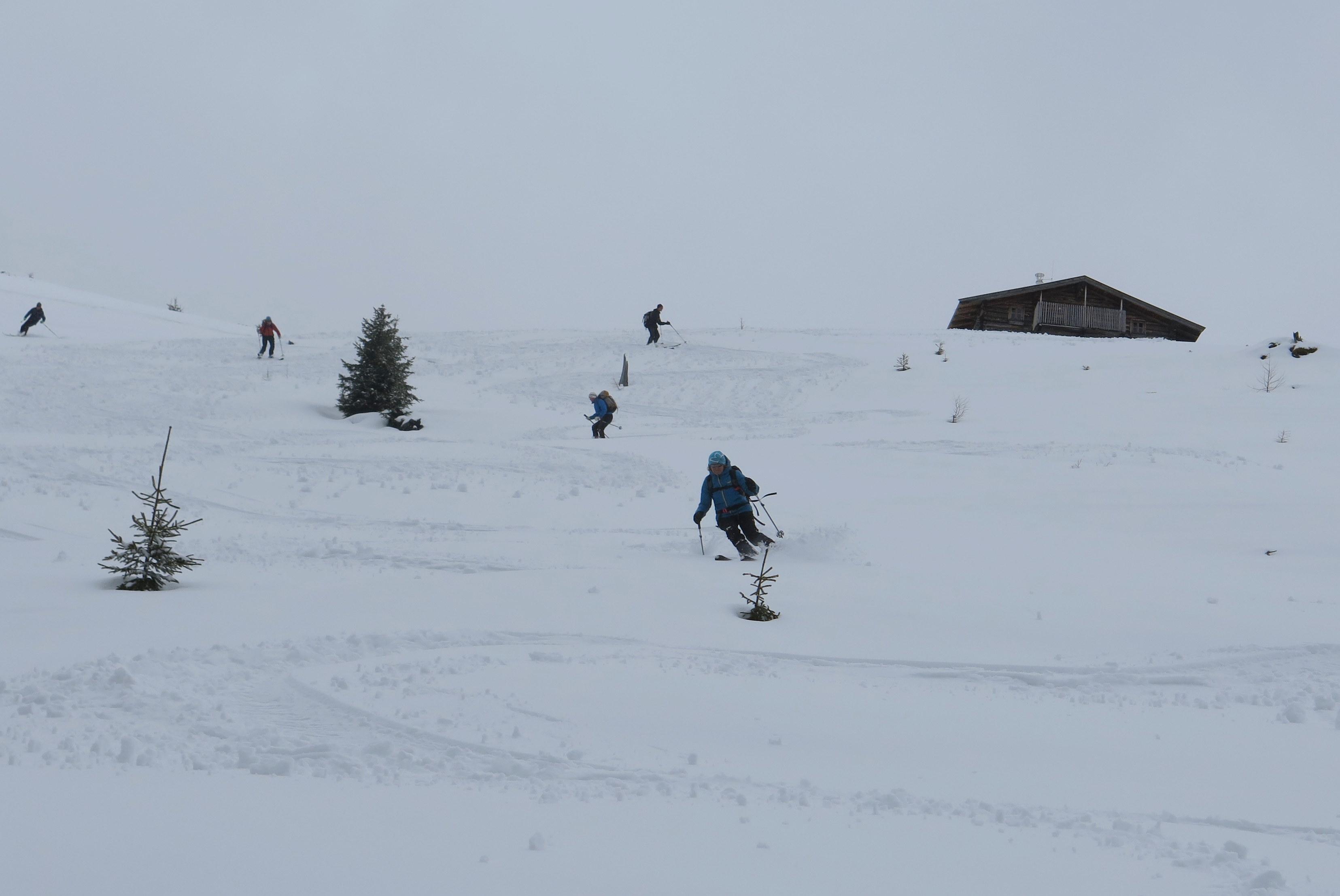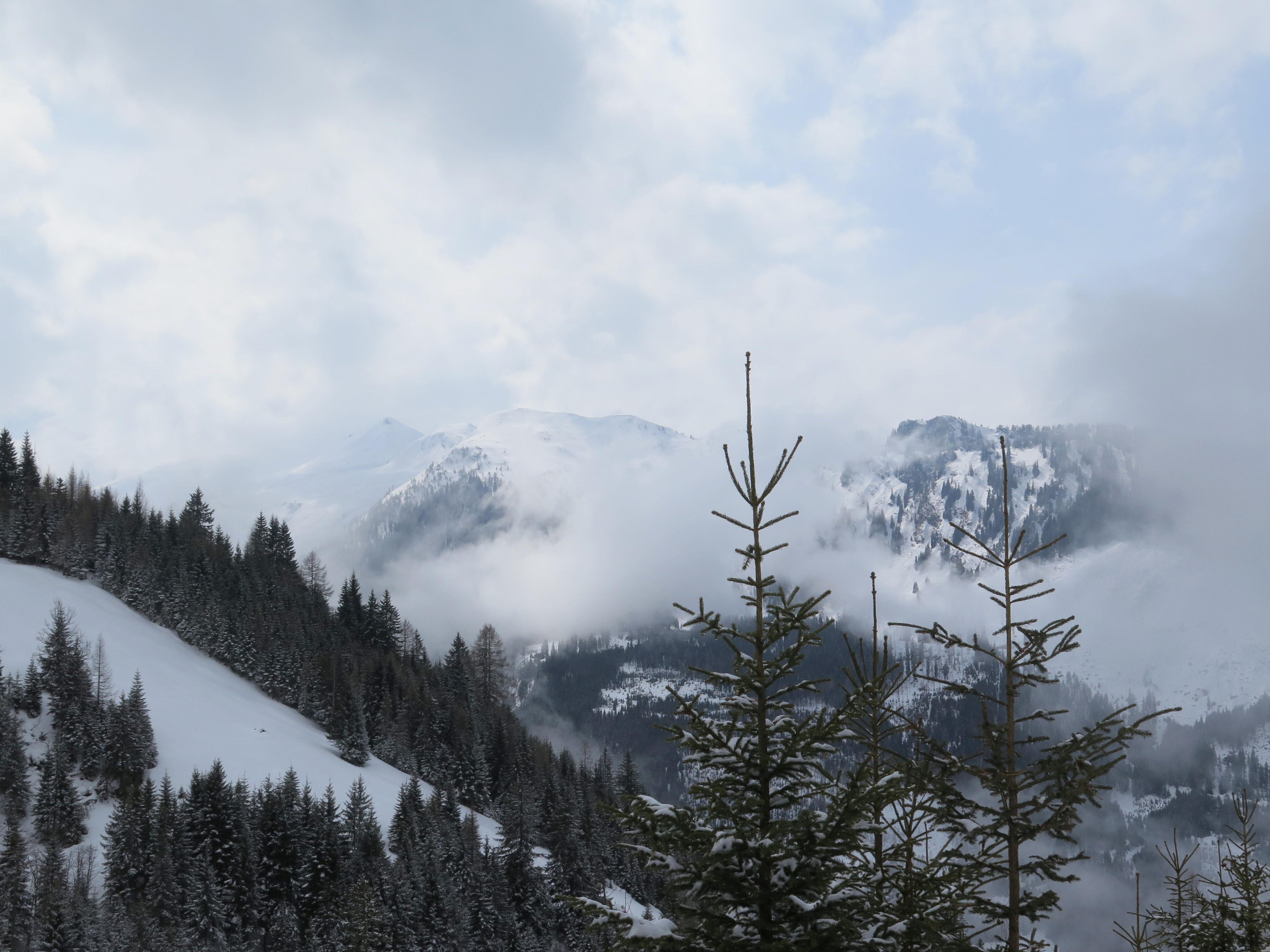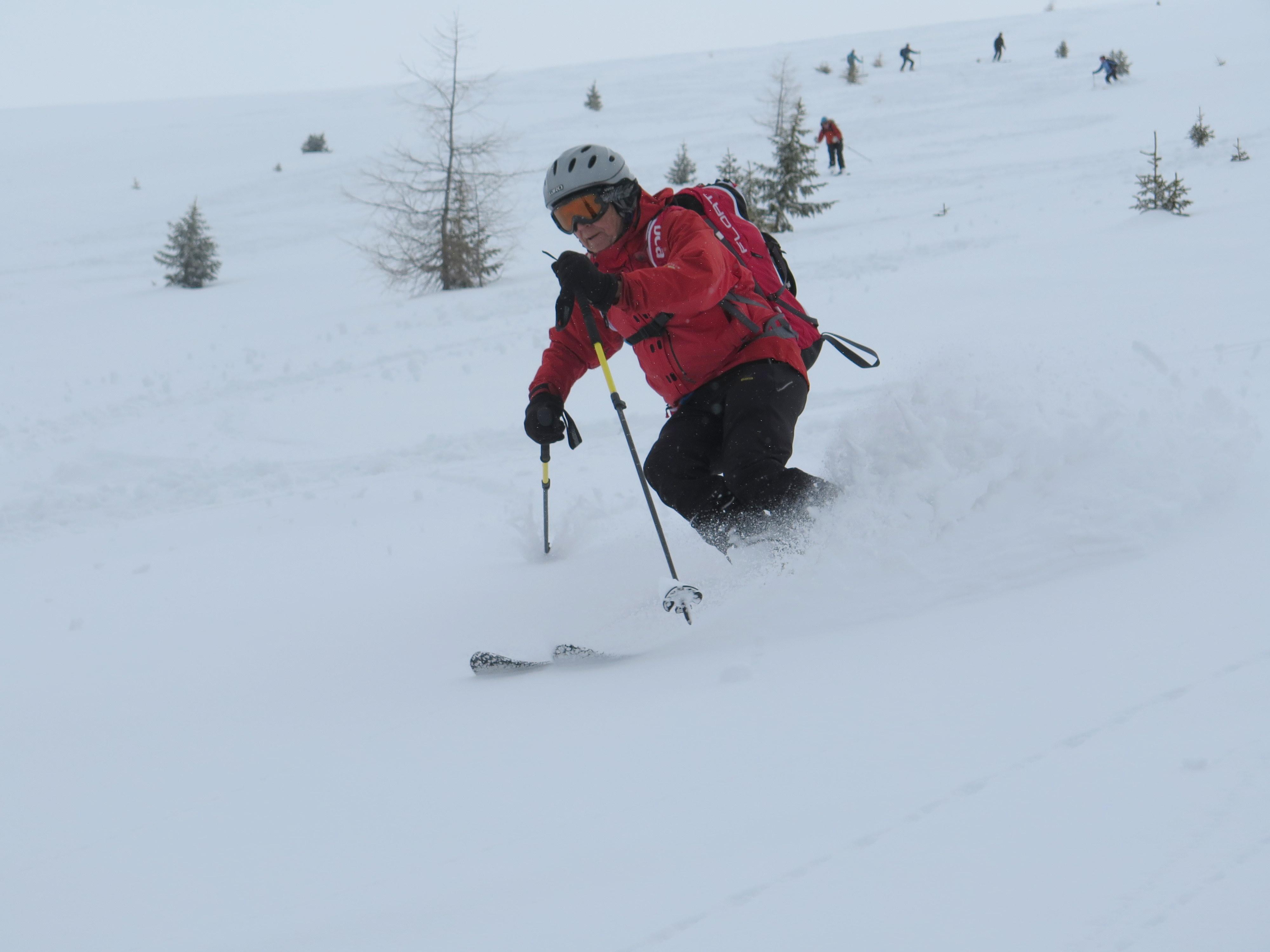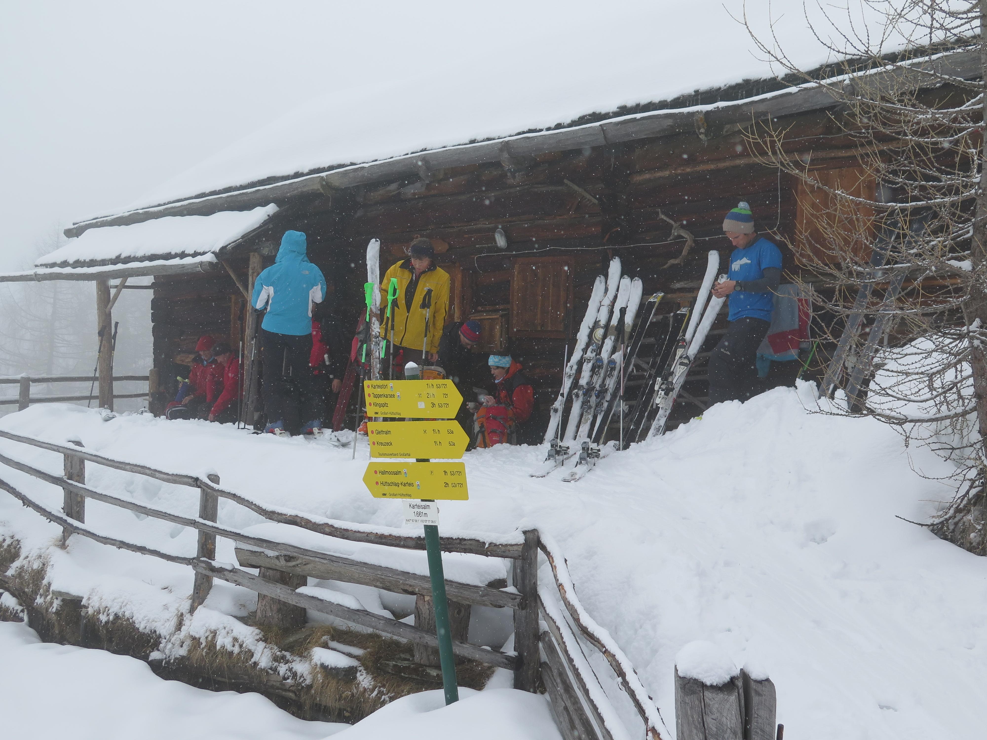Der angekündigte Schlechtwetter-Einbruch stellte sich pünktlich über Nacht ein und brachte einige Zentimeter Neuschnee, der bei der Auffahrt zur Halmoosalm aber erst bei den allerletzten Kurven soweit liegenblieb, dass die Autofahrer gefordert waren. Die Spuranlage bei immer schlechter werdender Sicht in Richtung Gipfel verlangte gleichfalls einen sensiblen Sensor im Sprunggelenk. Umso erfreulicher dann der nicht mehr ganz erwartete Spaß eines bestens zu fahrenden "Märzen-Pulvers" in der weiteren Abfahrt.