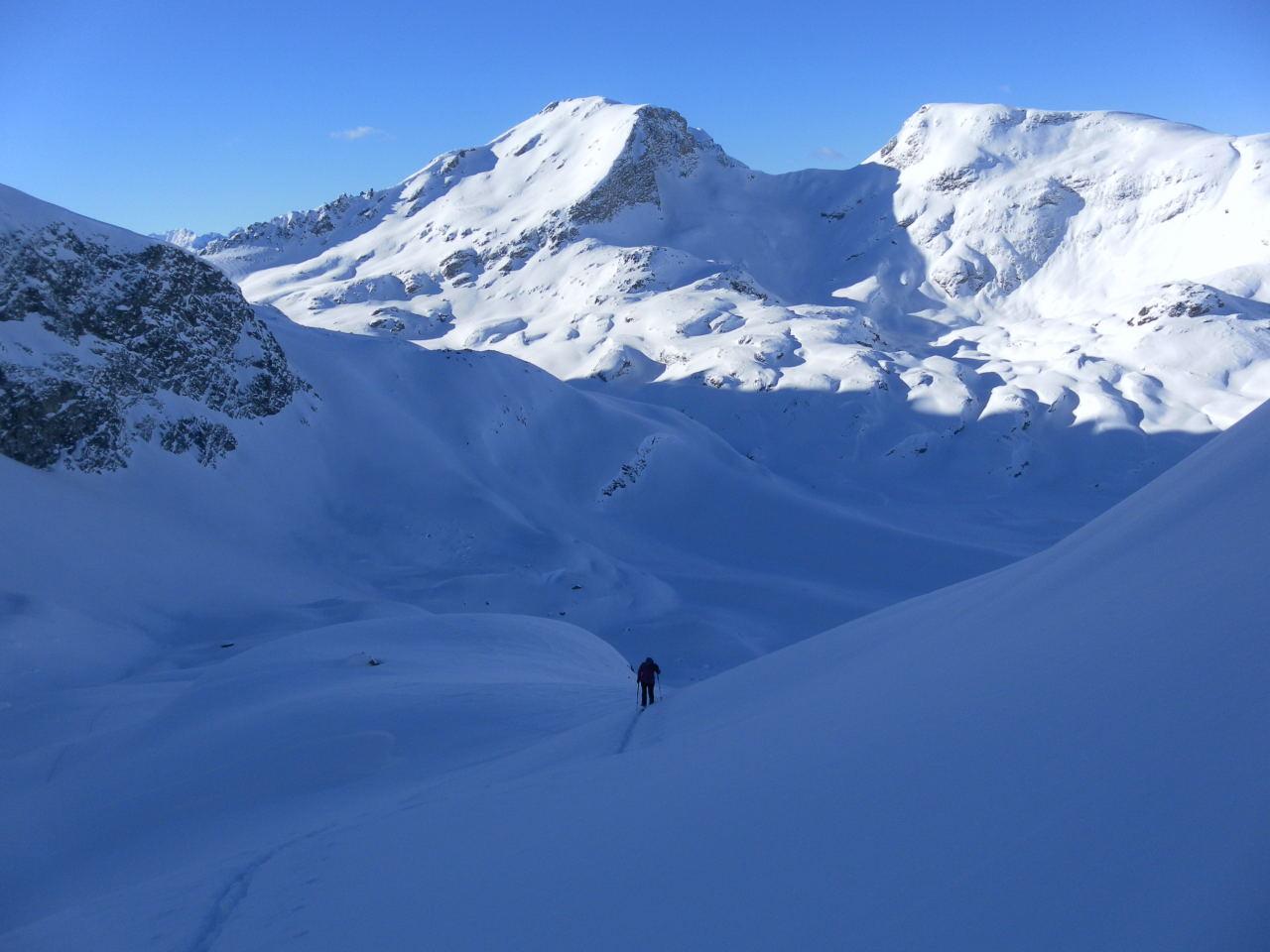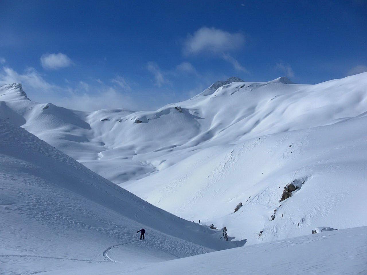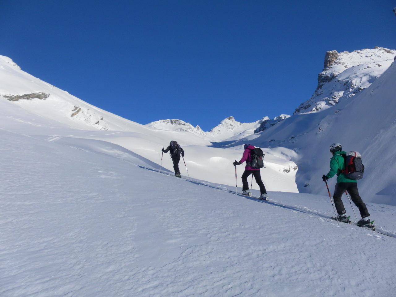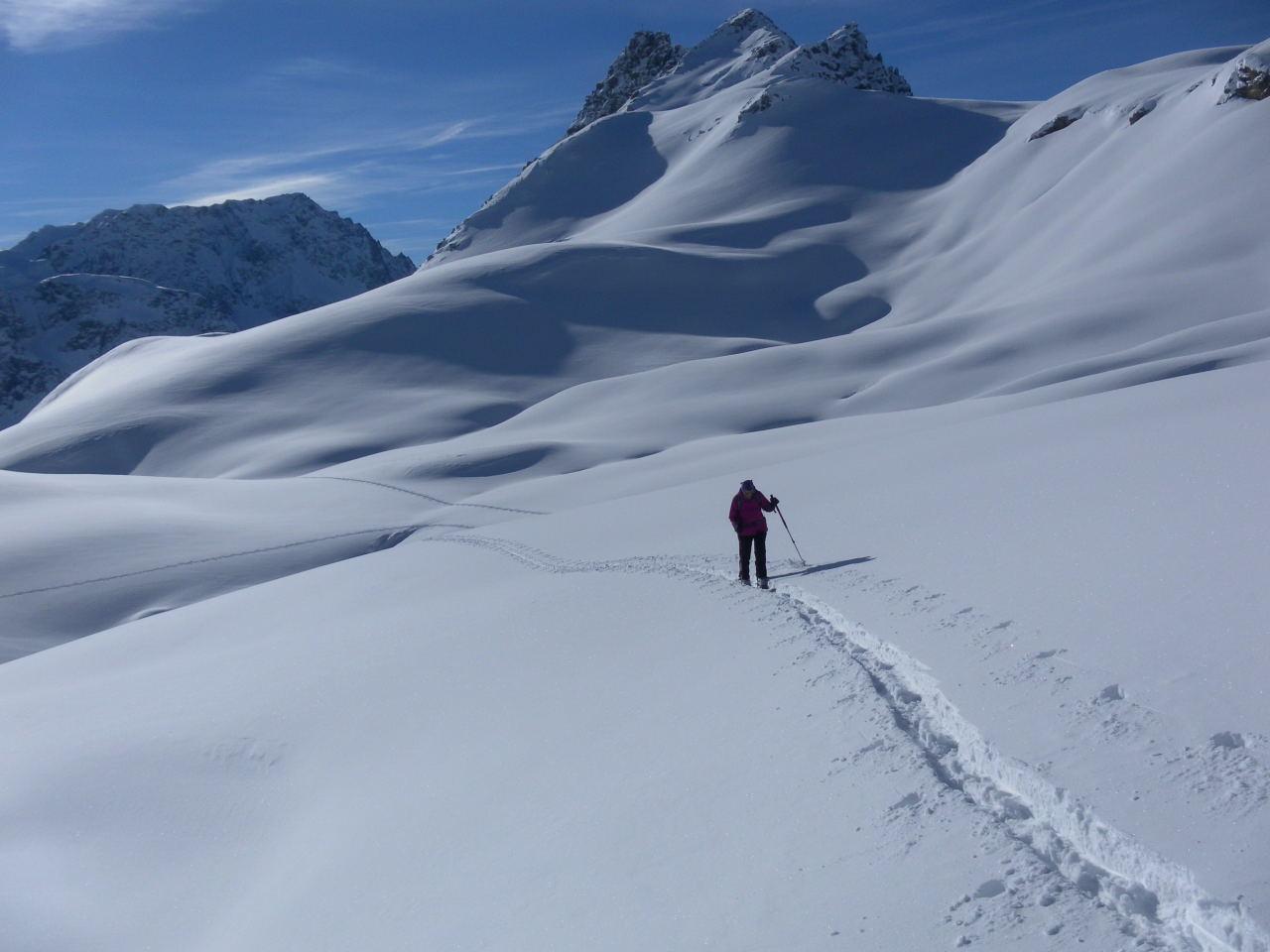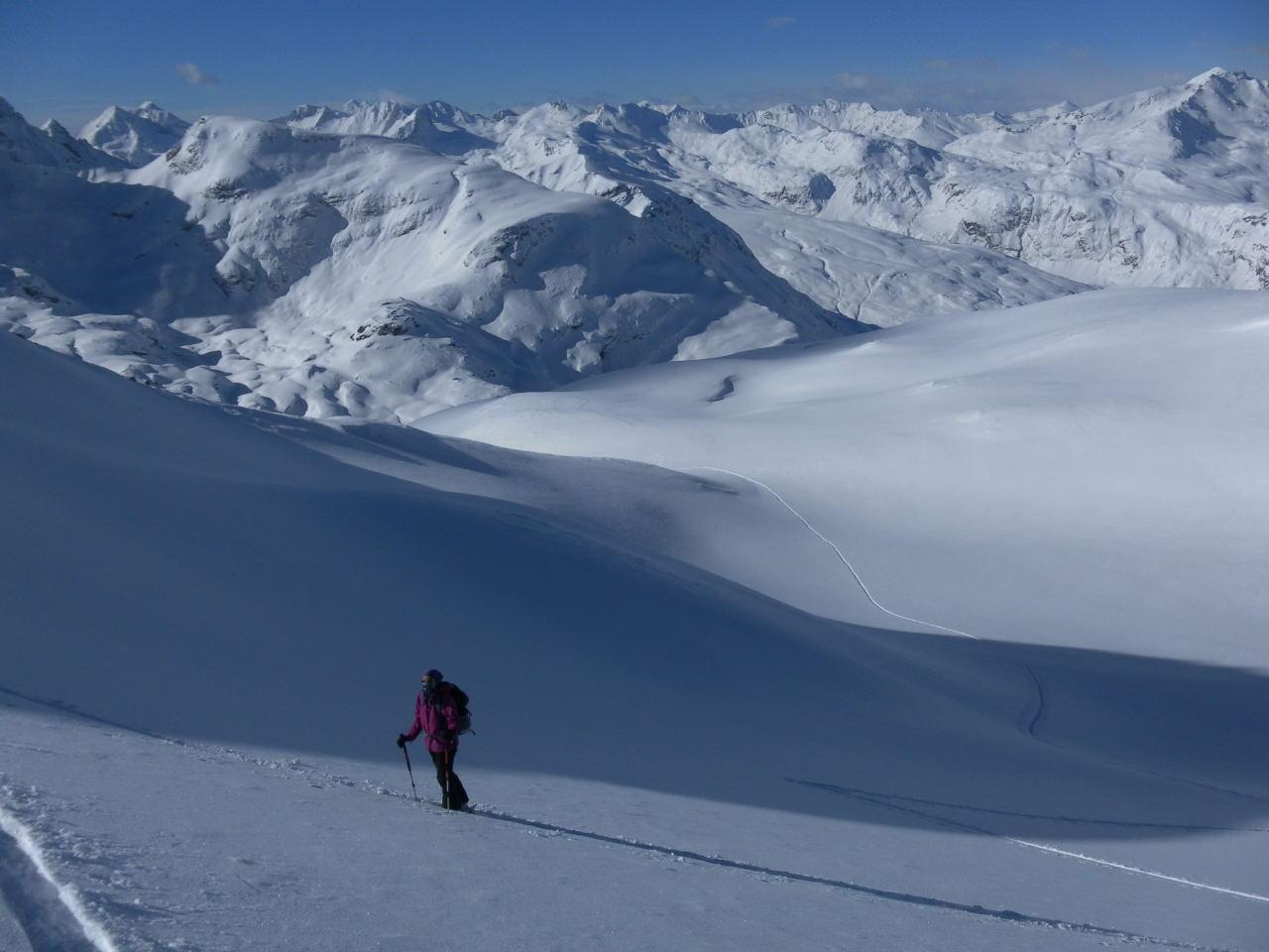 Erstaunlicherweise ließ sich jeden Tag mit entsprechender Umsicht und viel Spurarbeit ein erreichbares Ziel ausmachen: Roccabella 2727m, Piz d´Agnel 3204m, Piz da las Coluonnas 2960m, Piz Surgonda 3196m, Corn Suvretta 3072m.