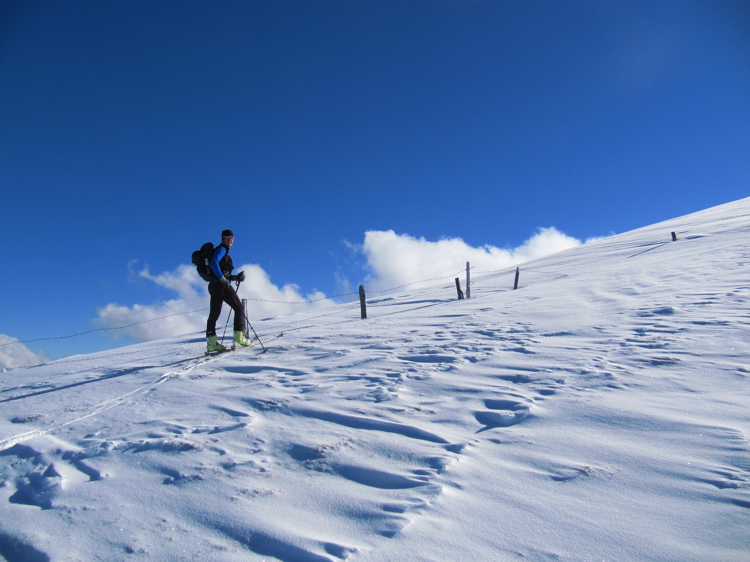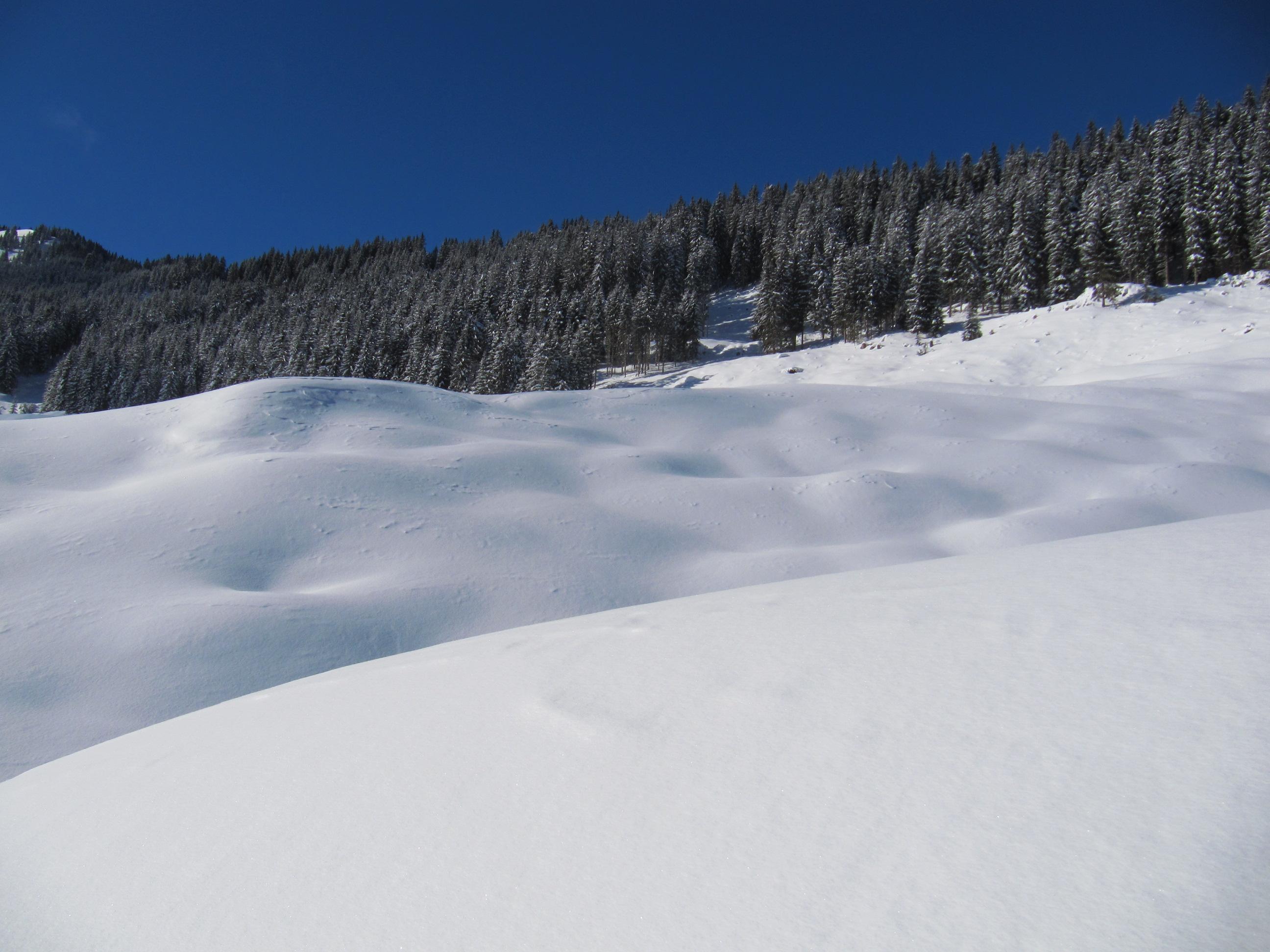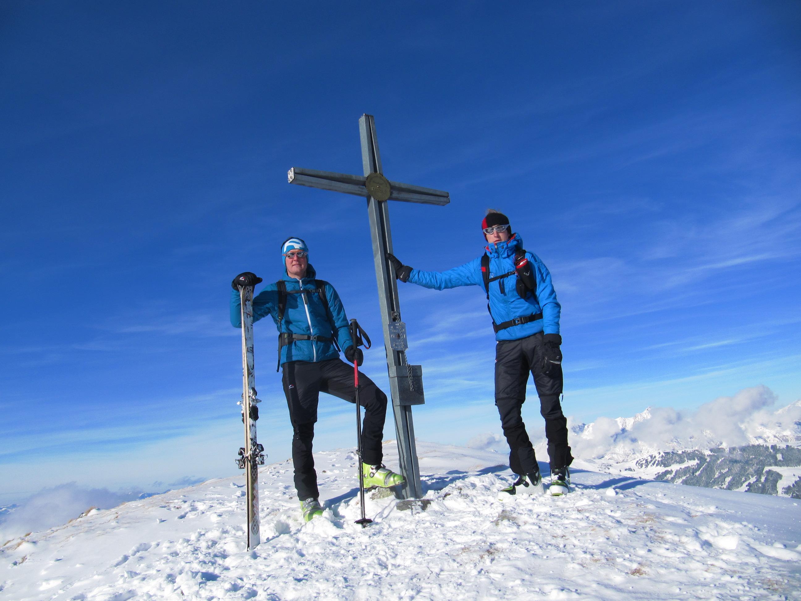 Verhältnisse: Unverspurter Pulverschnee aber schon im unteren Bereich Spannungen in der Schneedecke erkennbar. Der Grat aufgrund des drehenden Windes der vergangenen Tage stark abgeblasen. Auf der Ostseite starke Triebschneeablagerungen aber auch westseitig in Kammnähe teilweise große Schneeablgerungen.