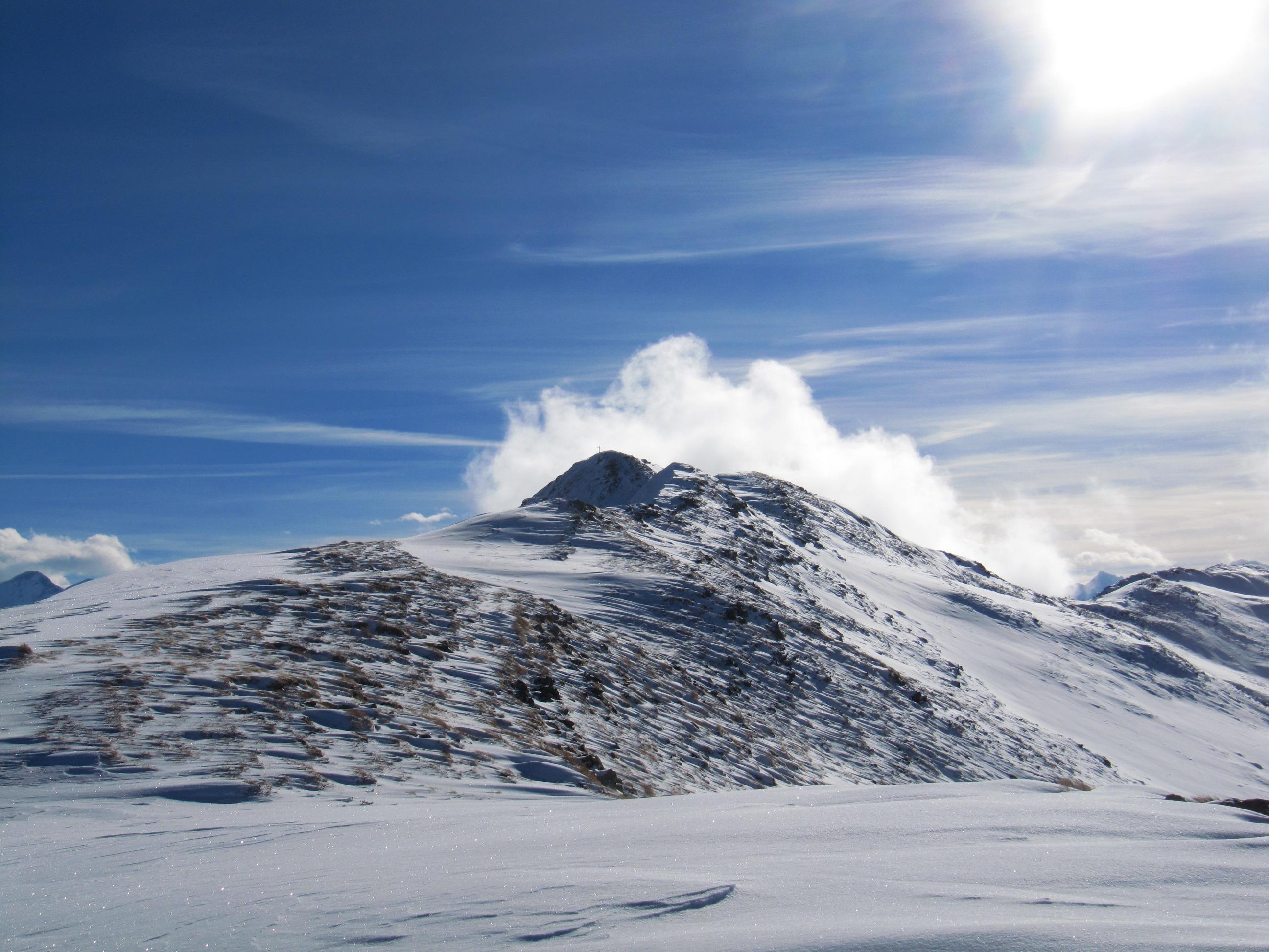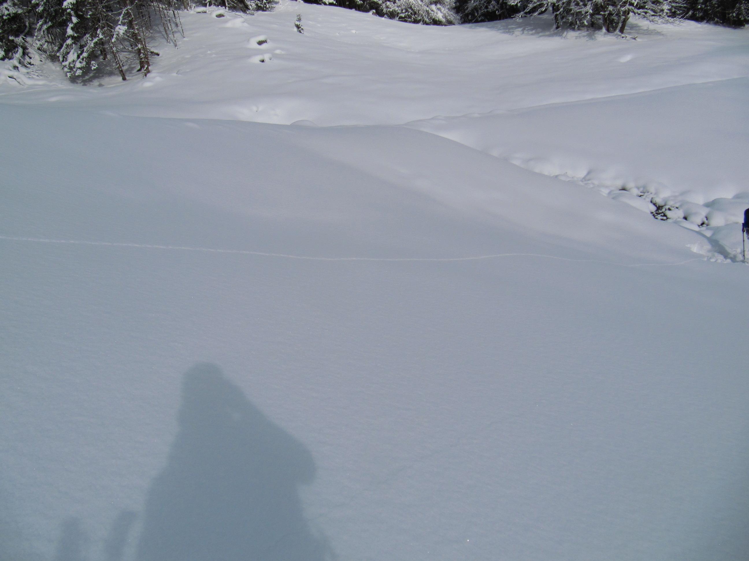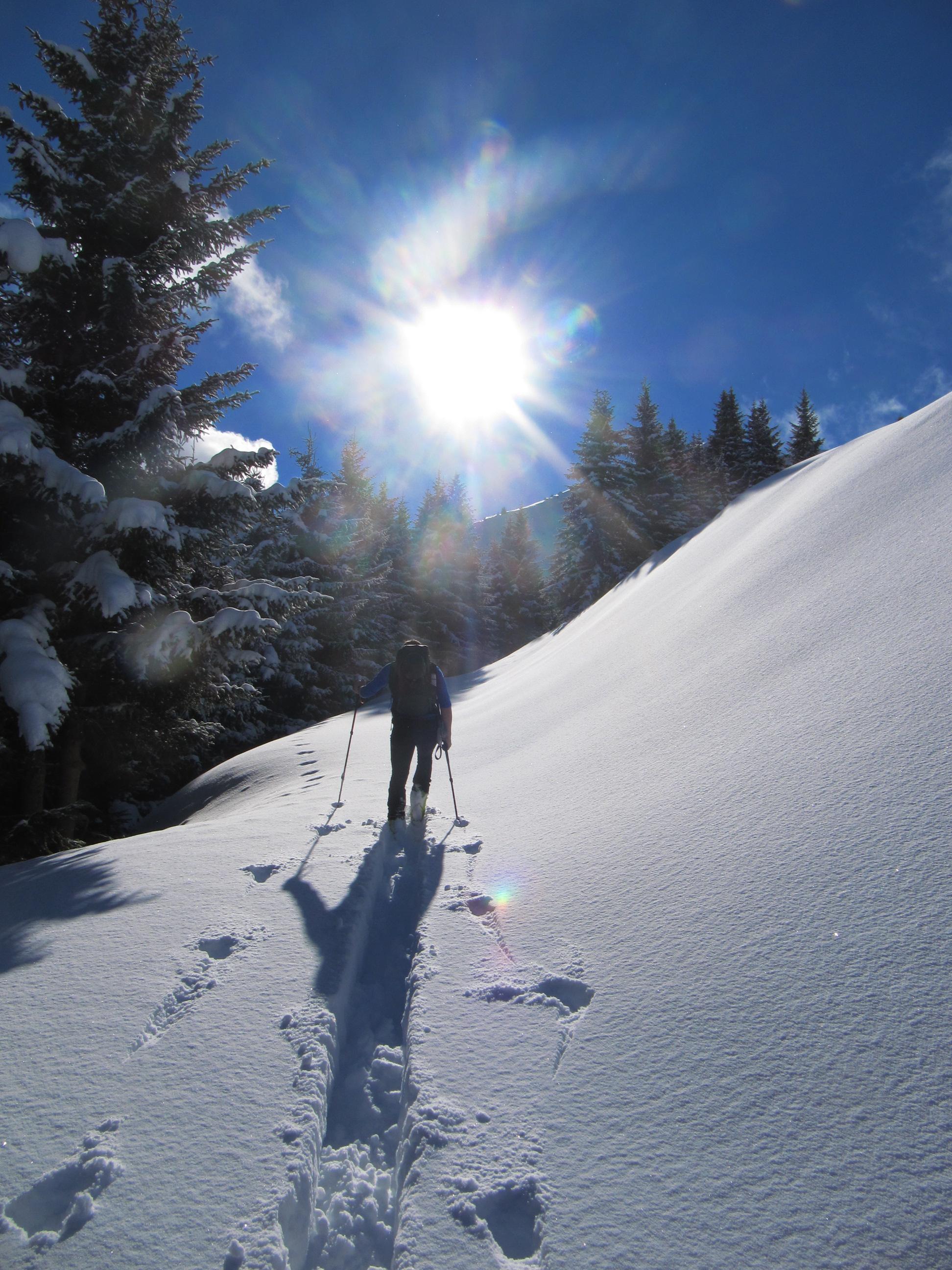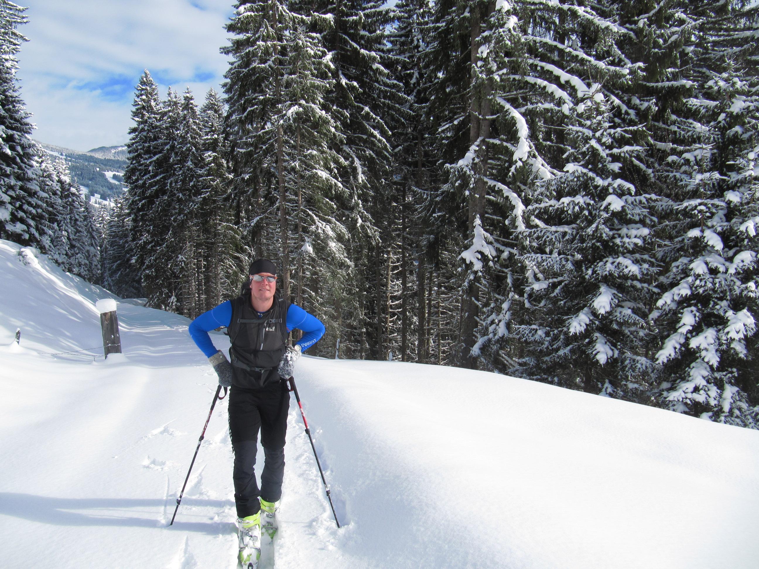 Verhältnisse: Unverspurter Pulverschnee aber schon im unteren Bereich Spannungen in der Schneedecke erkennbar. Der Grat aufgrund des drehenden Windes der vergangenen Tage stark abgeblasen. Auf der Ostseite starke Triebschneeablagerungen aber auch westseitig in Kammnähe teilweise große Schneeablgerungen.
