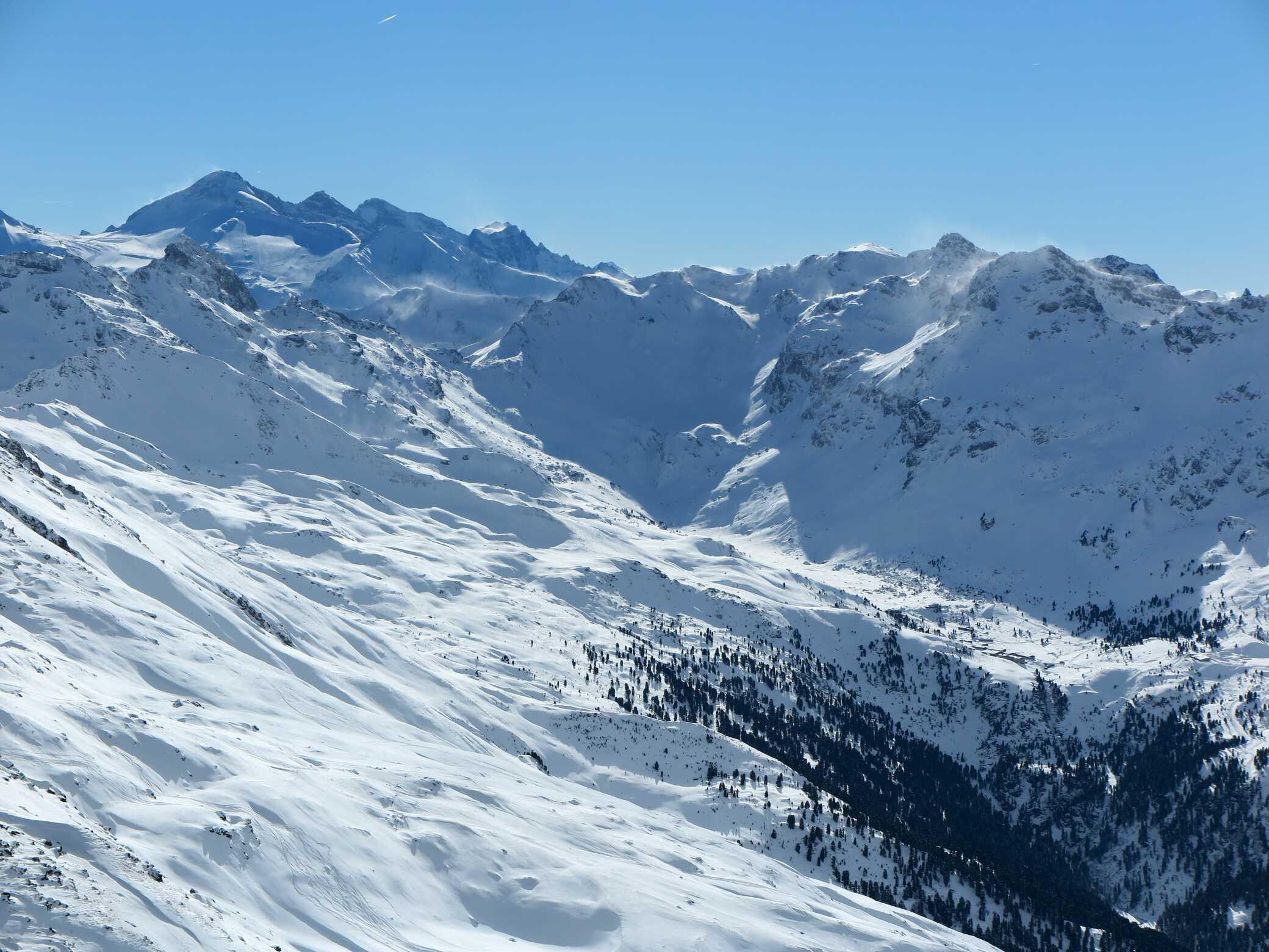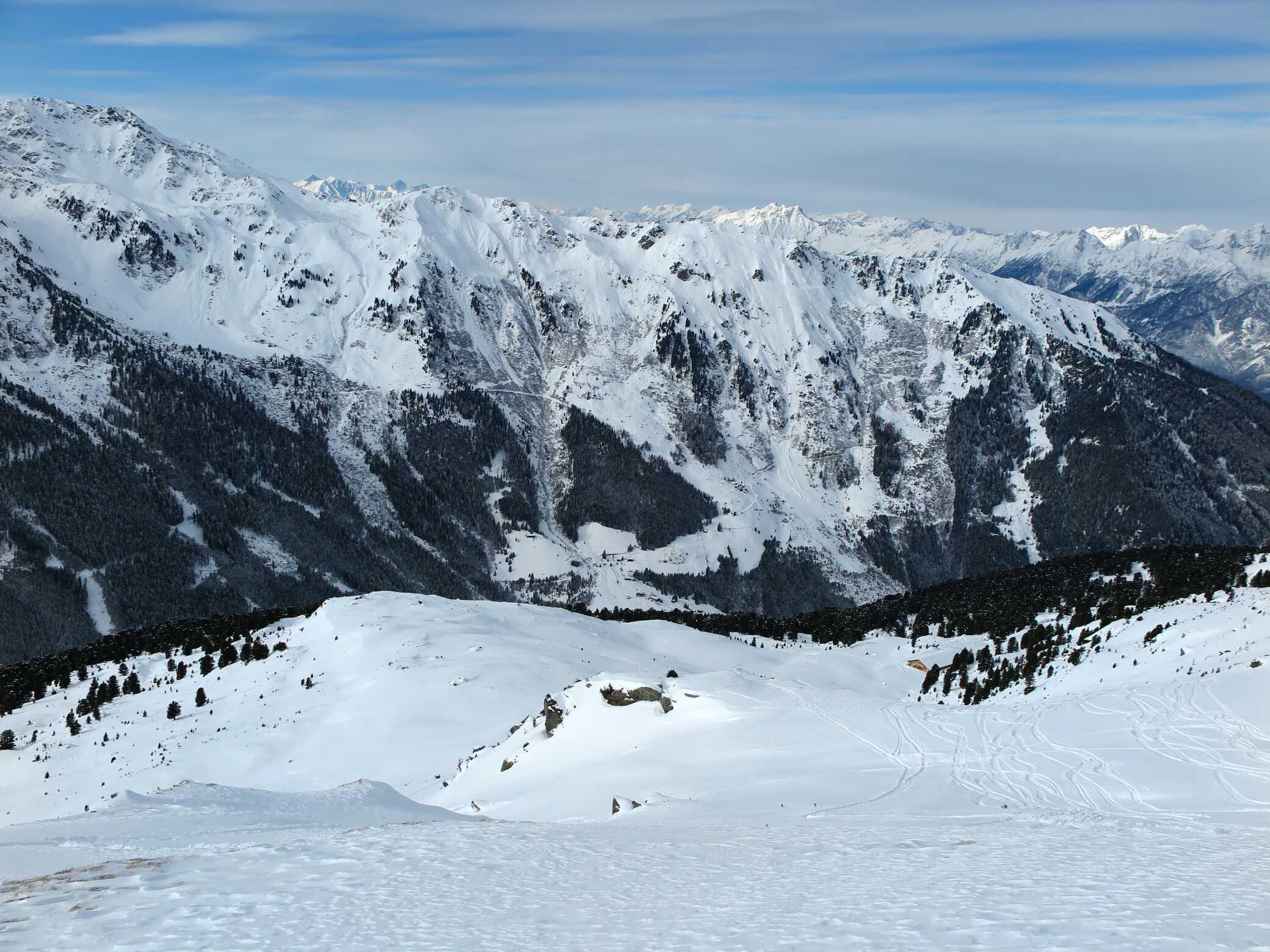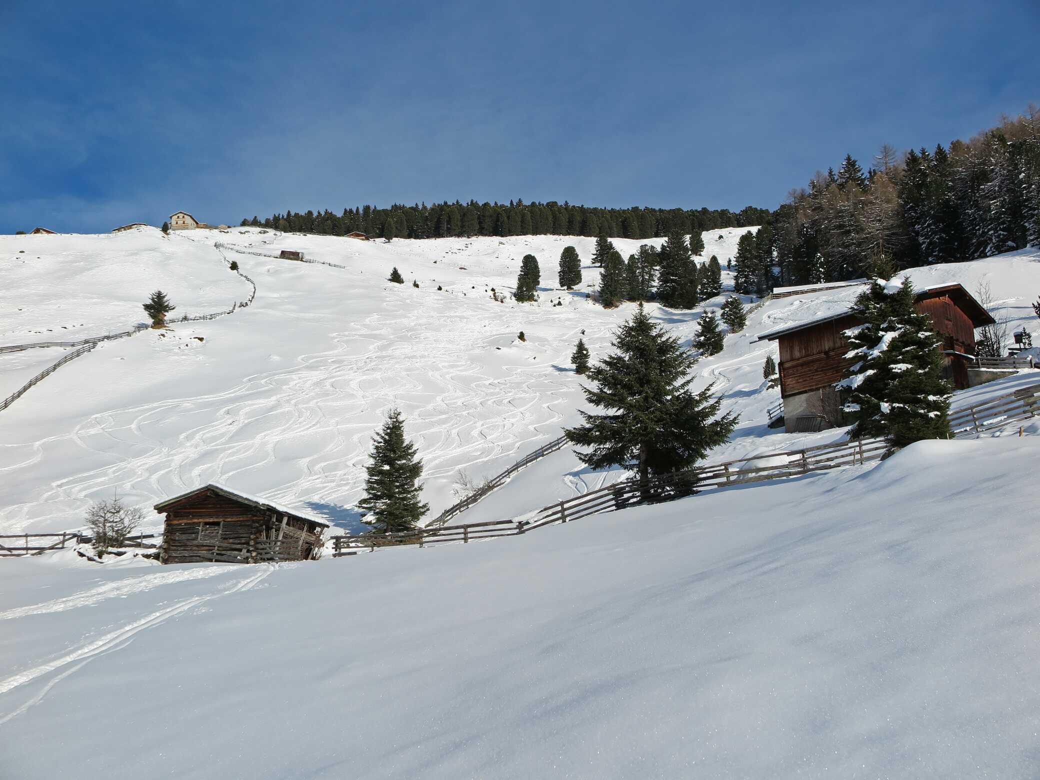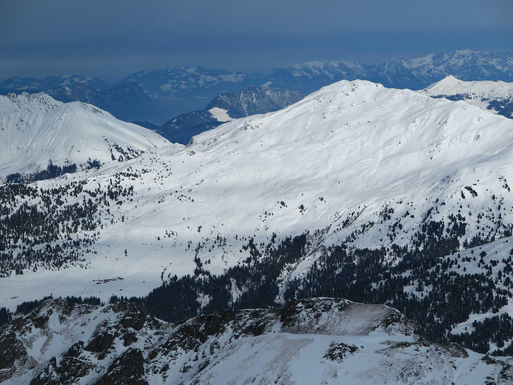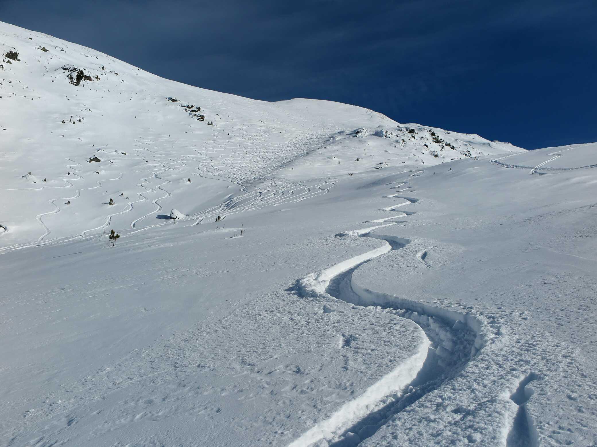 Schneelage: Vom PP bis ca. 1800m liegt praktisch nur der neue Pulverschnee (ca. 15cm) ohne Unterlage; da man bis 1600m auf einer Forststraße bis zum Almgelände geht und dann über relativ schöne Almwiesen bis ca. 1800m reicht der Schnee gerade so aus zum Abfahren. Oberhalb 1800m ist dann eine relativ dünne Unterlage vorhanden, auf der bis ca. 2400m der meist lockere Neuschnee liegt. Oberhalb 2400m hat der Wind wieder ganze Arbeit geleistet und den Pulver z.T. gepresst, z.T. vollständig weggeblasen. Insgesamt sind die Schneemengen in dem Gebiet absolut unterdurchschnittlich und vor allem in den Gipfelbereichen stark windbeeinflusst. Waldabfahrten sind nicht möglich, außer auf Forstwegen. Abfahrt zwischen 2400m und ca. 1800m in meist lockerer Pulverauflage ganz gut; unterhalb 1800m wird bei fast jedem Schwung der Grasboden freigelegt.