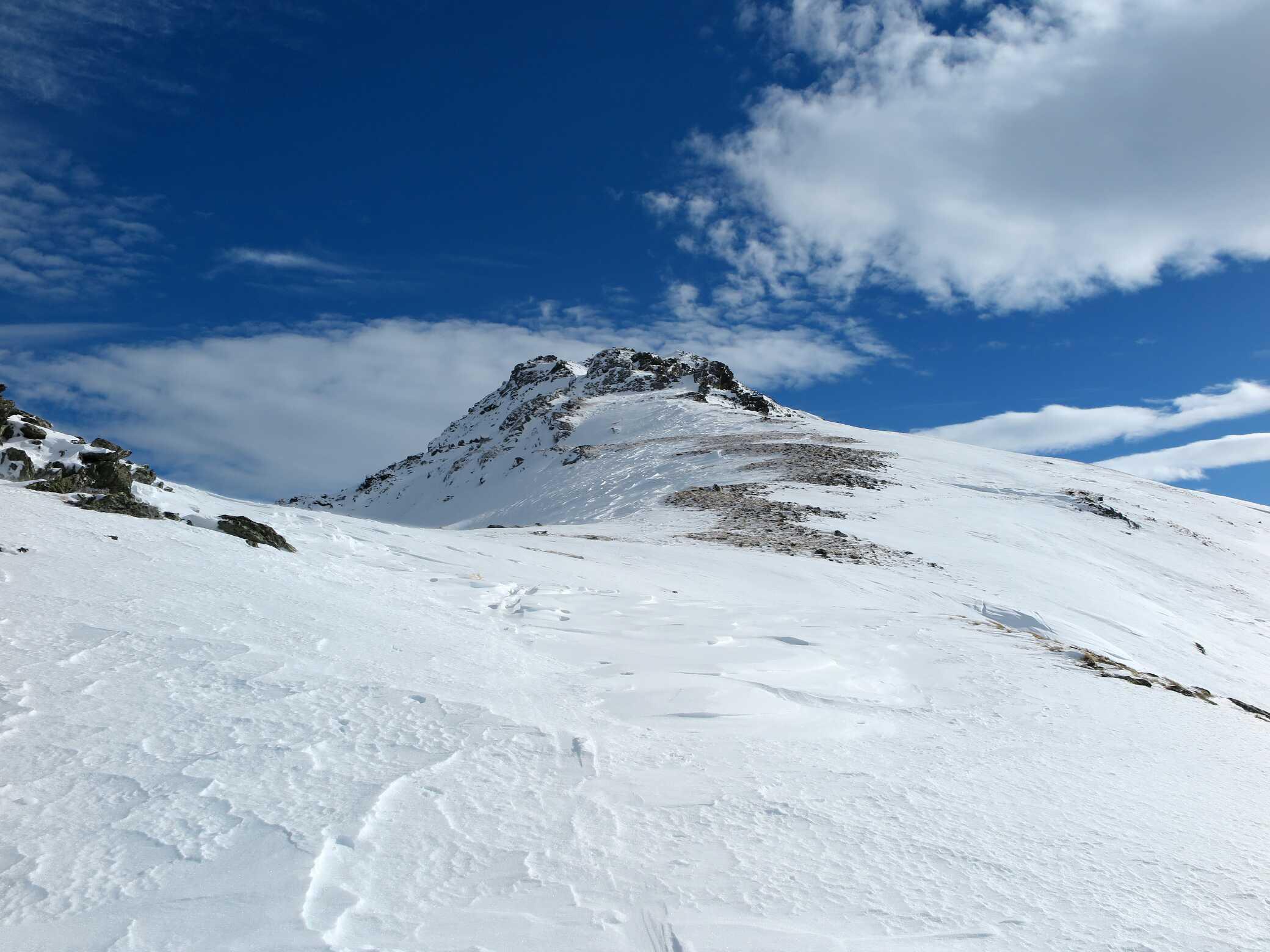 Lawinenbeobachtungen: Keine. Starke Schneeverfrachtungen durch stürmischen SW-Wind in der Gipfelregion. Im NO-Hang unter dem Gipfel auch Pressschnee, darunter lockerer Triebschnee, der eine Gleitschicht bildet.