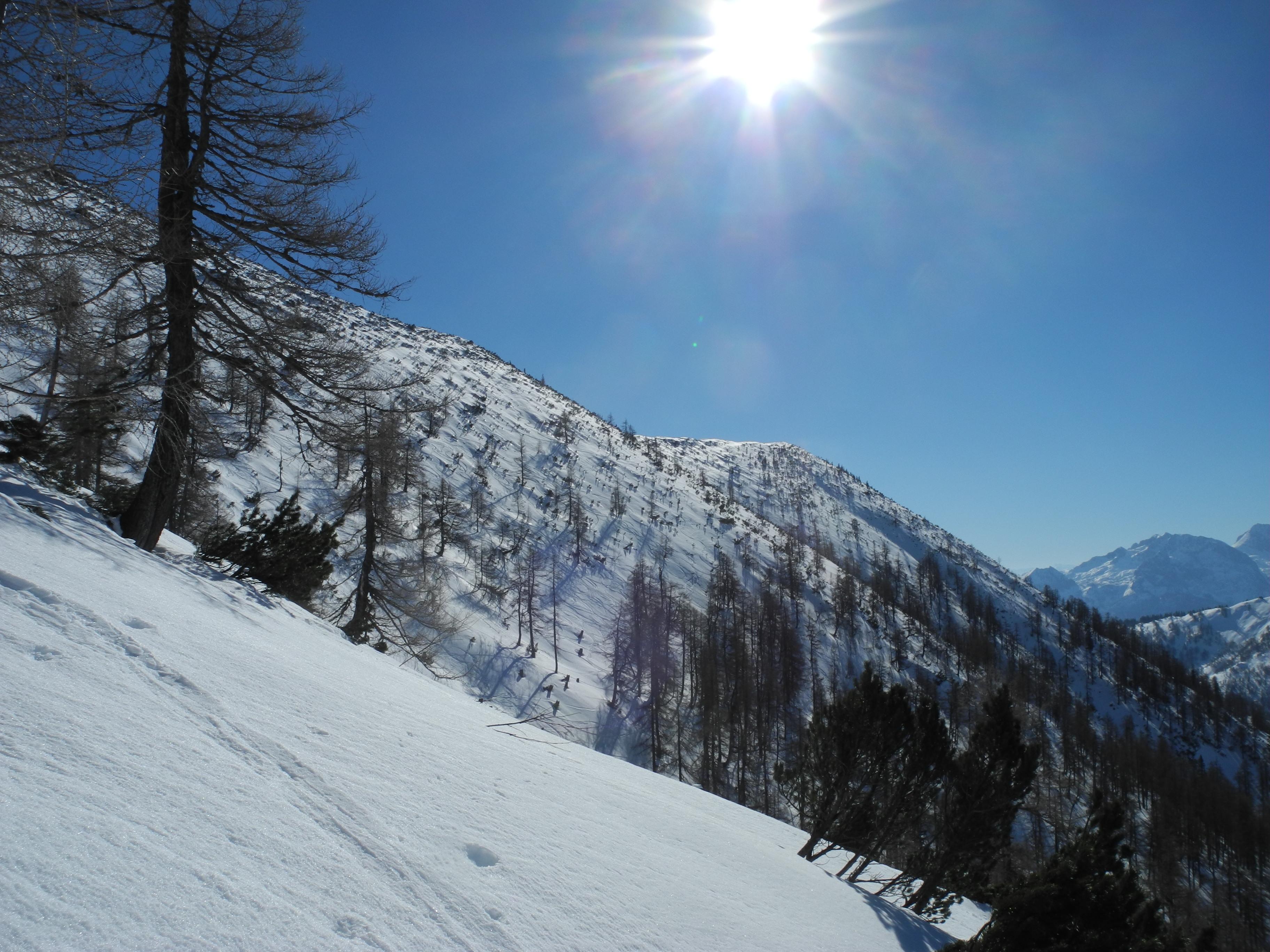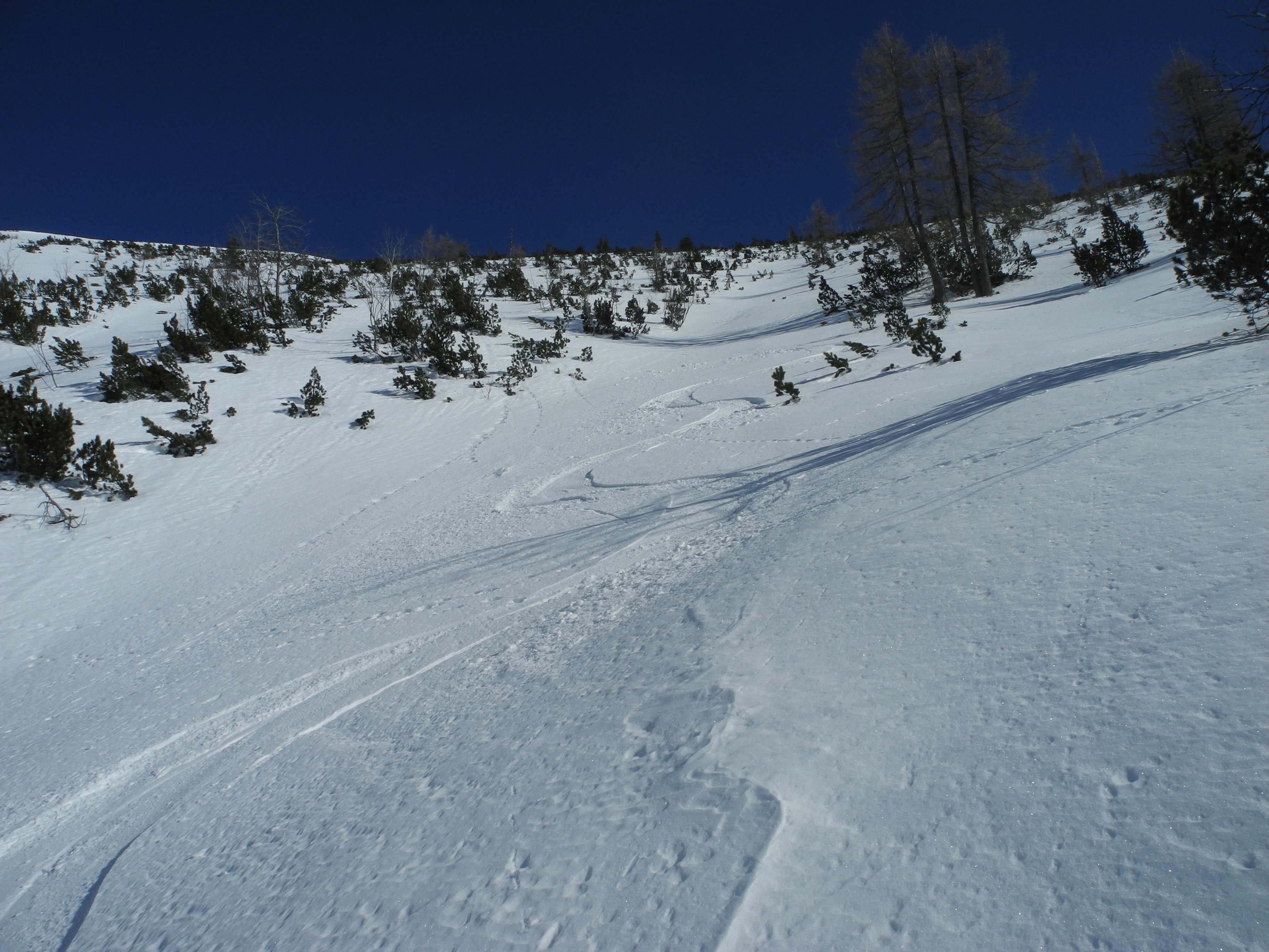 Firn, Bruchharsch und Pulverschnee - alles war heute vorhanden. Spannend war der schnelle Wechsel der Schneebeschaffenheit. Bedingt durch die Breite des Westhanges fand man noch unverspurtes Gelände.