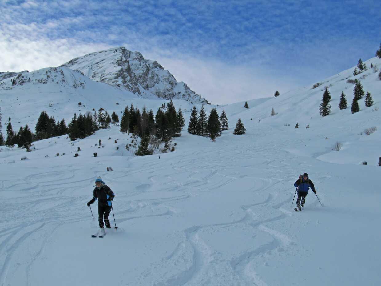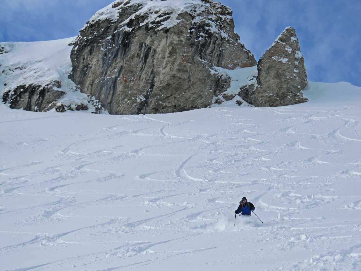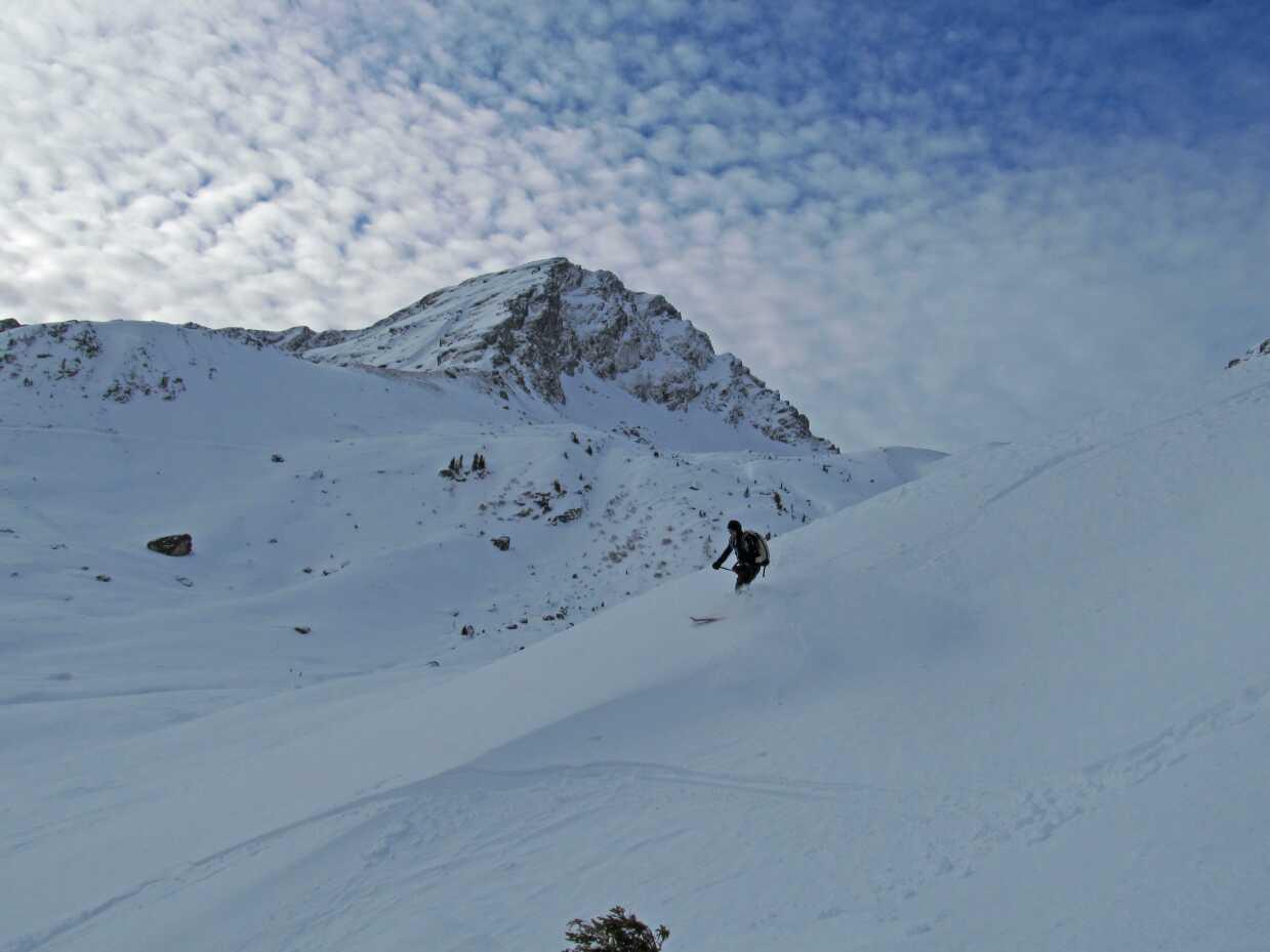 Schneelage: Im Tal ca. 15-20cm windunbeeinflusster Pulver auf Unterlage, im Mittelteil ca. 5-20cm Pulver auf Harschunterlage (ungleichmäßig tief durch Windeinfluss), oben ca. 20-30cm Pulver, nur wenig windbeeinflusst. Keinerlei Untergrundkontakt, alles sehr gut fahrbar.