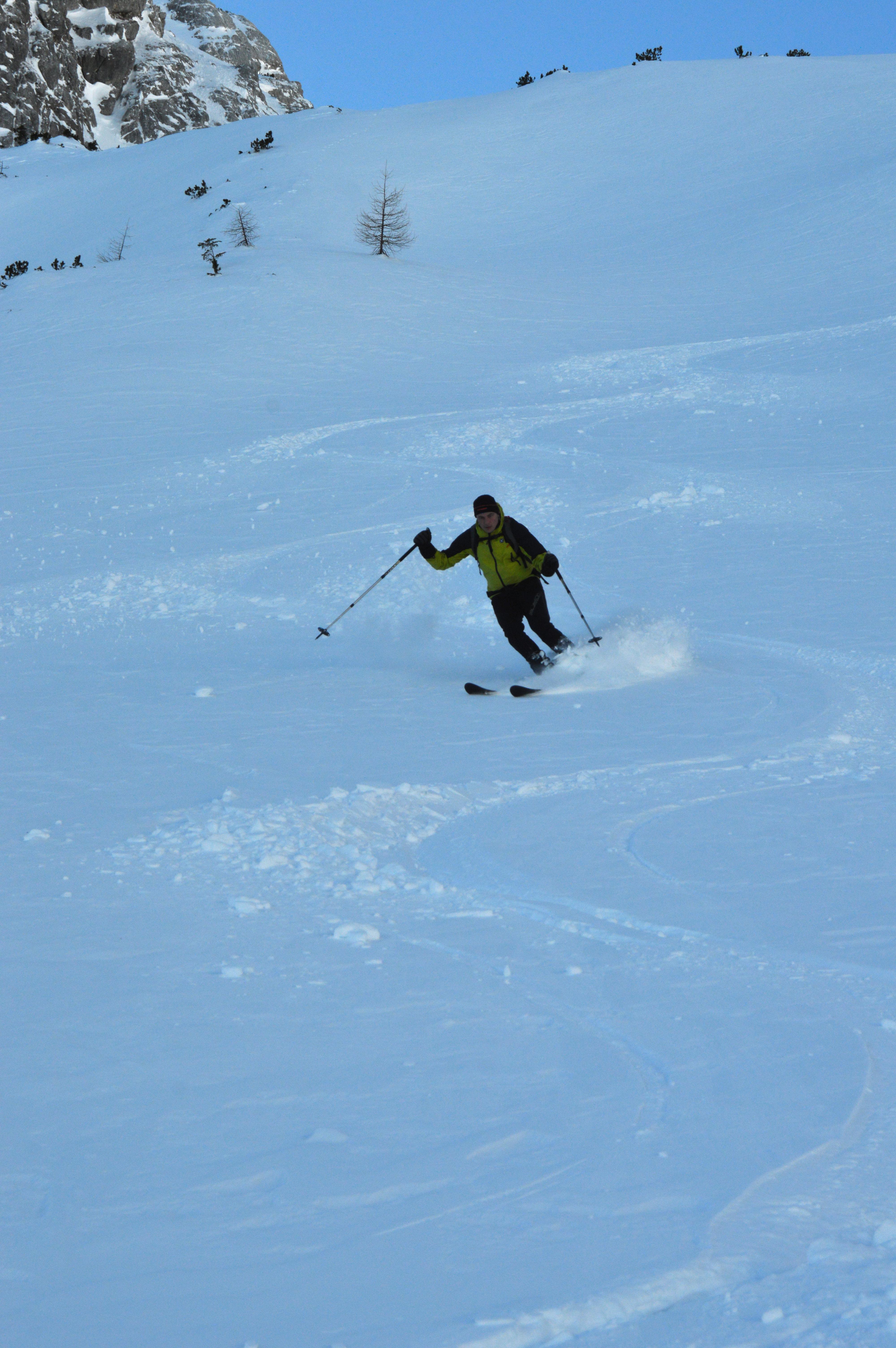 Vom Auto weg hatten wir bis zum lichten Lärchenwald wunderschönen gesetzten Pulver. Weiter oben auf den Rücken war meißt ein tragfähiger Harschdeckel mit ein bischen Staubauflage und machte bei der Abfahrt richtig Spaß.