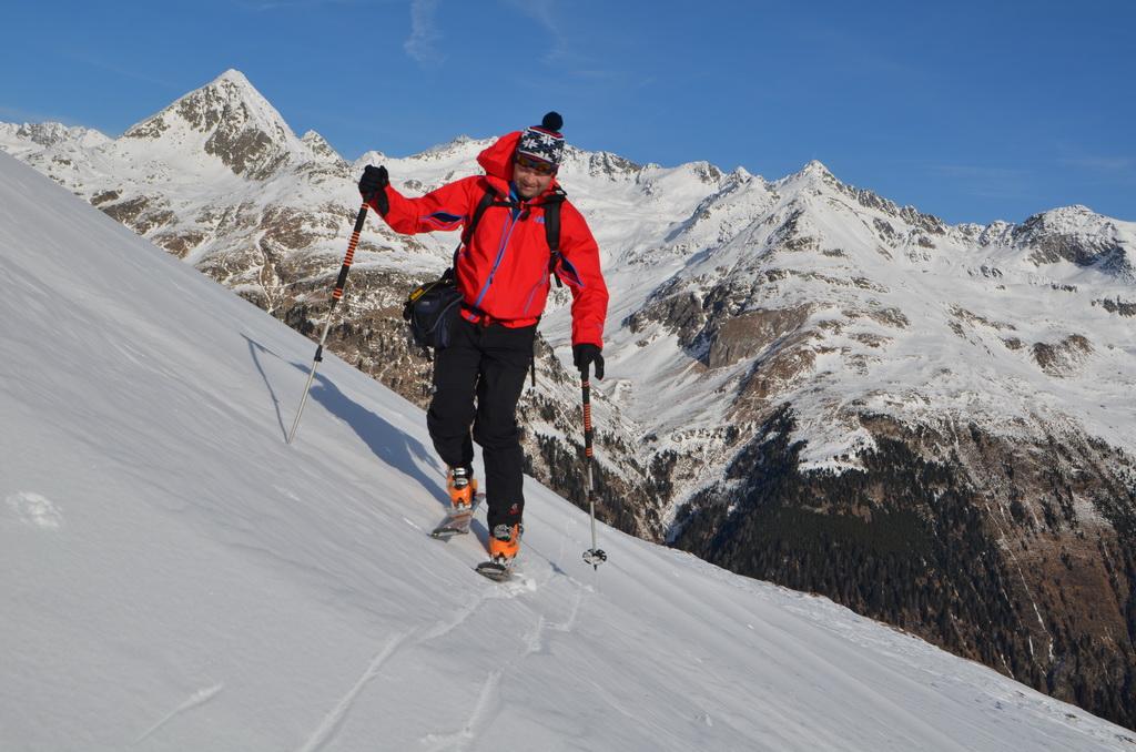Mit der Option den Gipfelhang wegzulassen haben wir uns auf den Weg vom Stallersattel in Richtung Deferegger Pfannhorn gemacht. Mit dem Wissen der Windverfrachtungen der letzten Tage haben wir die Spur auch so angelegt dass wir die steilen Bereiche gemieden haben. Trotzdem