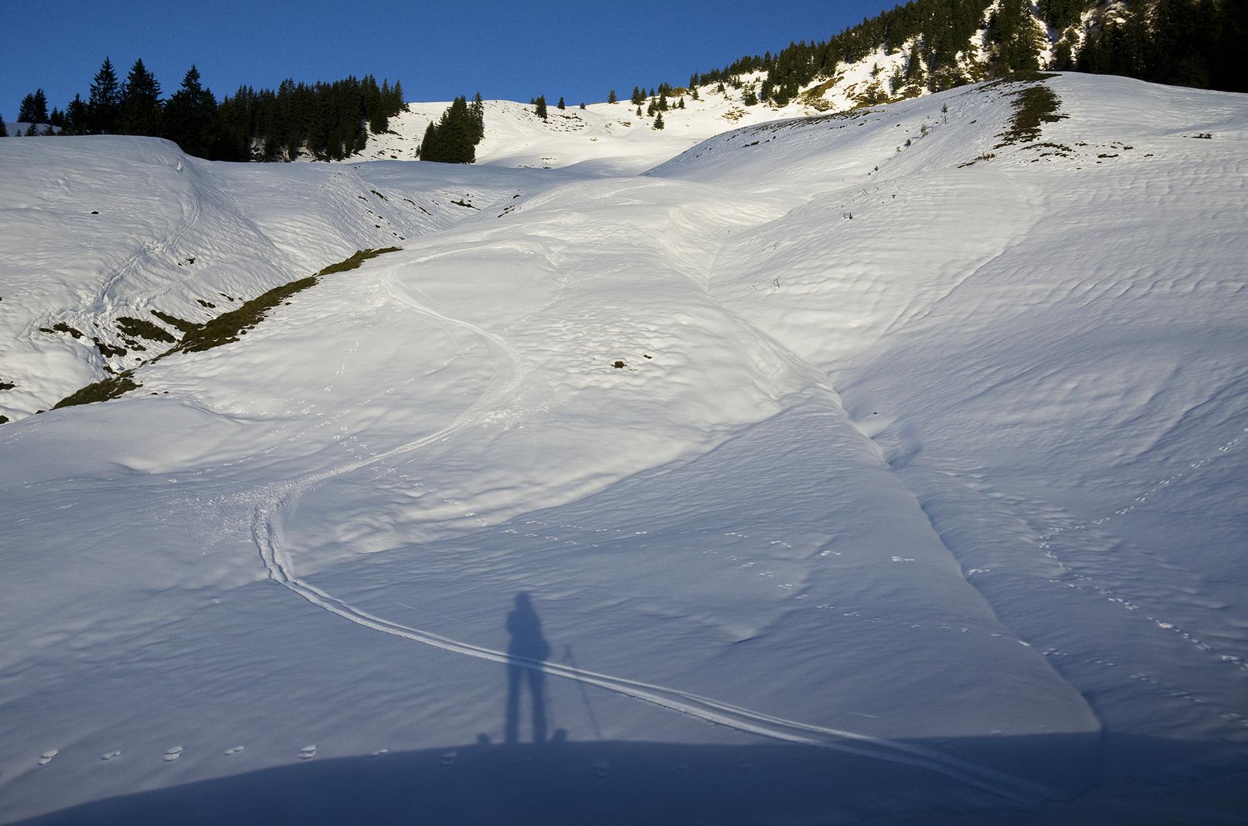 Westseitig konnte ich eine Stunde vor Sonnenuntergang herrlichen Butterfirn geniessen. Sonntag. Und kein Mensch weit und breit.