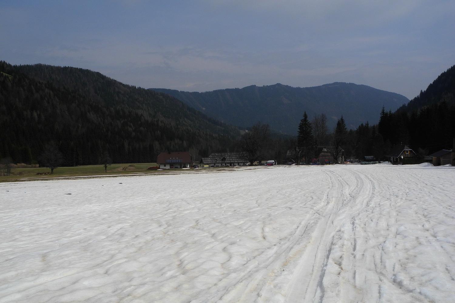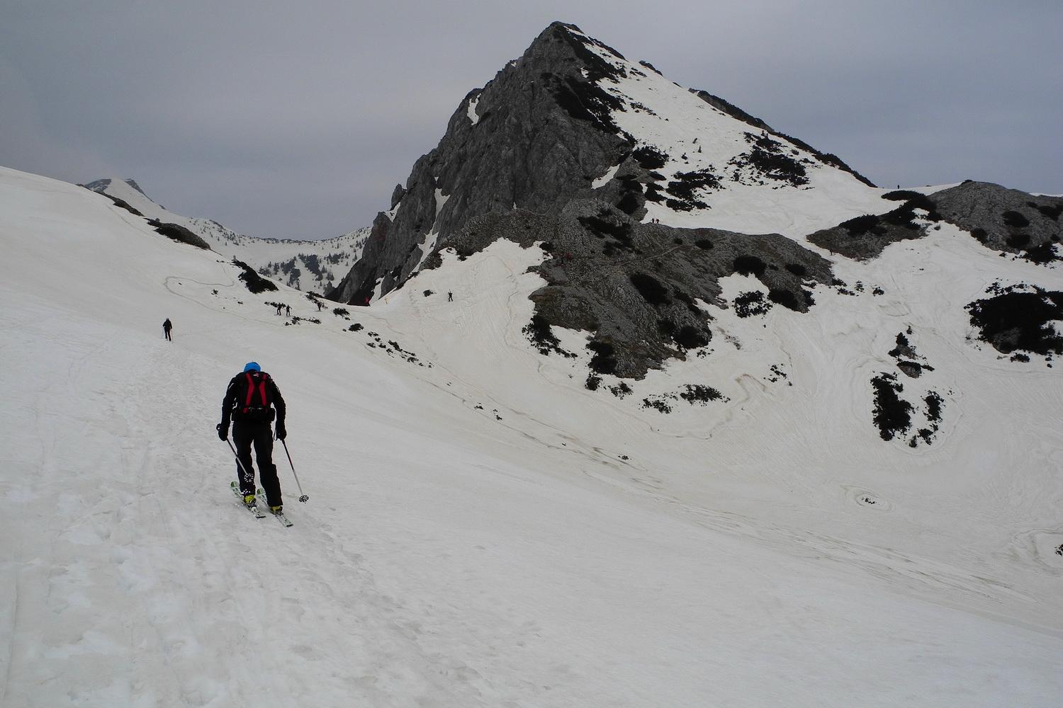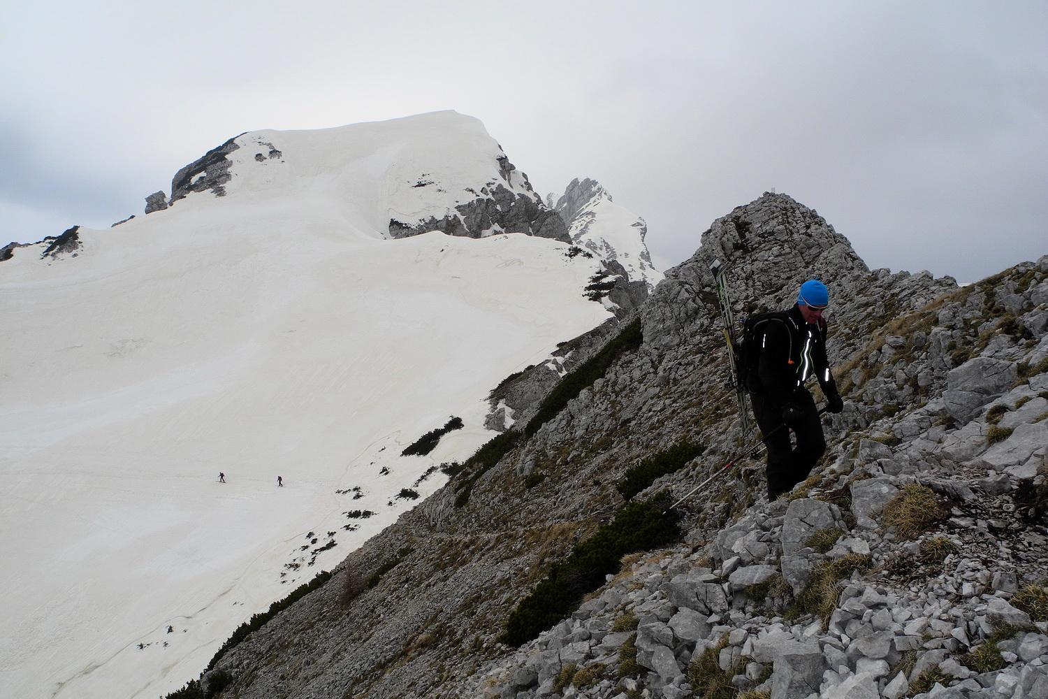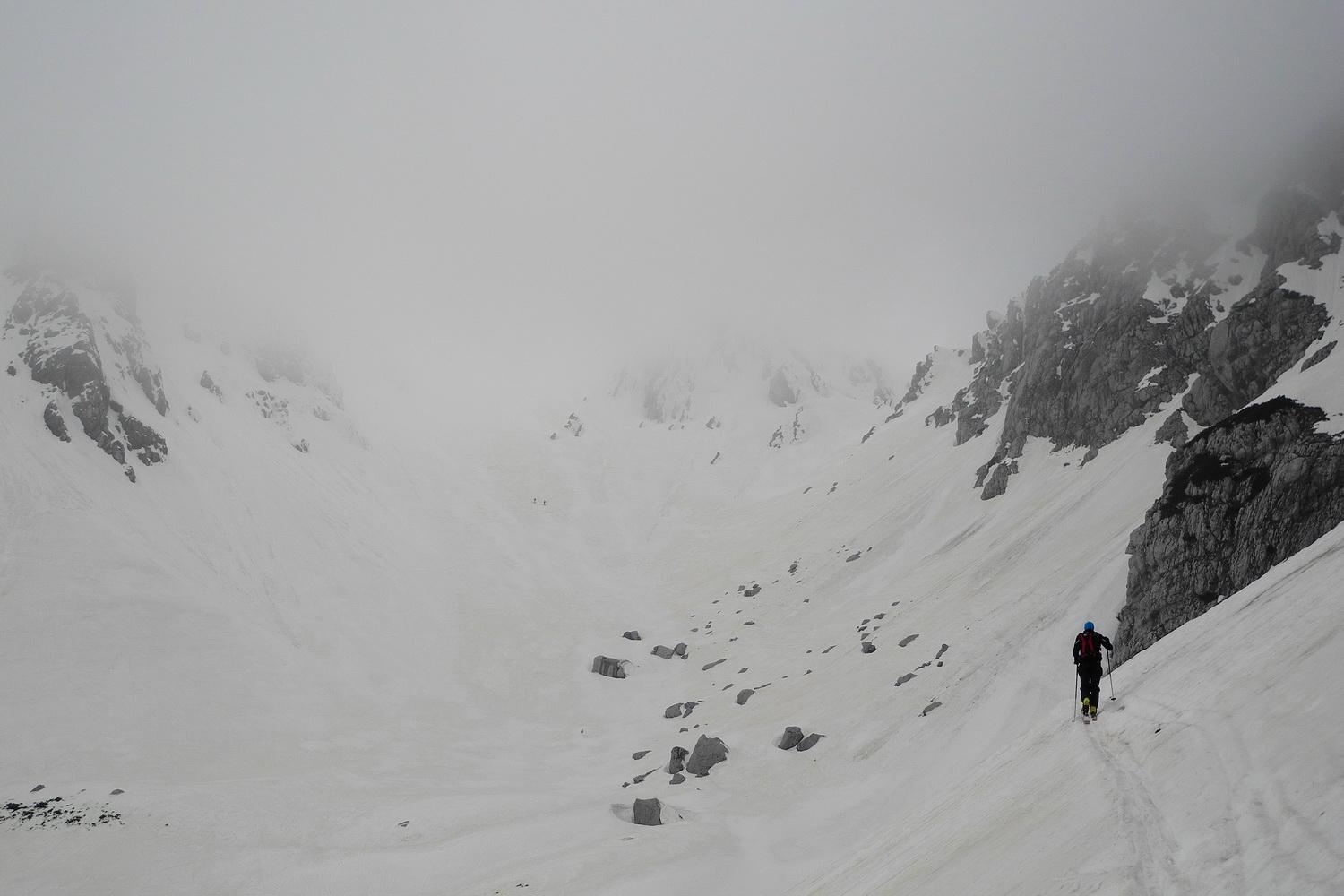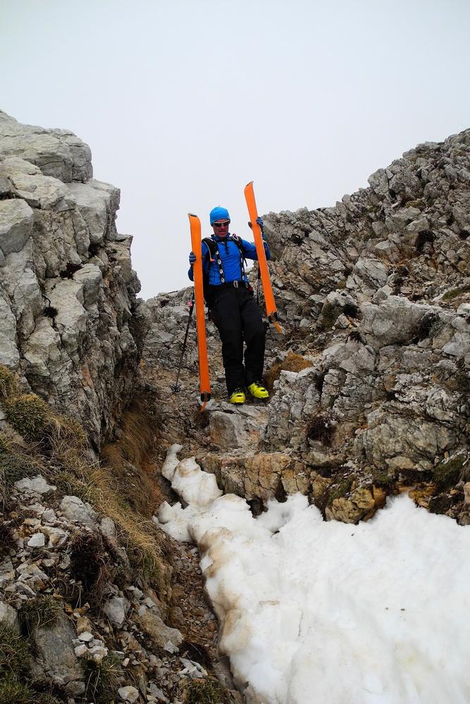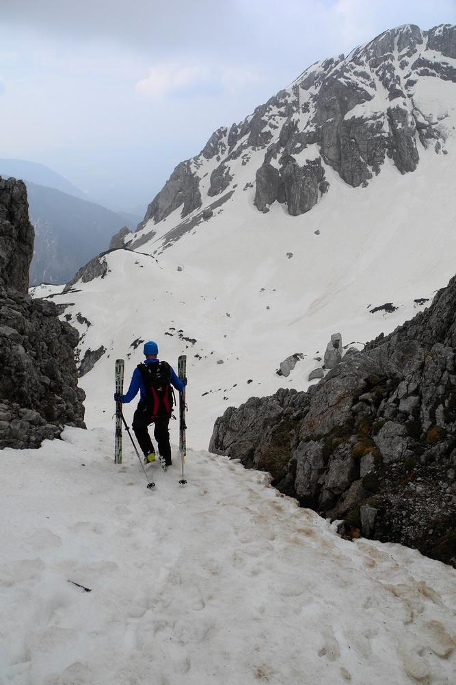 Even It was raining on Saturday evening my friend and I went over Ljubelj pass. We have stopped at Bodenbauer Gasthof. Sunday morning was cloudy, higher on a NE wind started to blow and after traverse under Klagenfurter Spitze we have reached the clouds. At the summit it was still, only the clouds were so dense that we nave checked our position via GPS. Skiing down over soft snow was good. A sunny day would make a tour nicer but skiing worse.