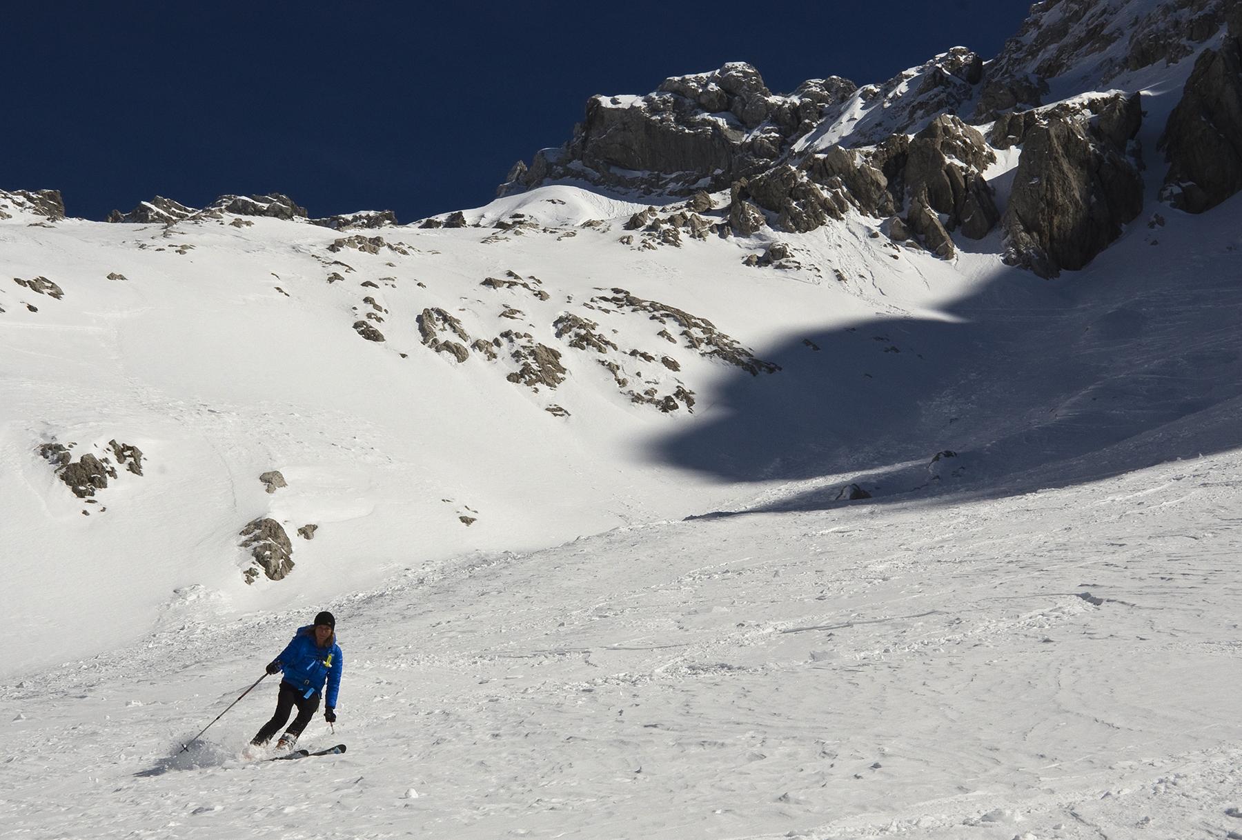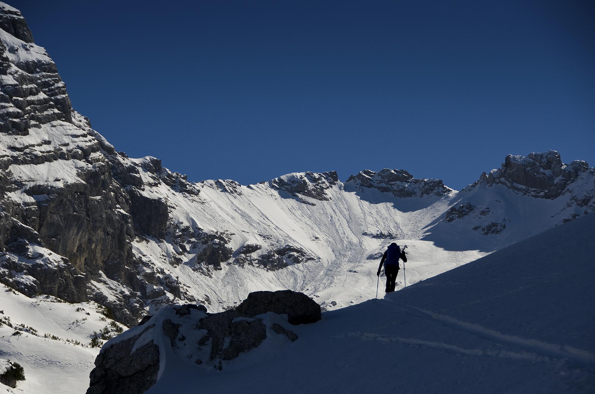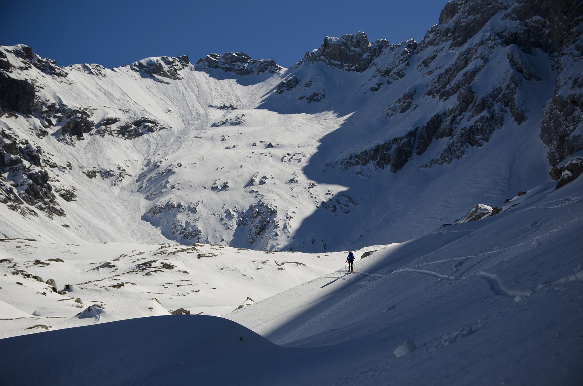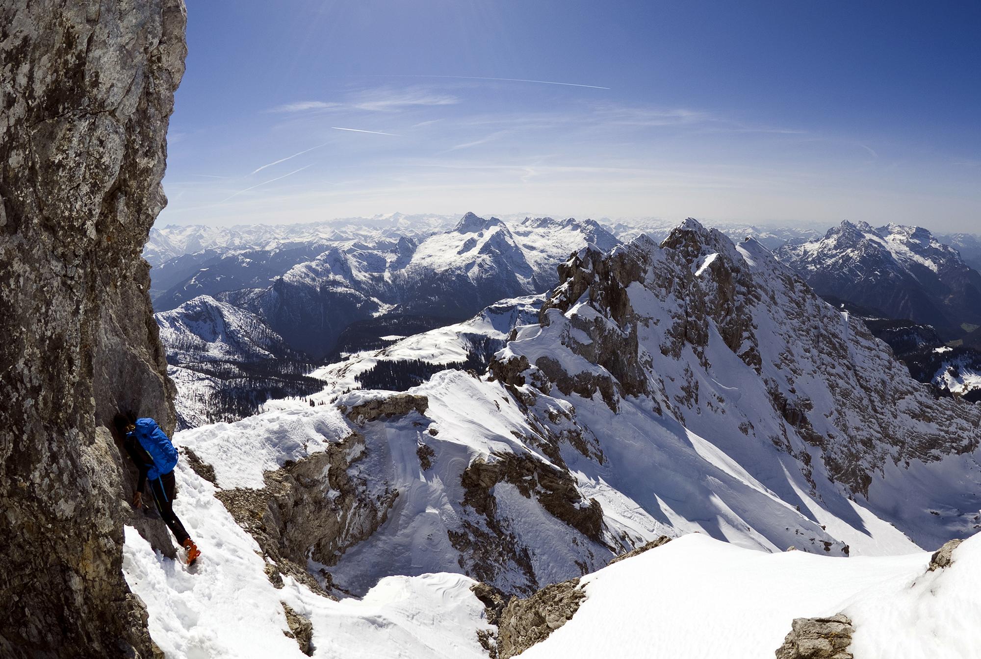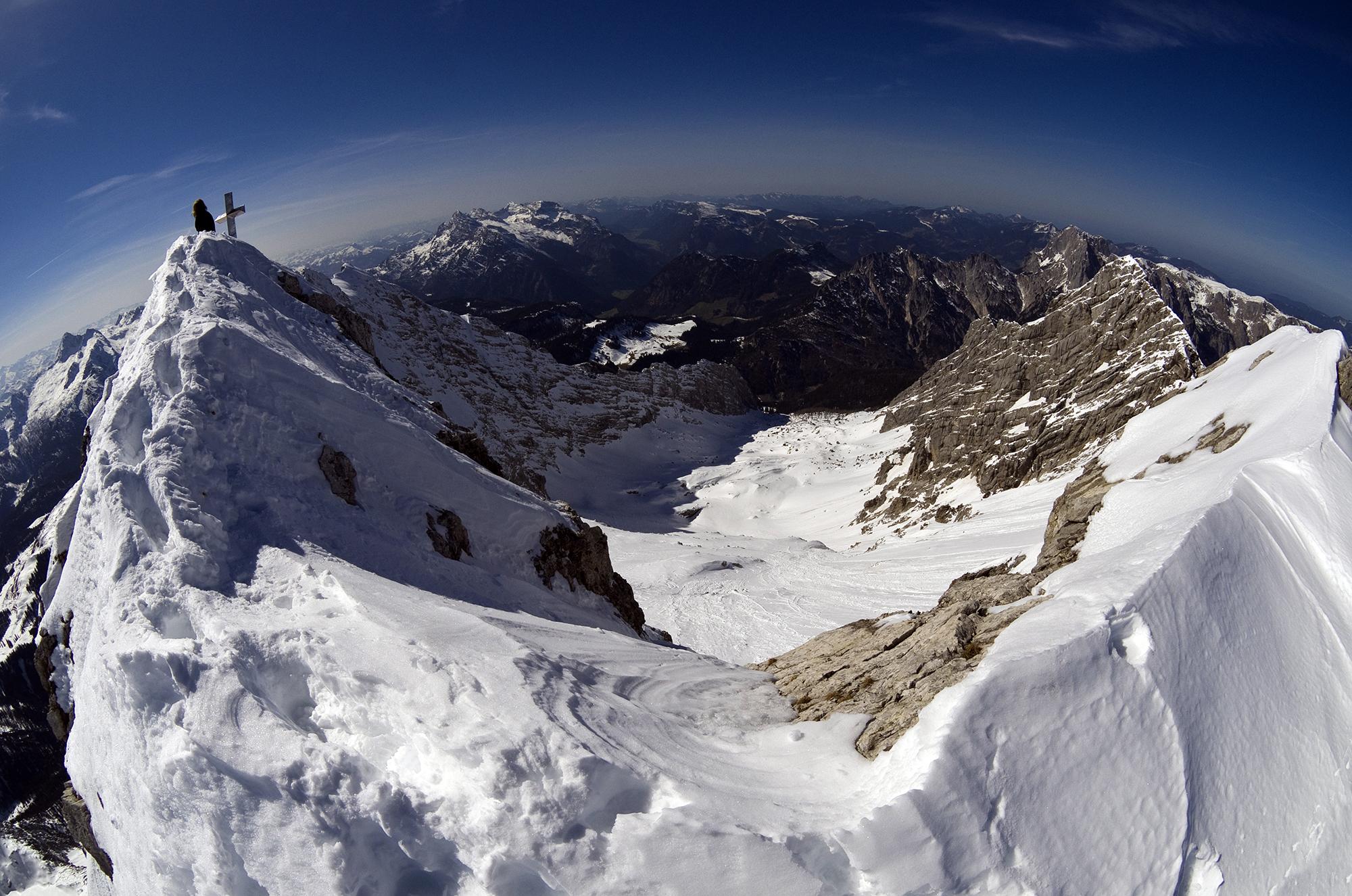Die Tour auf den zweithöchsten Gipfel der Hochkaltergruppe ist oft einsam, aber auch nur bei sicheren Lawinenverhältnissen ratsam. Zwei andere Tourengeher haben wir noch gesehen. Heute haben Harscheisen die Querung zum Gipfelhang sehr vereinfacht. Der Schnee am Gipfelgrat war dann weich und nass, die Steigeisen konnten weiter im Rucksack rosten. Es war kein Makel, dass wir uns erst um 10 Uhr am Hirschbichl mit dem Radl getroffen haben und auch noch ein wenig Richtung Kammerlinghorn und zurück marschierten, denn für die Abfahrt war der Schnee dann viel besser als erwartet. Teilweise Pulver und Firn, nur selten Bruchharsch, und in der Latschenstufe über der Mittereisalm Naßschnee.