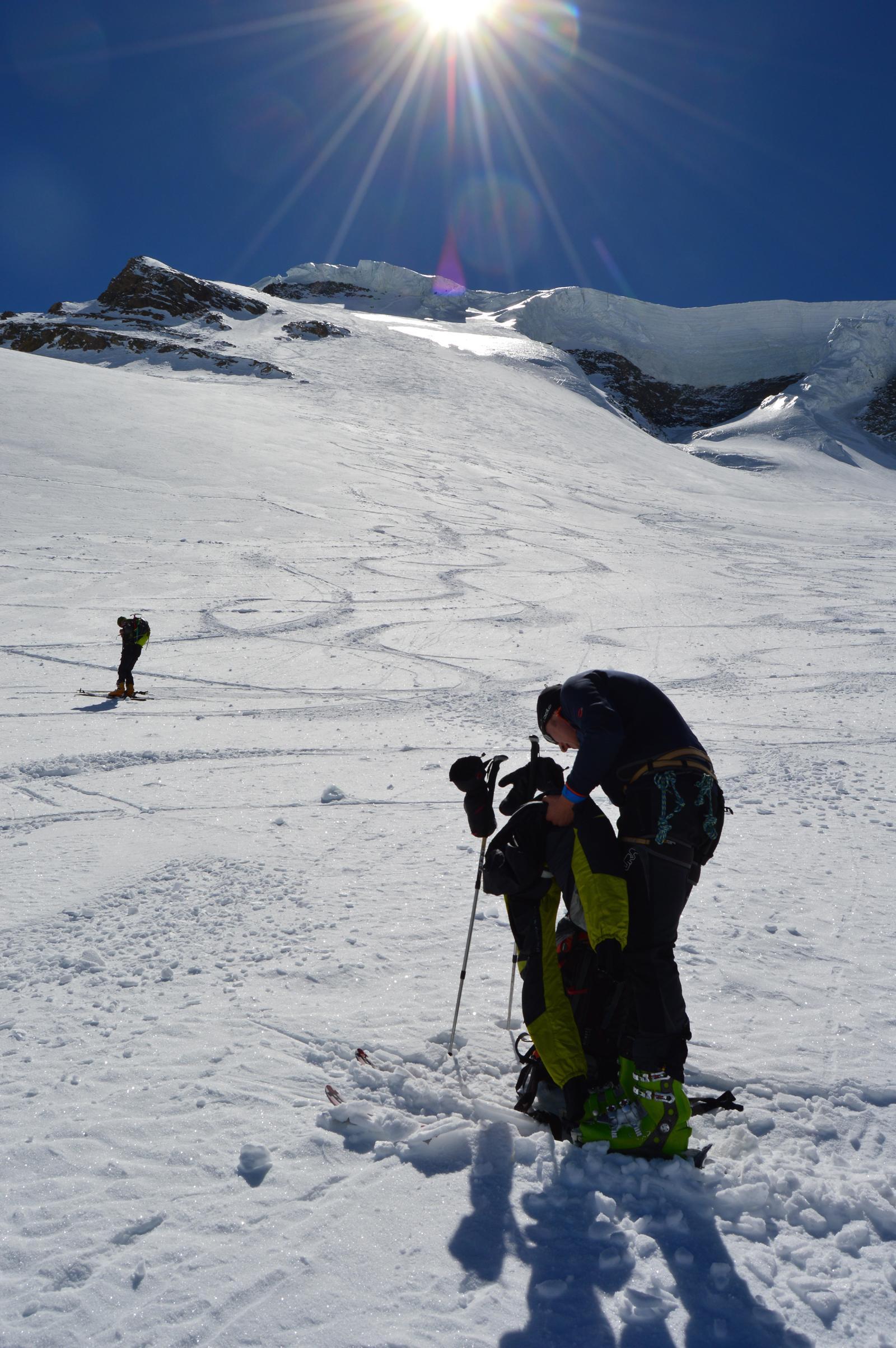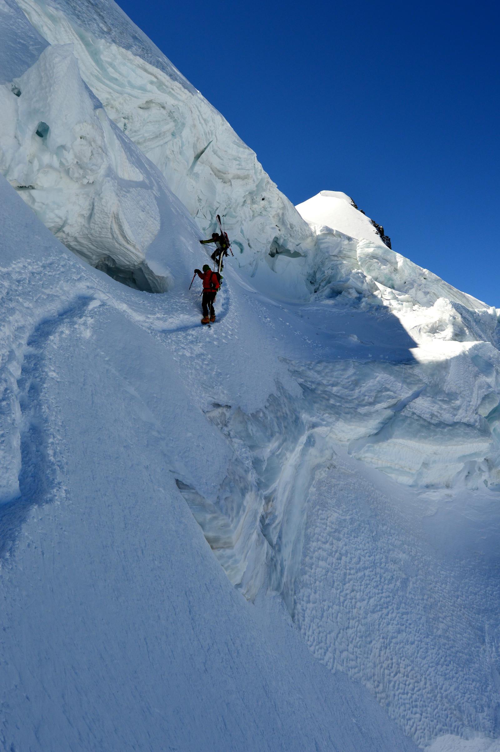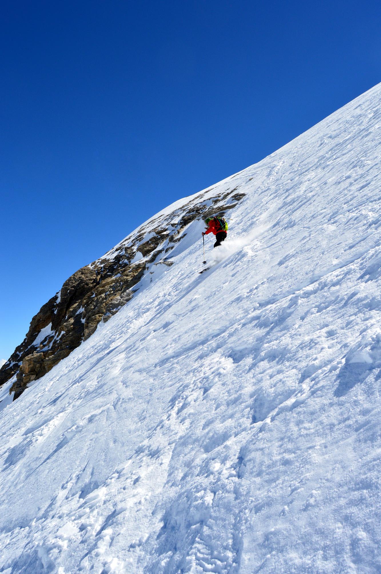 Wir waren dann (Gott sei Dank) die 3. Seilschaft durch die NW-Flanke, wobei hier an diesem Tag ausnahmslos versierte Alpinisten unterwegs waren und es zu keinerlei Staubildung kam. Die Verhältnisse waren perfekt: 20 cm Schneeauflage auf dem Eis und teilweise sogar Pulverschnee in der riesigen Flanke. Der nächste Gedanke wurde schnell zur fixen Entscheidung: Die Flanke ist in diesem Zustand ideal mit Schi befahrbar! Bei der normalen Abfahrt über den Corridor bekommt man eh ein bissl ein flaues Magengefühl wegen der permanenten Eisschlaggefahr. Wir bestiegen beide Gipfel (Combin de Valsorey und den Hauptgipfel Combin de Grafeneire). und kletterten die ersten Meter über die Seracs wieder hinunter in die Flanke. Während wir eine Plattform zum Schianschnallen bauten, verlor Toni seinen Handschuh aus dem Rucksack und er fiel (ich habs auf der Karte kontrolliert) 900Hm über die Flanke ohne Hängenzubleiben!! Das sagt wohl einiges über die Steilheit der Tour aus, da die Flanke ja eigentlich eine Pulverauflage hatte! Die Abfahrt über die Flanke machten riesigen Spaß und auf den Gletschflächen war wieder Firnschweben angesagt.