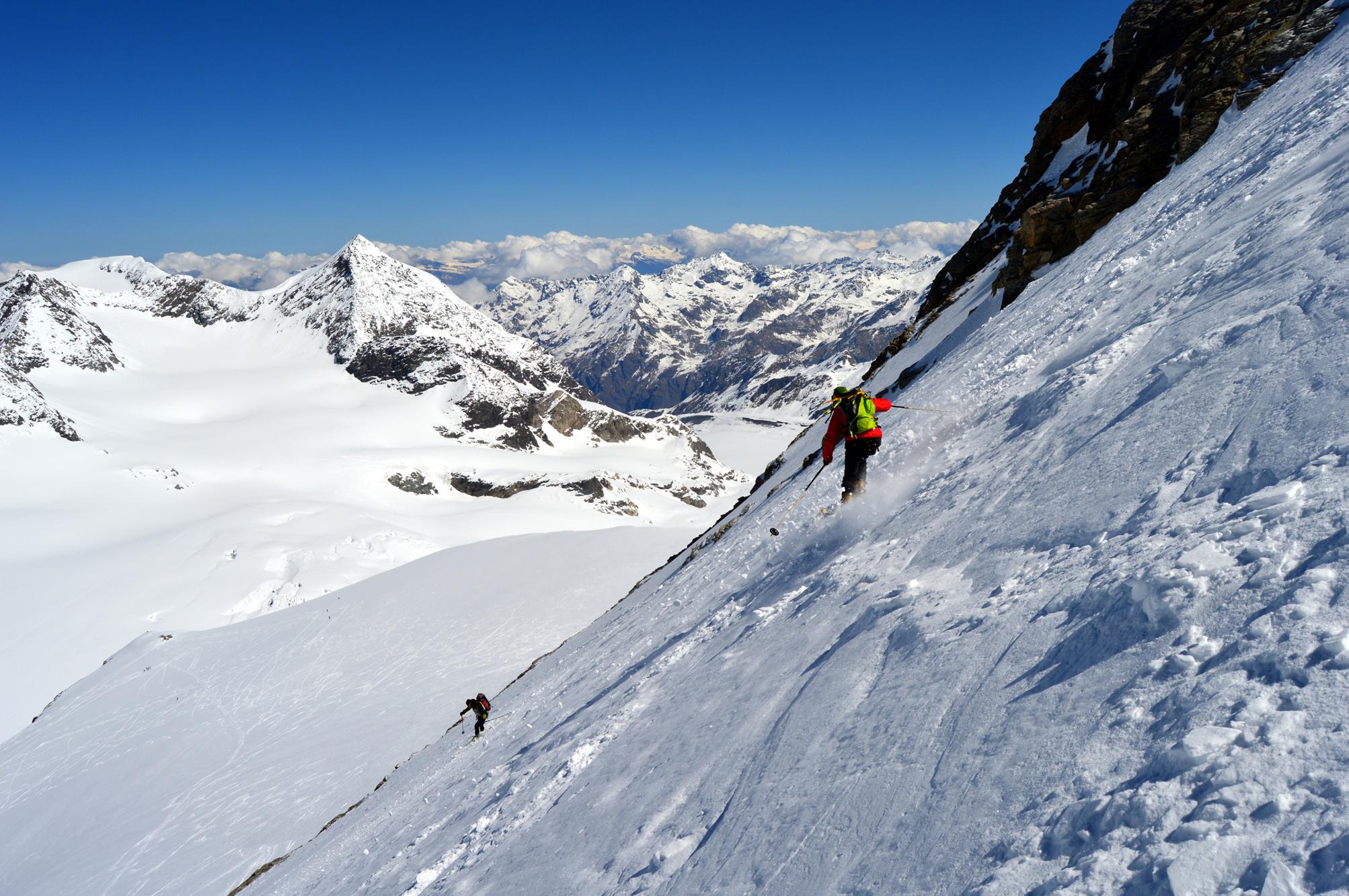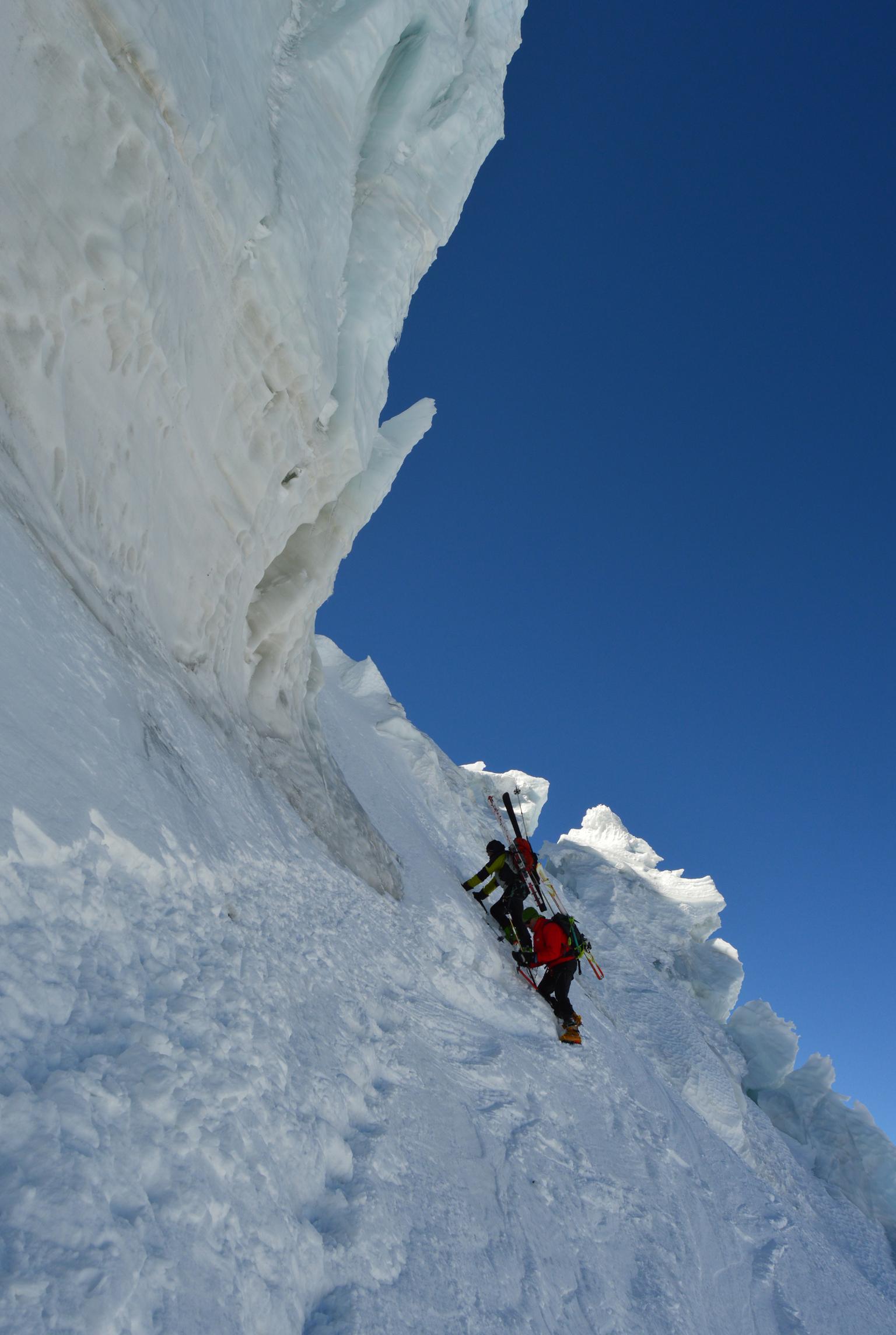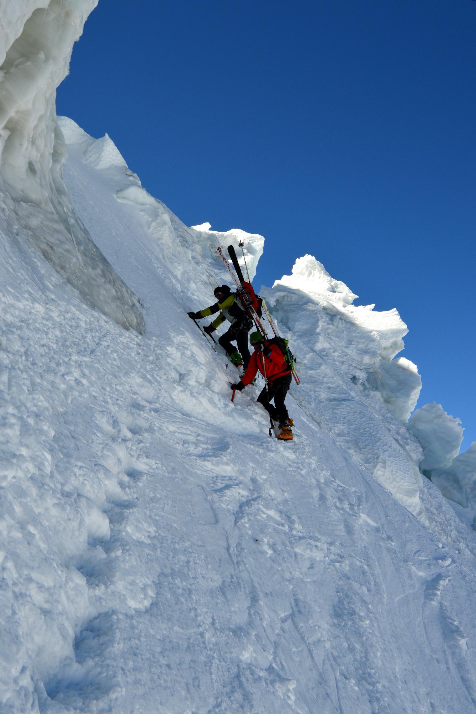 Wir waren dann (Gott sei Dank) die 3. Seilschaft durch die NW-Flanke, wobei hier an diesem Tag ausnahmslos versierte Alpinisten unterwegs waren und es zu keinerlei Staubildung kam. Die Verhältnisse waren perfekt: 20 cm Schneeauflage auf dem Eis und teilweise sogar Pulverschnee in der riesigen Flanke. Der nächste Gedanke wurde schnell zur fixen Entscheidung: Die Flanke ist in diesem Zustand ideal mit Schi befahrbar! Bei der normalen Abfahrt über den Corridor bekommt man eh ein bissl ein flaues Magengefühl wegen der permanenten Eisschlaggefahr. Wir bestiegen beide Gipfel (Combin de Valsorey und den Hauptgipfel Combin de Grafeneire). und kletterten die ersten Meter über die Seracs wieder hinunter in die Flanke. Während wir eine Plattform zum Schianschnallen bauten, verlor Toni seinen Handschuh aus dem Rucksack und er fiel (ich habs auf der Karte kontrolliert) 900Hm über die Flanke ohne Hängenzubleiben!! Das sagt wohl einiges über die Steilheit der Tour aus, da die Flanke ja eigentlich eine Pulverauflage hatte! Die Abfahrt über die Flanke machten riesigen Spaß und auf den Gletschflächen war wieder Firnschweben angesagt.