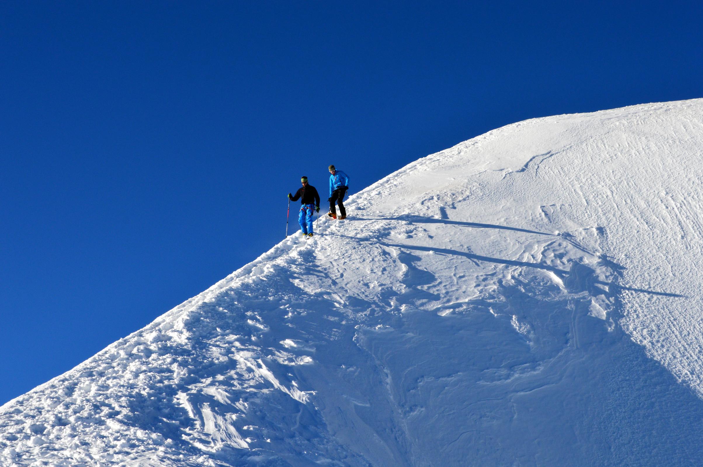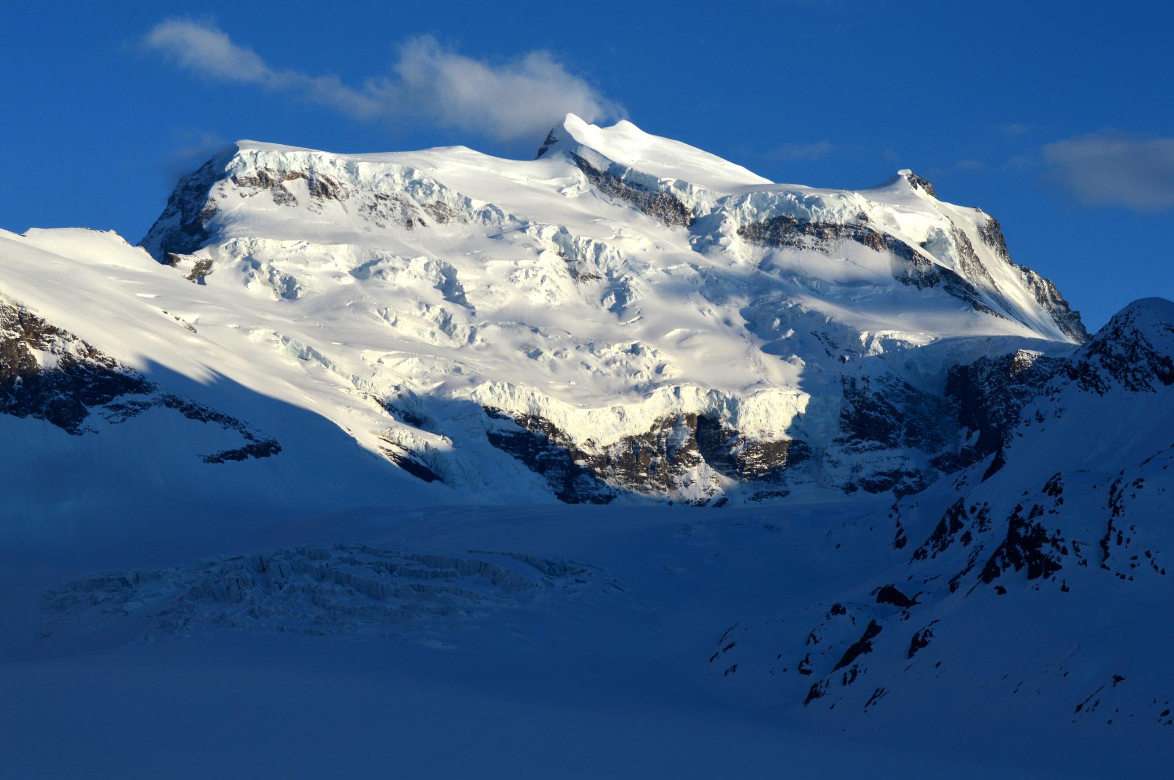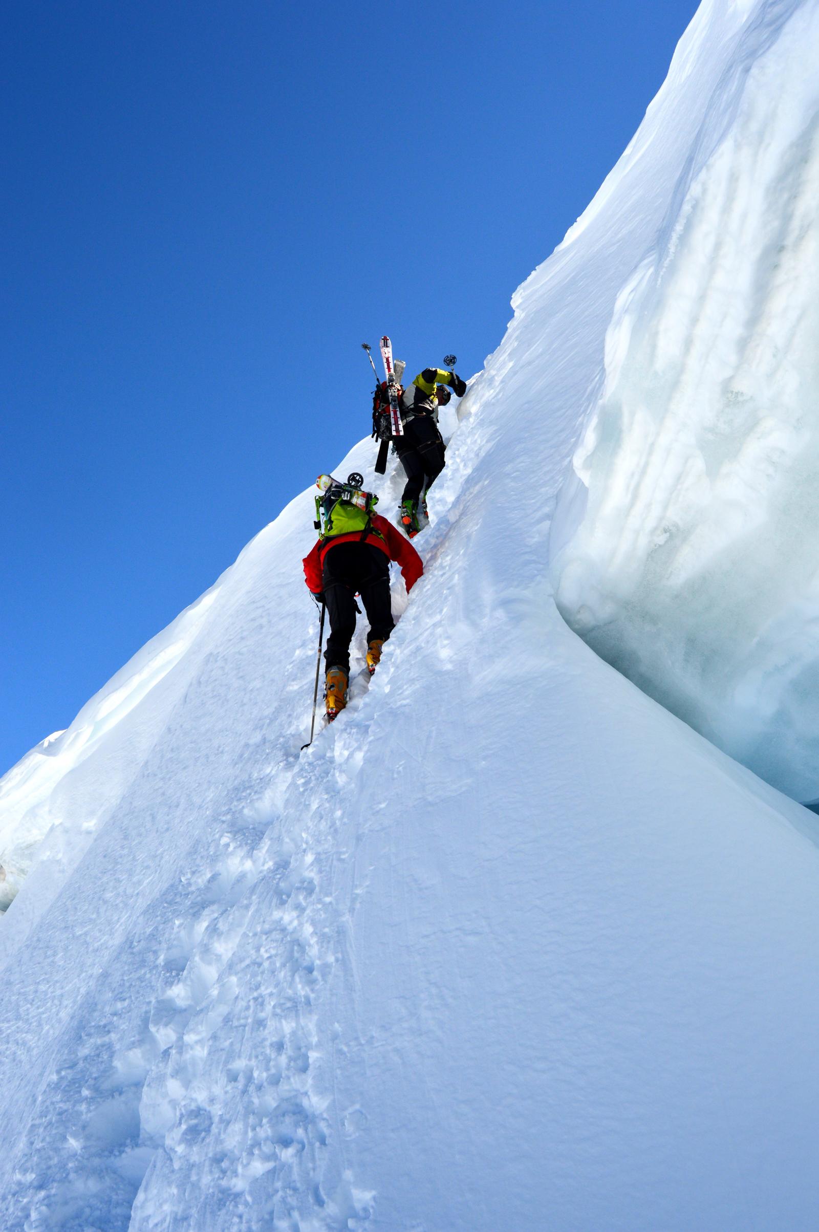 Mit beiden Gipfeln ca. 1800Hm Aufstieg, zuerst über ehlendslange sanfte Gletscherflächen, die komplette Flanke mit Steigeisen und geschulterten Schi bis zum Plateau und danach über den abgewehten Rücken auf die beiden Gipfel.