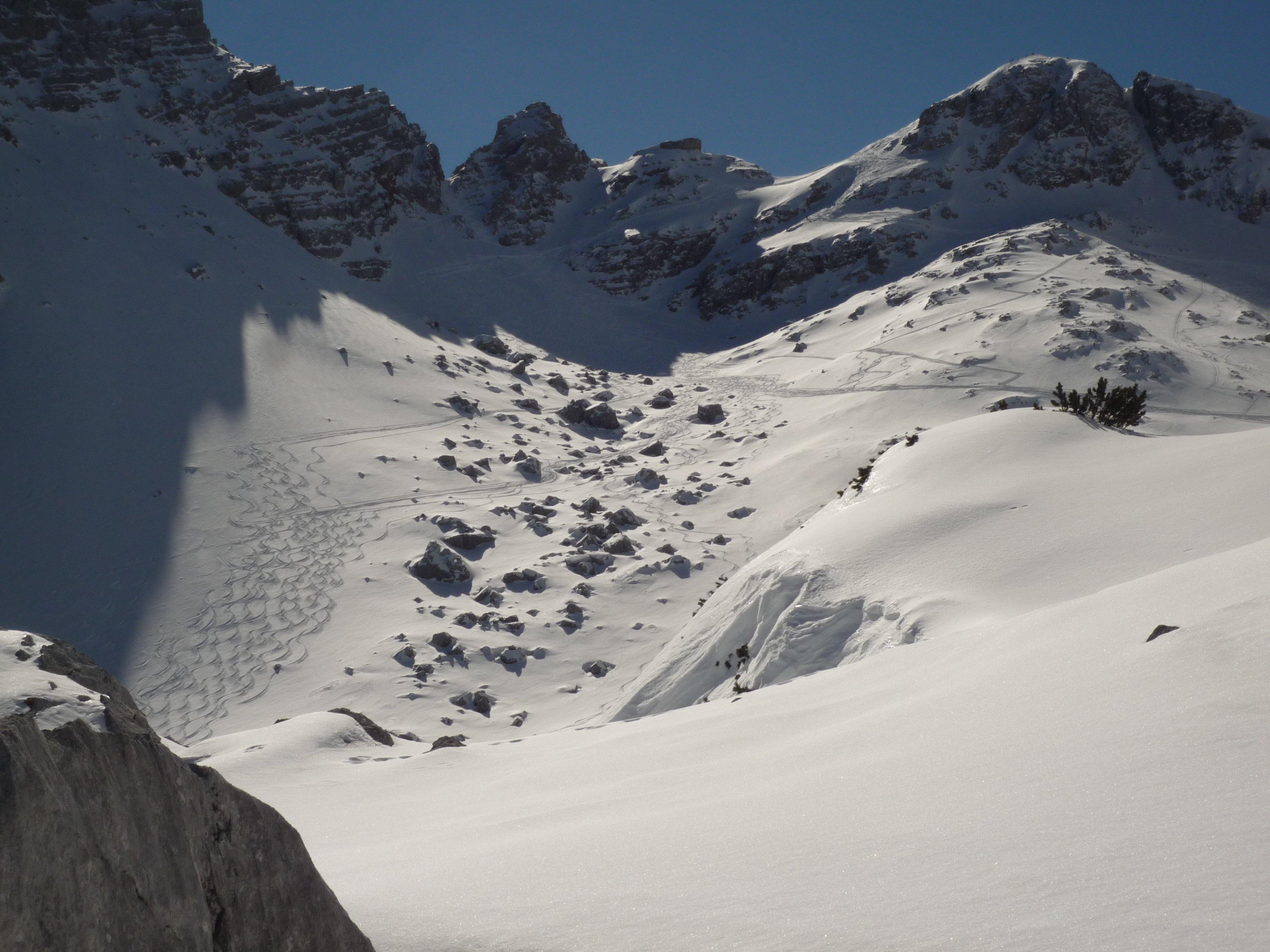 Schnee: Pulver in den beschatteten Hängen bis ins Tal, Sulz und Firn in den Sonnenhängen(Bruchharschbildung ab 14.00 Uhr)