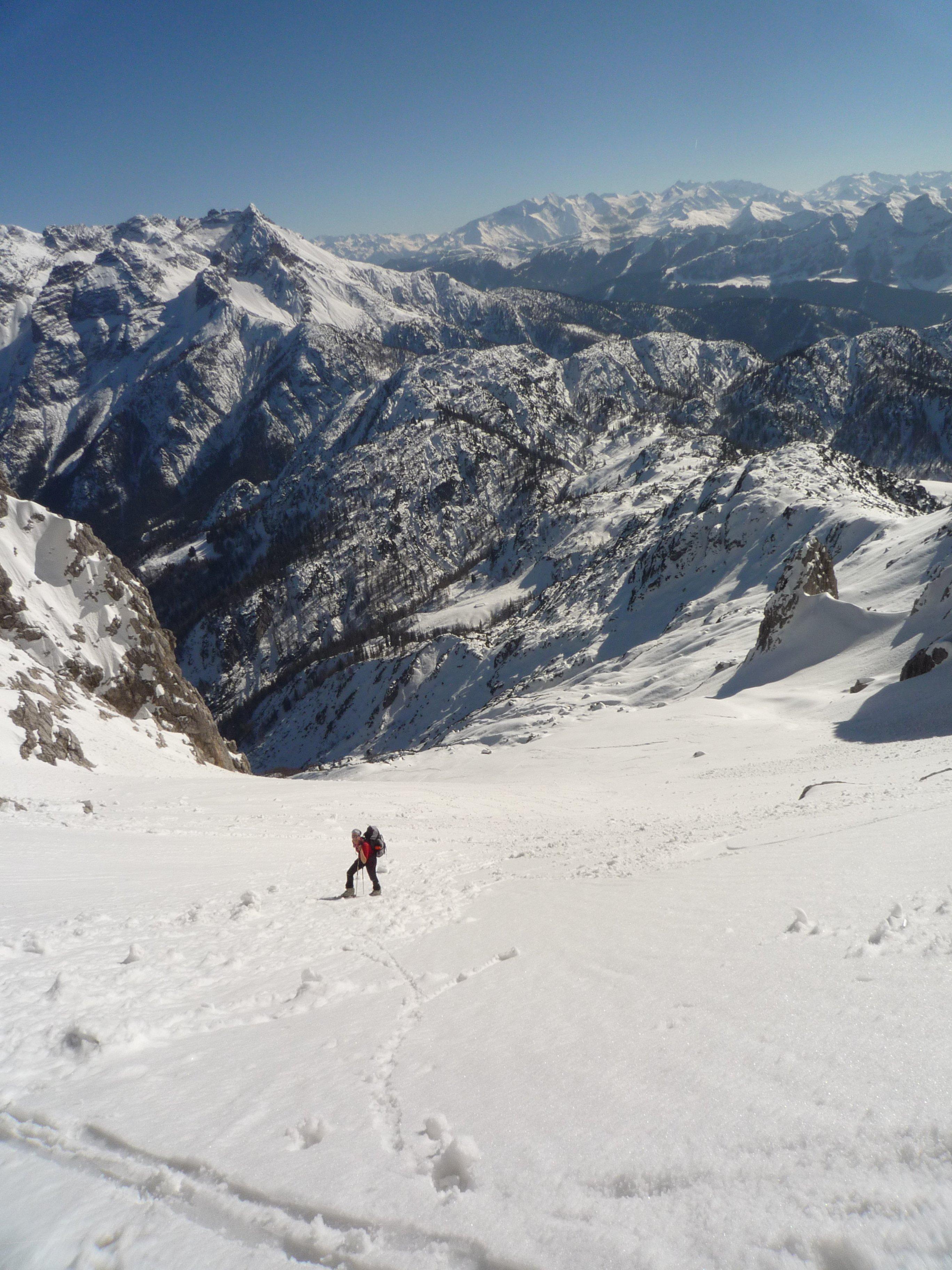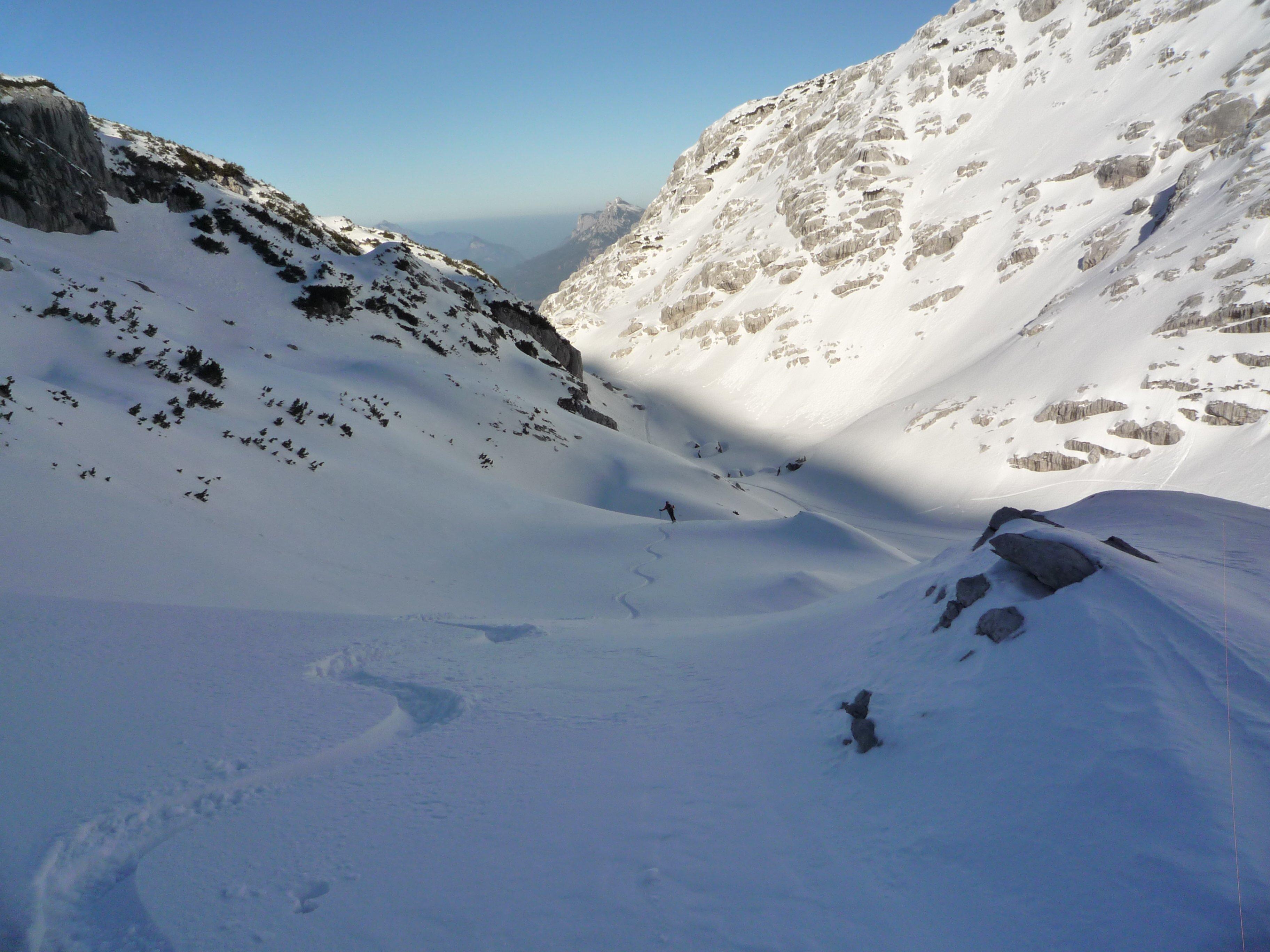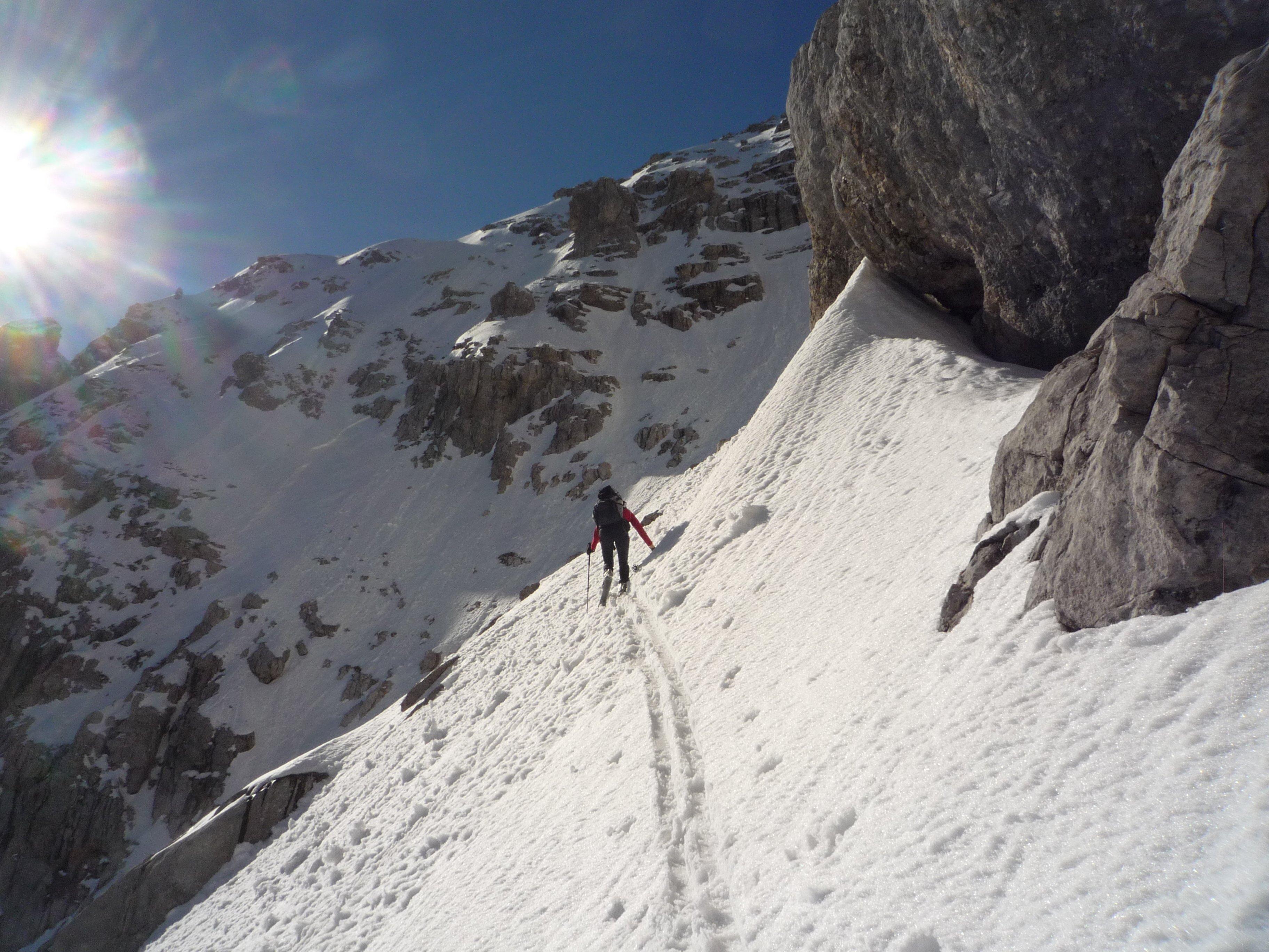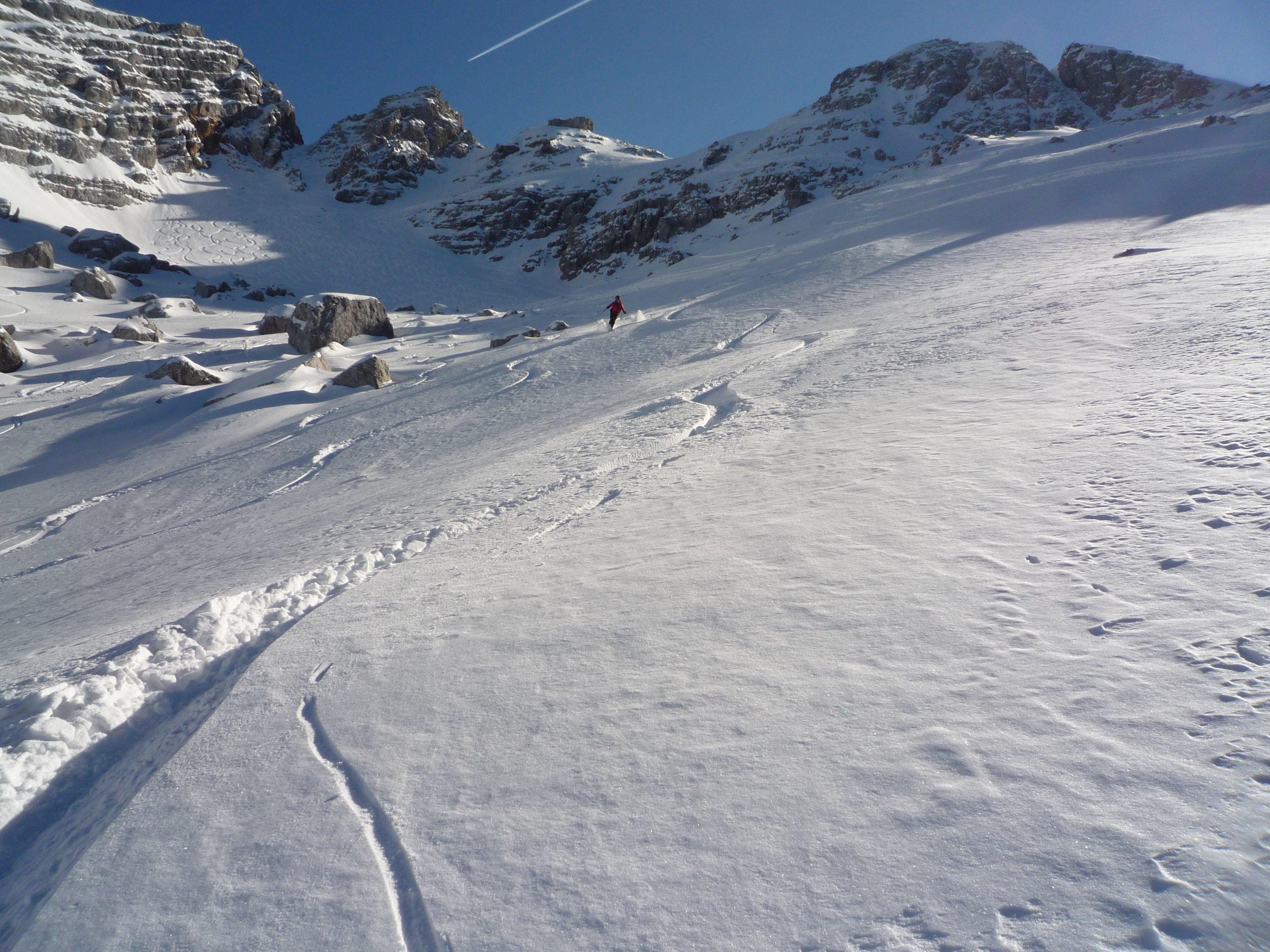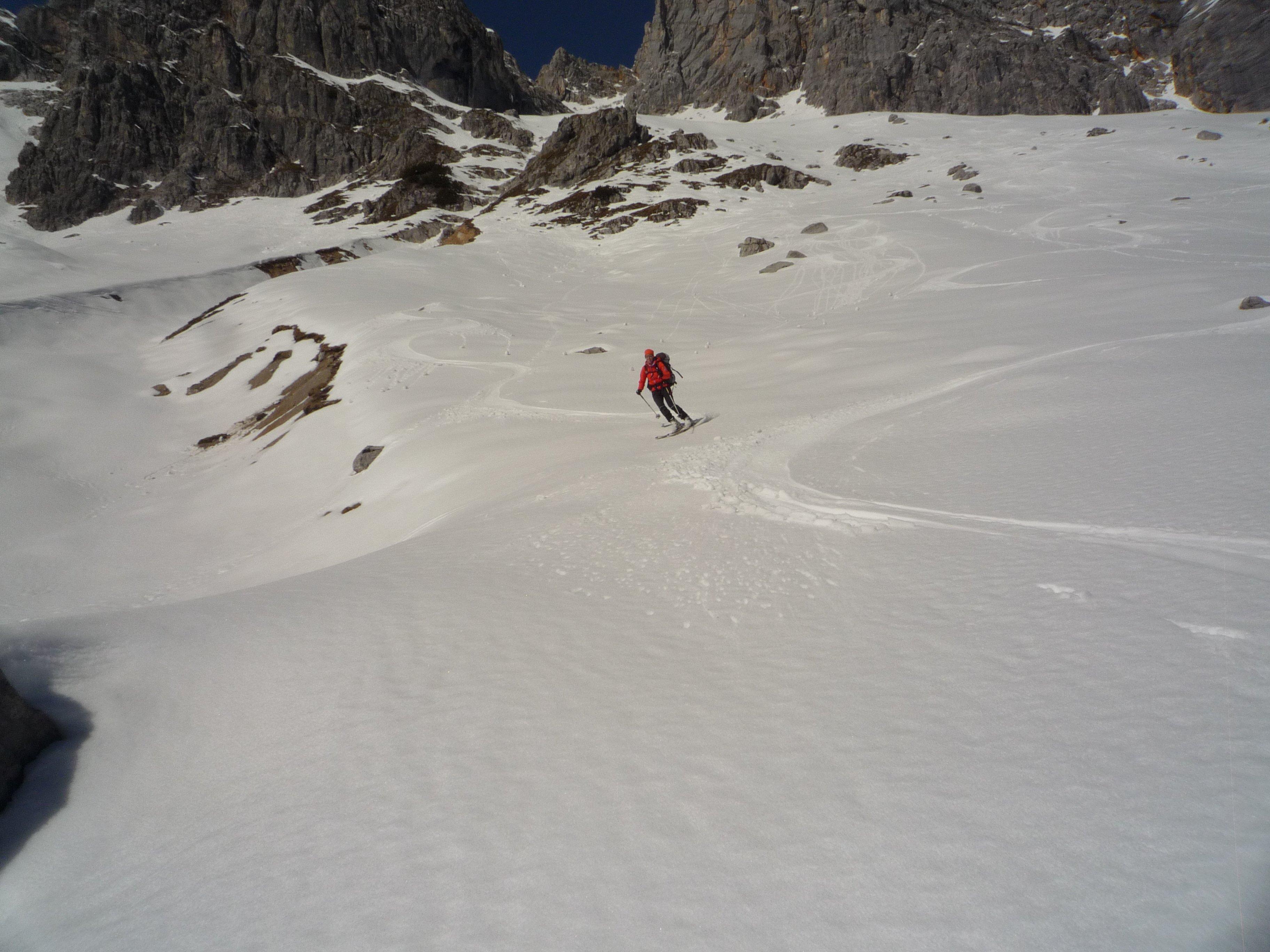 Frühjahrsklassiker in den Loferer Steinbergen, mit Ski vom PP weg in den Talschluß, dann 150 Hm Tragestrecke, untere Hänge pistenmäßig eingeschwungen, oben noch Platz für individuelle Spur möglich, Gipfelaufbau wieder Piste, Wehrgrubenjoch ebenfalls gespurt, Übergang Rotschartl unproblematisch(Grießelschnee auf Fels)Fellerer Sand mit perfekten Firn