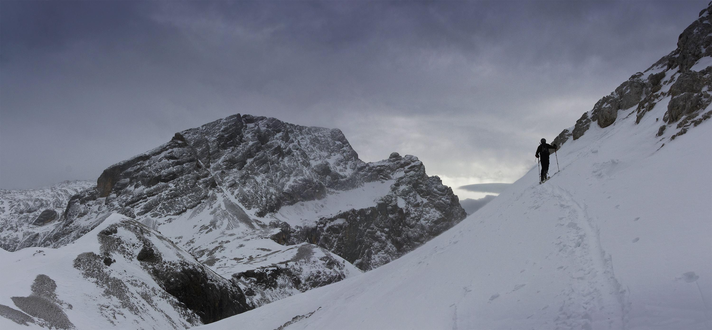 Der Schnee ist relativ weich bis auf die letzten beinharten Meter unter der Scharte.