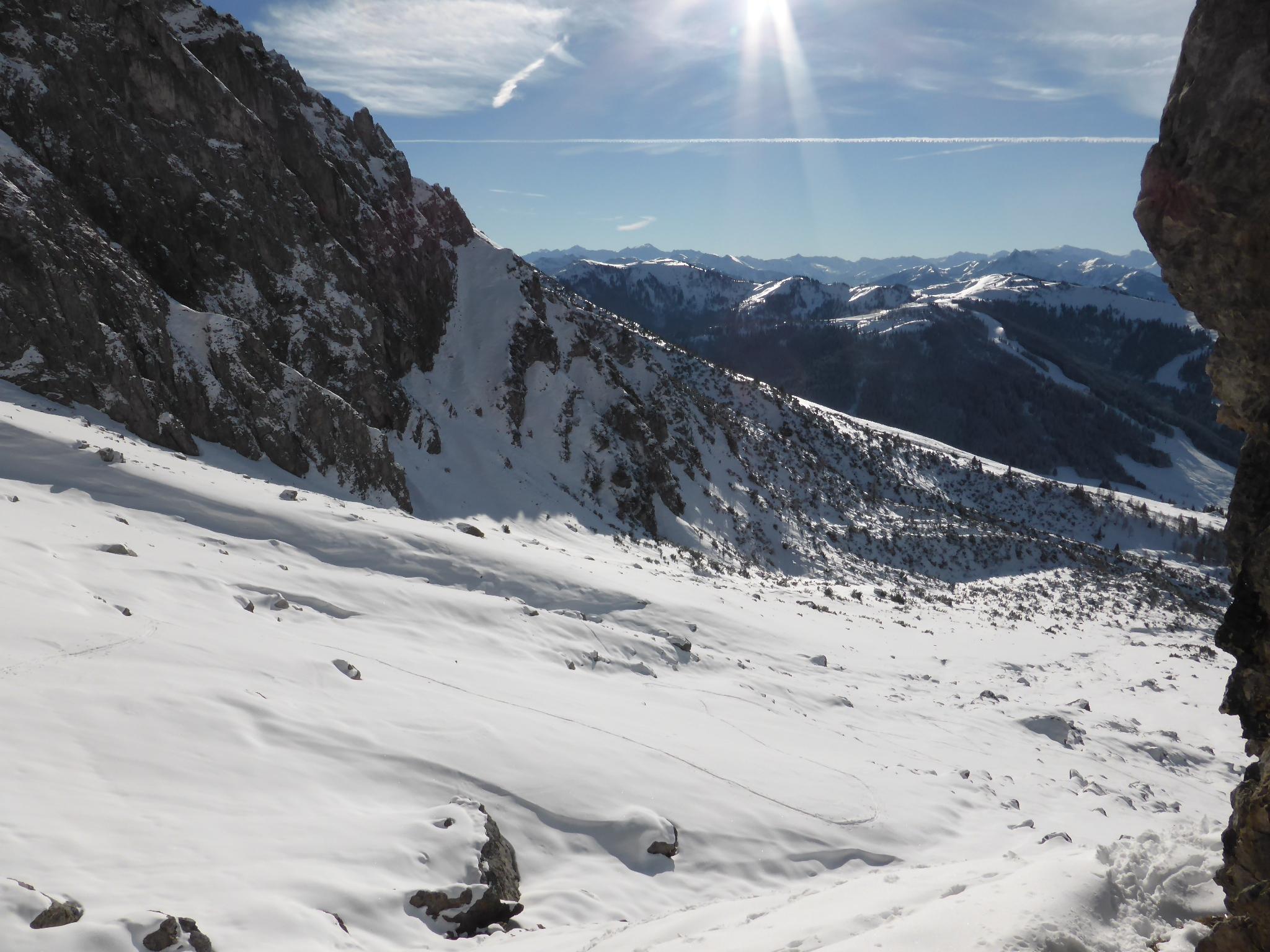 Sonniger Ausflug am Jahresende abseits des Trubels um die Taghaubenscharte. Ca. 5 cm Pulver, in der Sonne schon wieder weich auf hartem Untergrund. Mit viel Gespür und Glück ohne wesentlichen Steinkontakt ausgekommen.