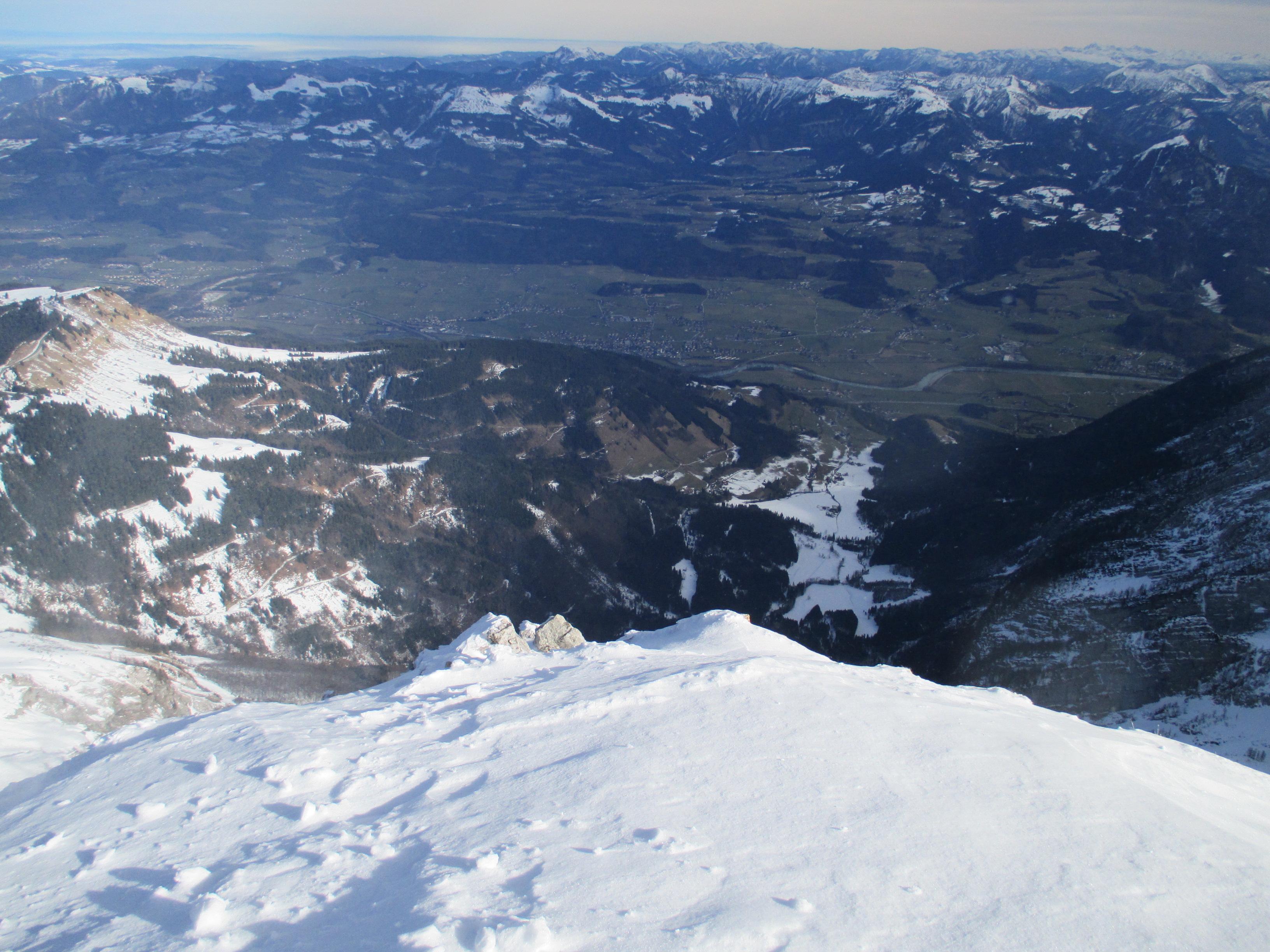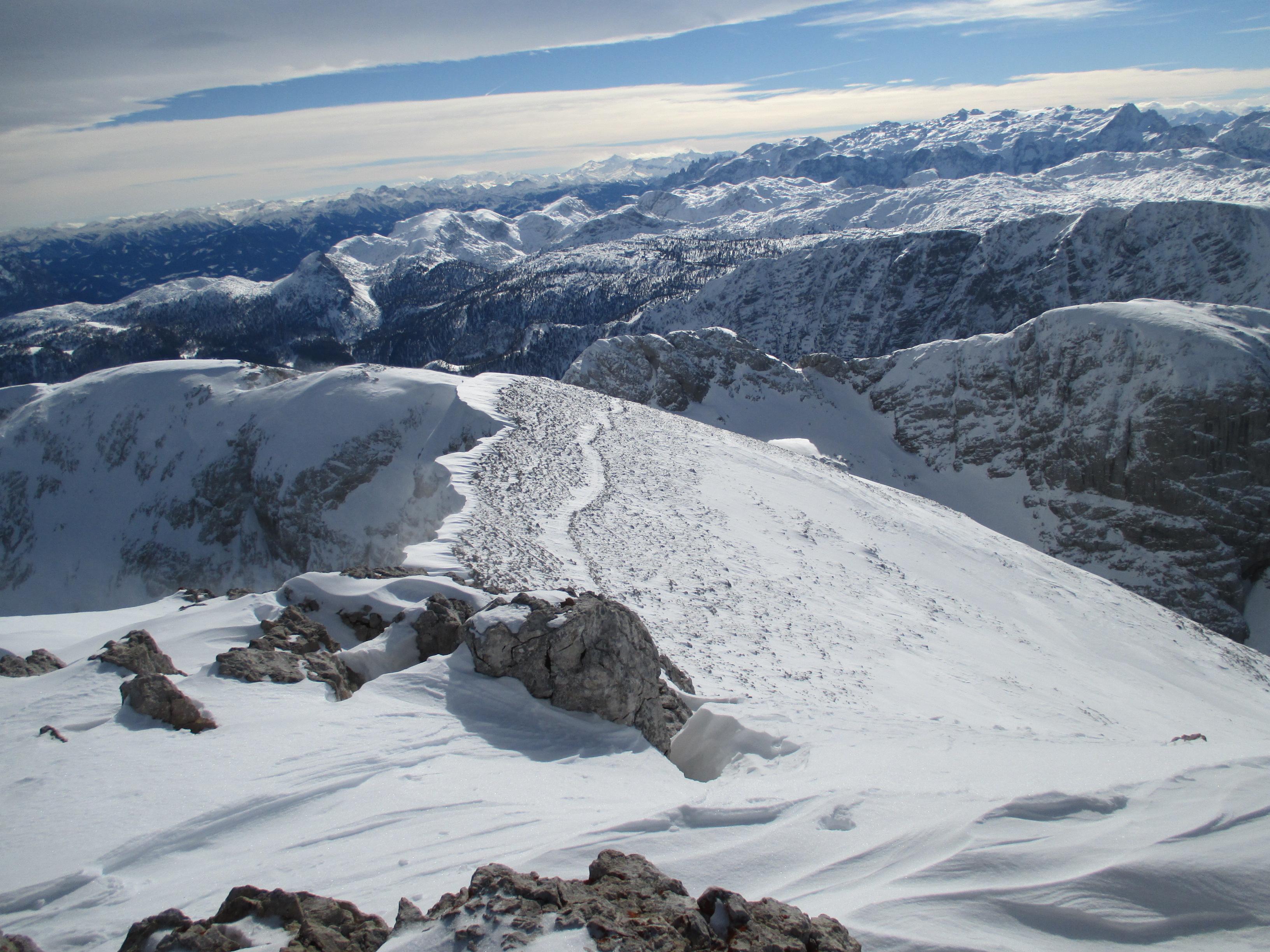 Schnee: unten angefeuchtet, ab Umgäng pulvrig mit starker Windverfrachtung, am Gipfel starker Föhnsturm.