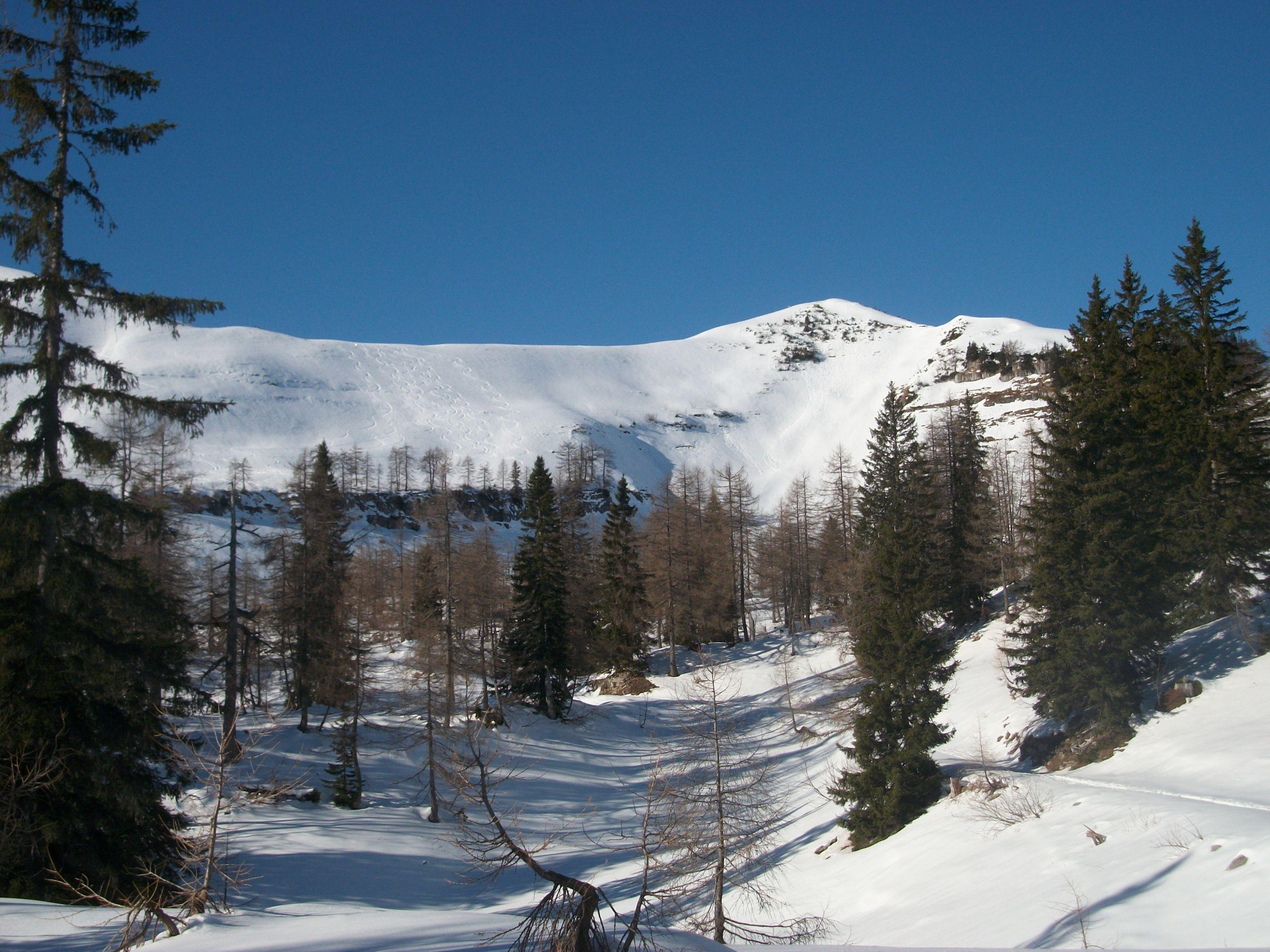 Lawineneinstufung "GERING" passt auch subjektiv im Gelände sehr gut. Die ganz wenigen Gefahrenstellen die es gibt, die findet man im eingewehten und extrem steilen NO-Hang. Ursache dort: Schwache Schichten im untersten Drittel der Schneedecke aus der Kältephase im November.