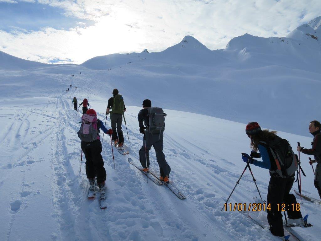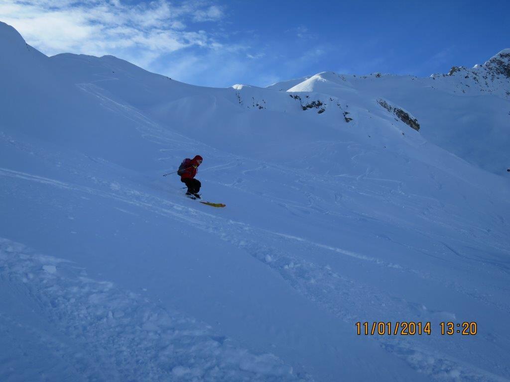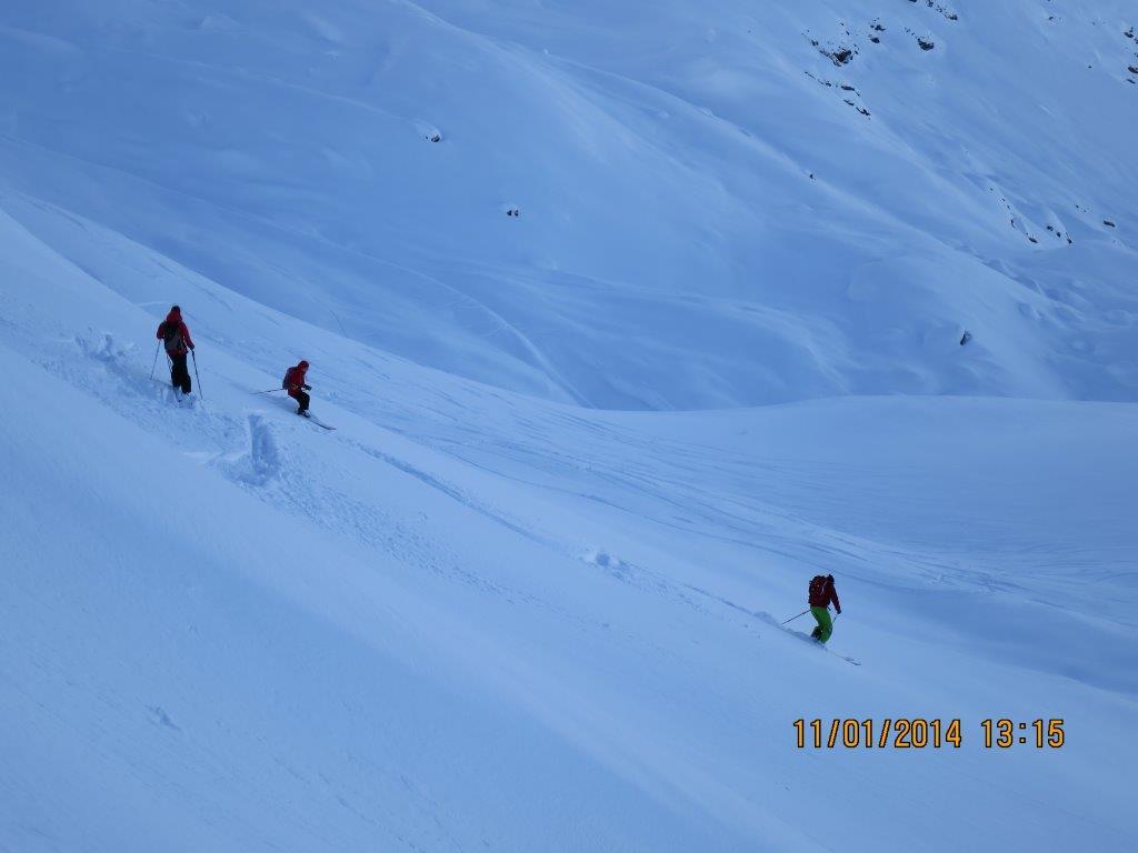 Dieser Hang war mit frisch verschneiten Nasschneerutschen übersät. Dieser Teil der Abfahrt erforderte Einiges von Mensch und Material..