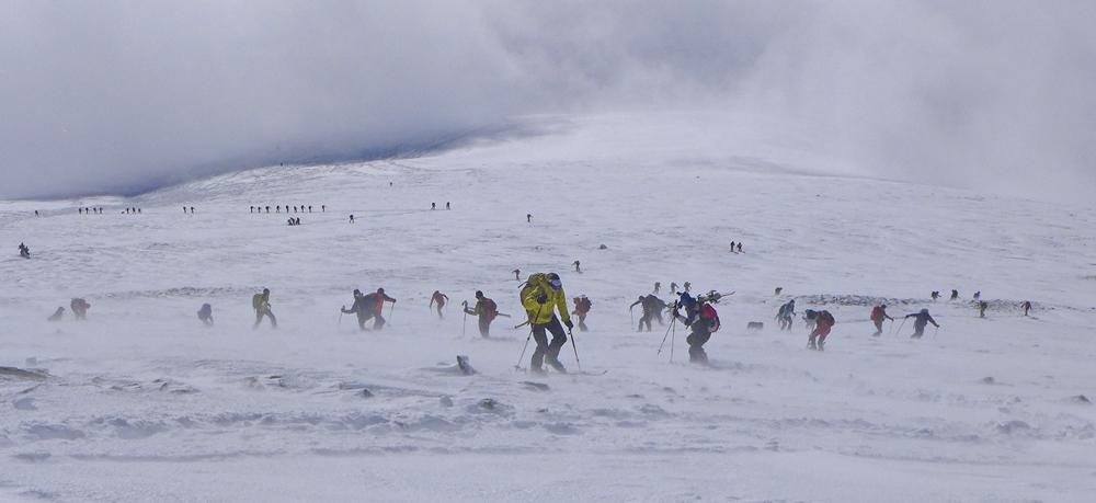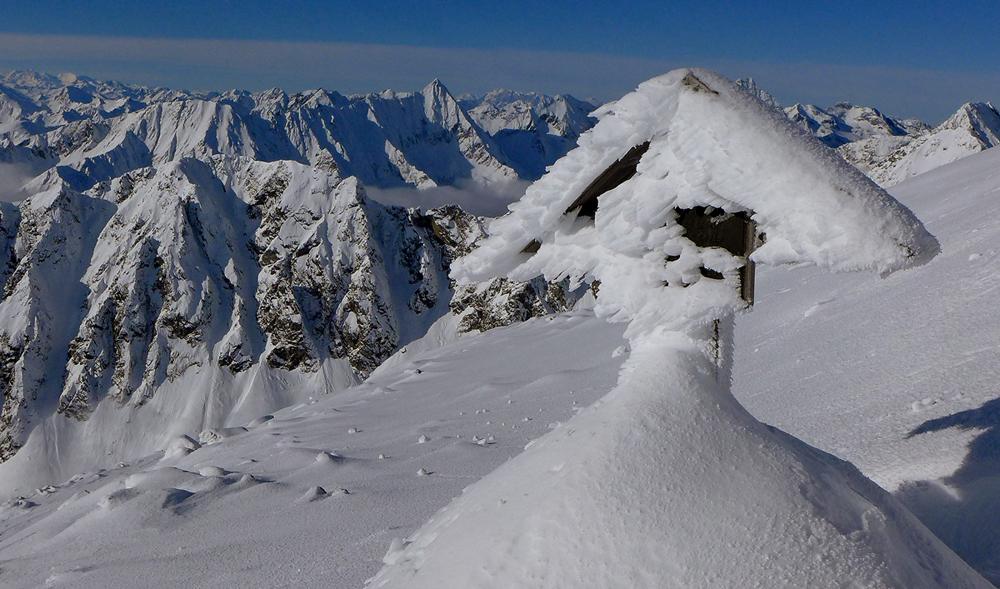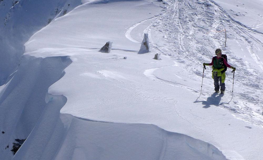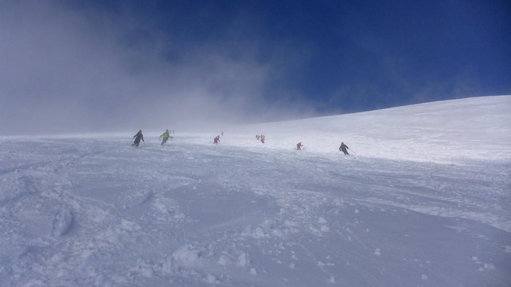 (1862m), der Großteil der Tourengeher aber abkürzend über mäßig bedeckten Waldweg. Anfangs sonnig, ab ca. 1900 m dichter Nebel der erst wieder ab ca. 2300 m von der Sonne abgelöst wird. Leider setzt hier der kalte, stürmische Westwind ein, die Spur des Vordermanns füllt sich im Nu, dazu kommt, dass, je mehr man sich dem Gipfel nähert, die Steine zum Problem werden; die Abfahrt erst nach einigen Metern Abstieg möglich; starke Schneeverfrachtung.