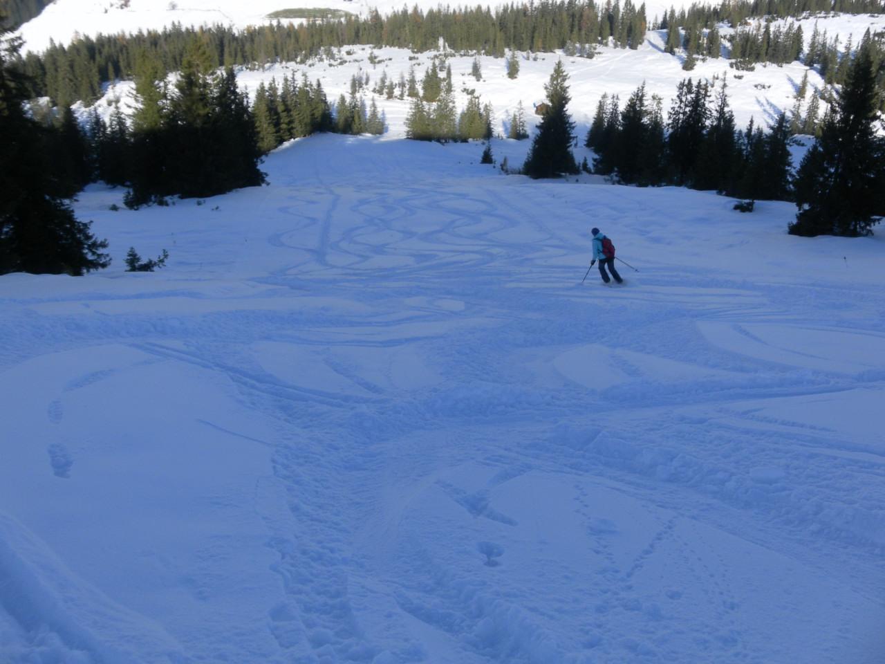 Knapp 10cm trockener Pulverschnee nordseitig ab Arthurhaus. Im freien Gelände ist der spärliche Untergrund ungleich gesetzt, daher unharmonische Einsinktiefen. Der lockere Pulver auf den schwach vorgewalzten Pisten bringt erste Abfahrtsfreuden.
