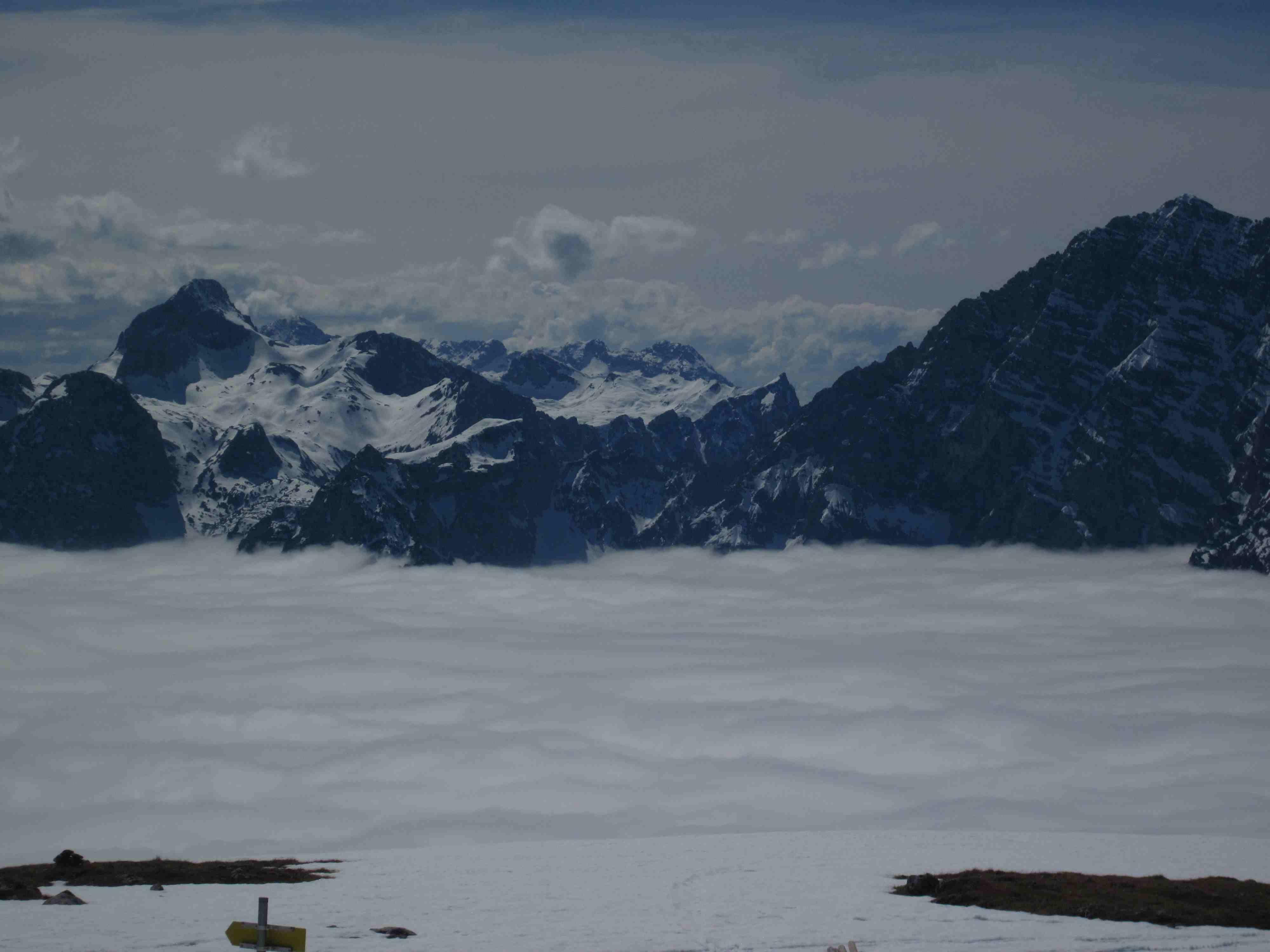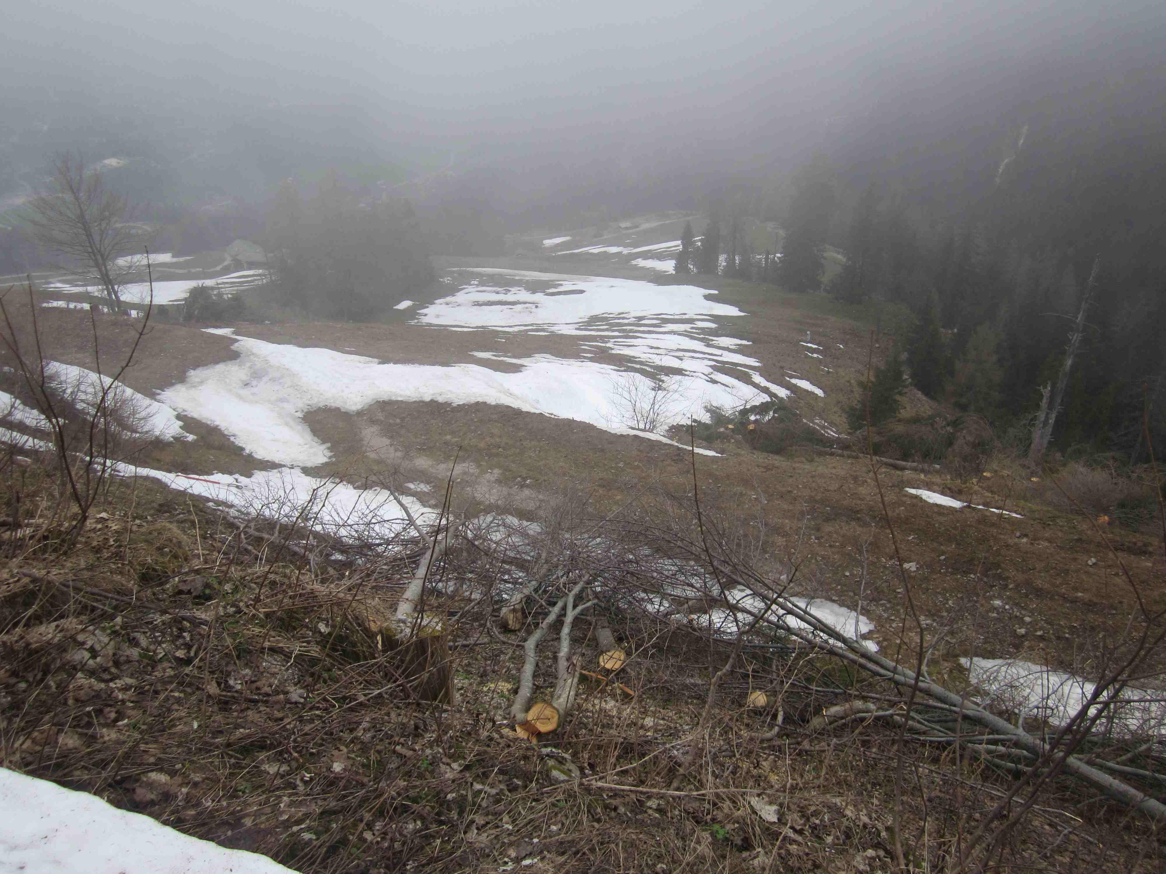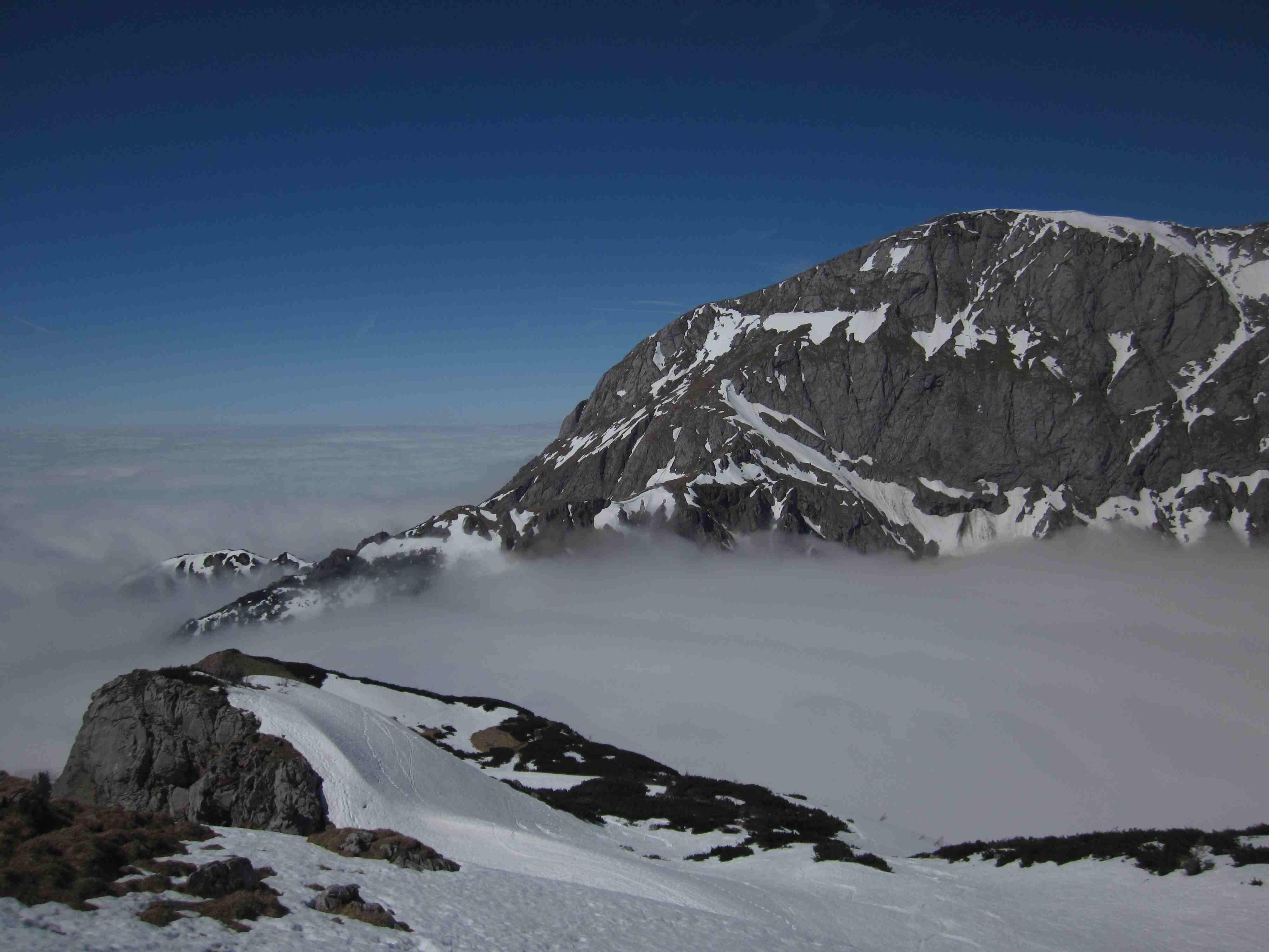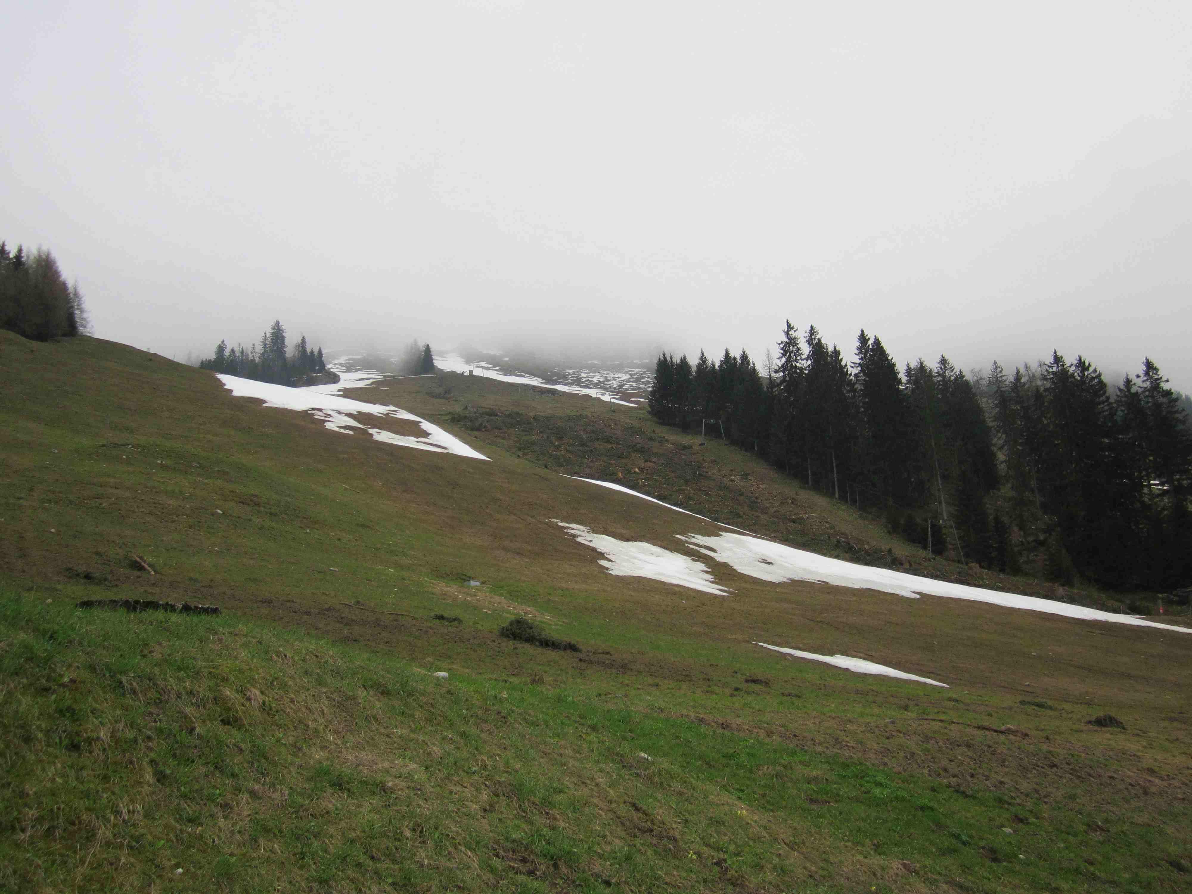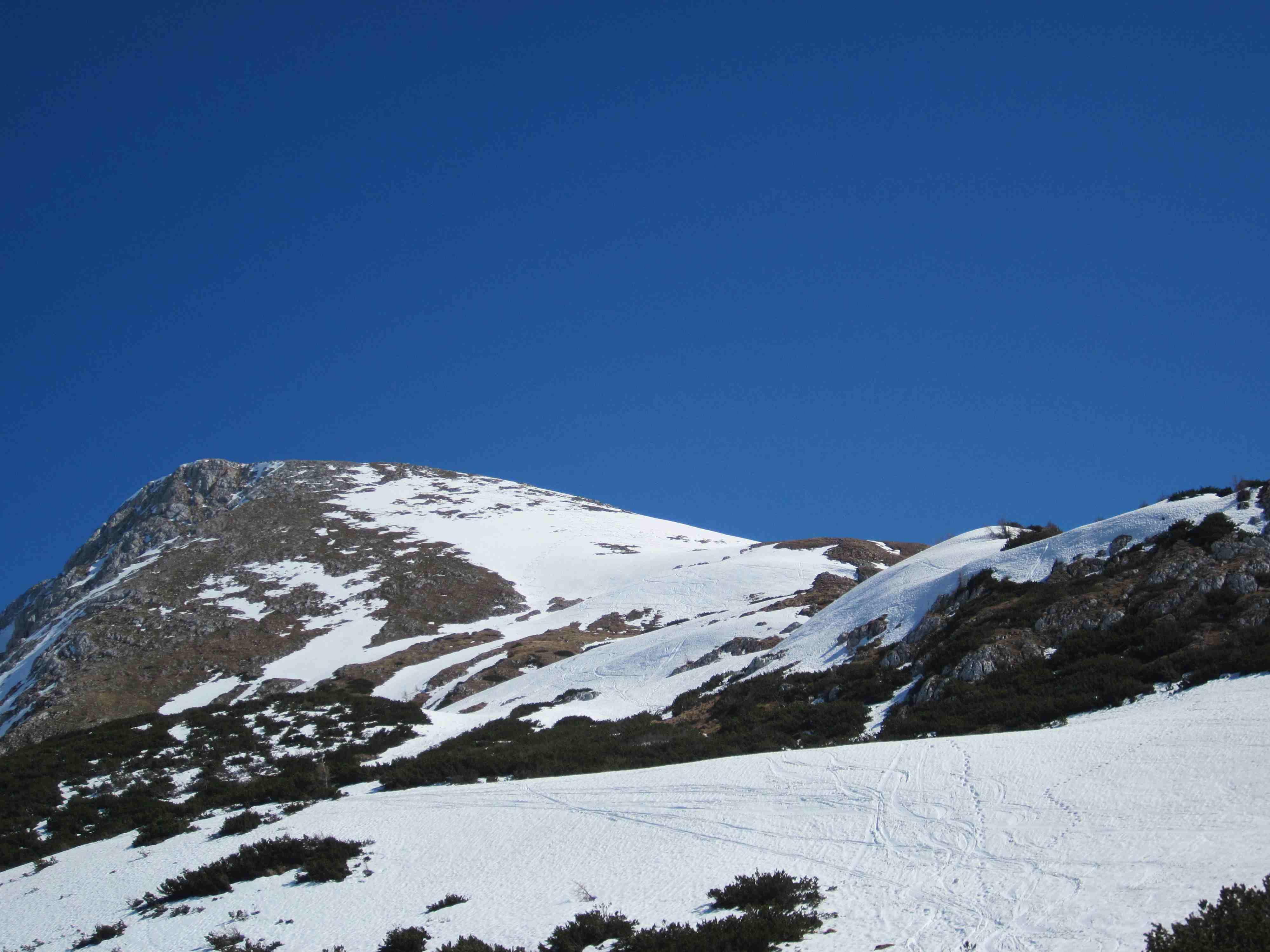 Auf den Jennerwiesen nur noch Reste, danach immer wieder apere Stellen. Am Gipfel überwiegen auch bald Gras und Felsen.