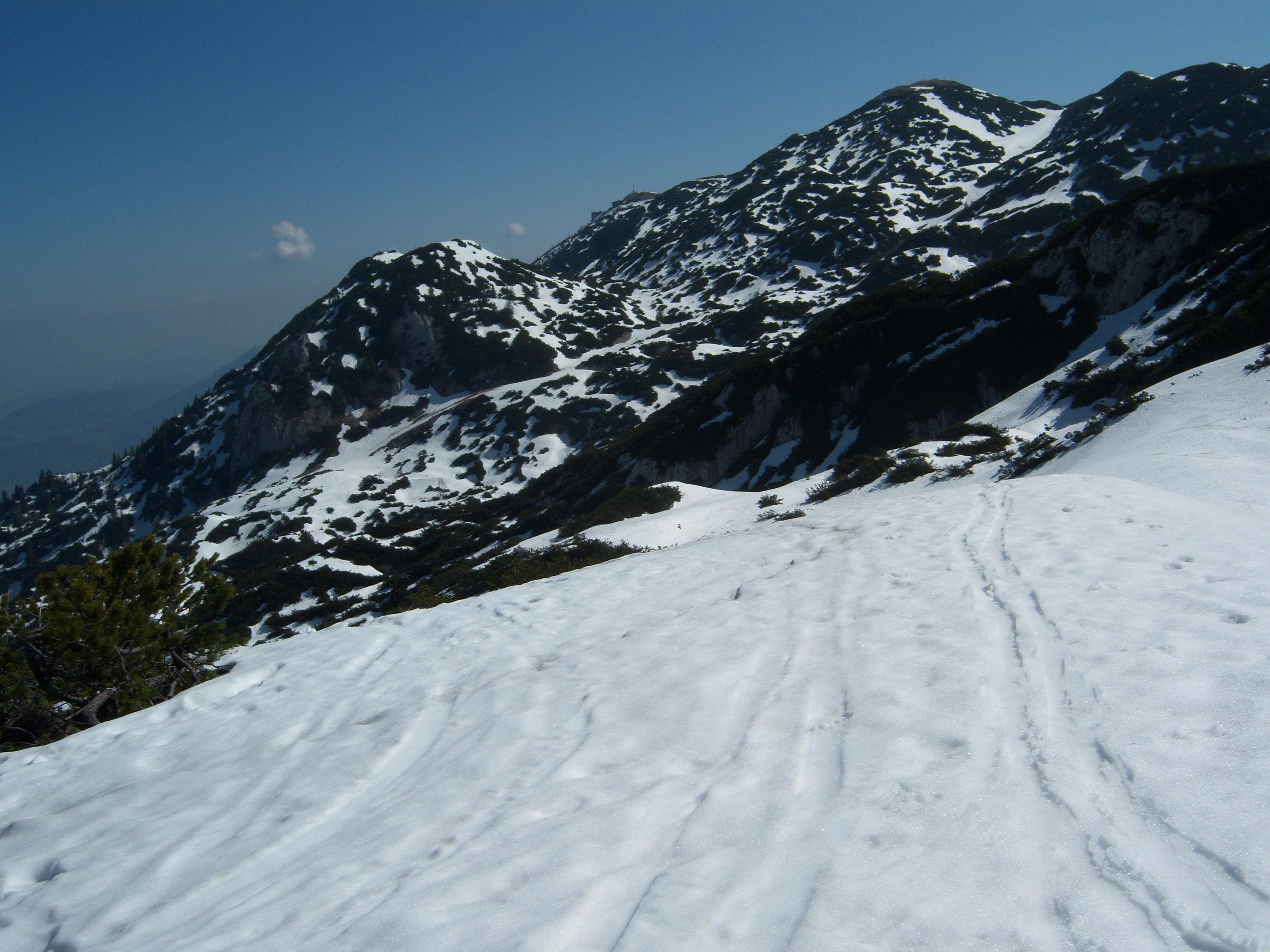 Kleine Untersbergrunde am Plateau Richtung Mitterberg. Oben noch genügend Schnee, bei der Abfahrt zur Schwaigmühl schauen schon ziemlich viel Latschen heraus. Schwacher Harsch, bricht bei Erwärmung